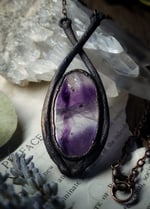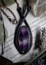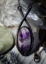 A pair of real preserved rib bones from a domestic black cat holds an extra large oval purple and translucent fluorite crystal.