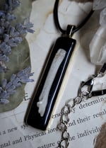 Pendant measures 60 mm x 12 mm and comes on a black waxed cord necklace in 18 inch length.