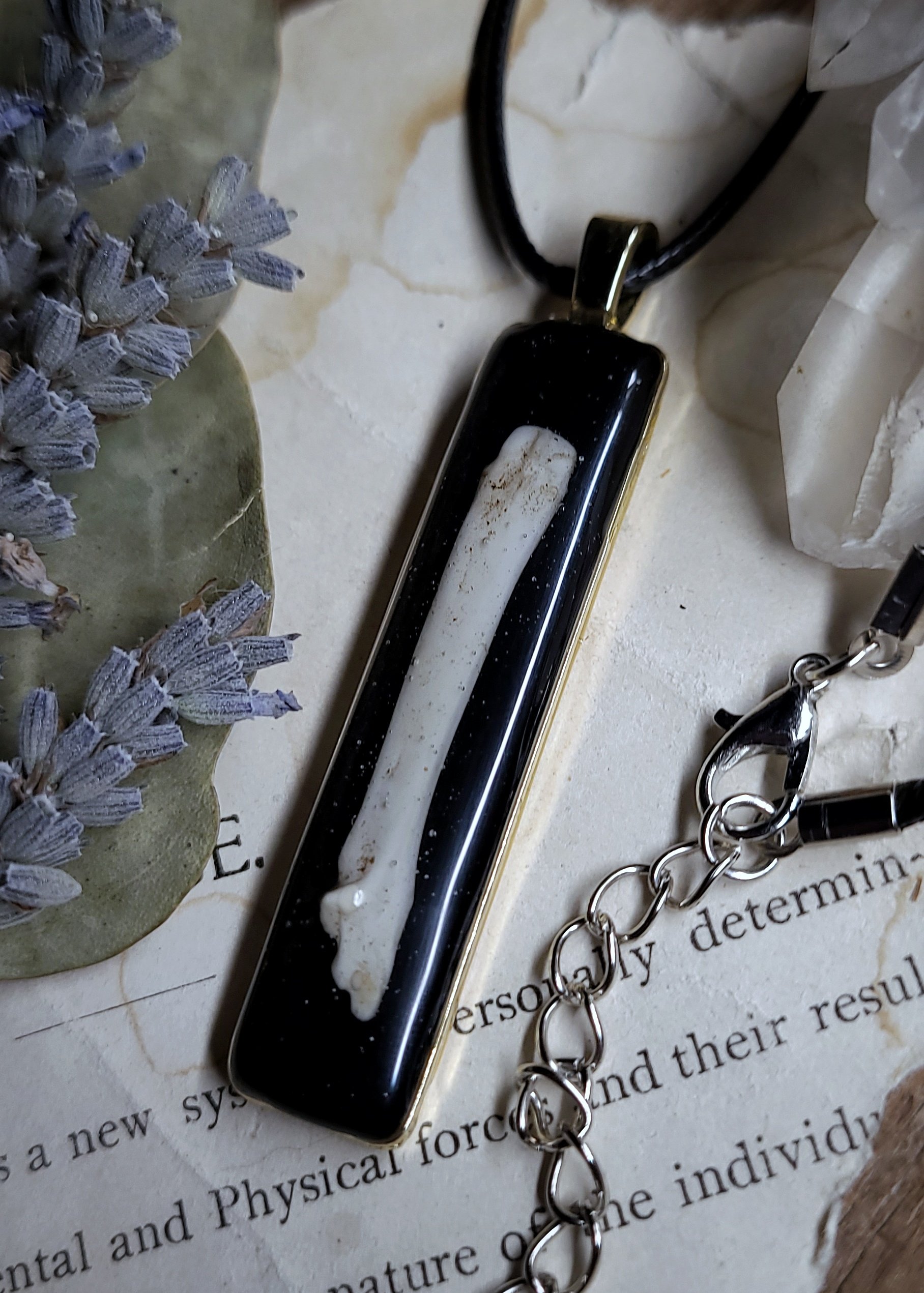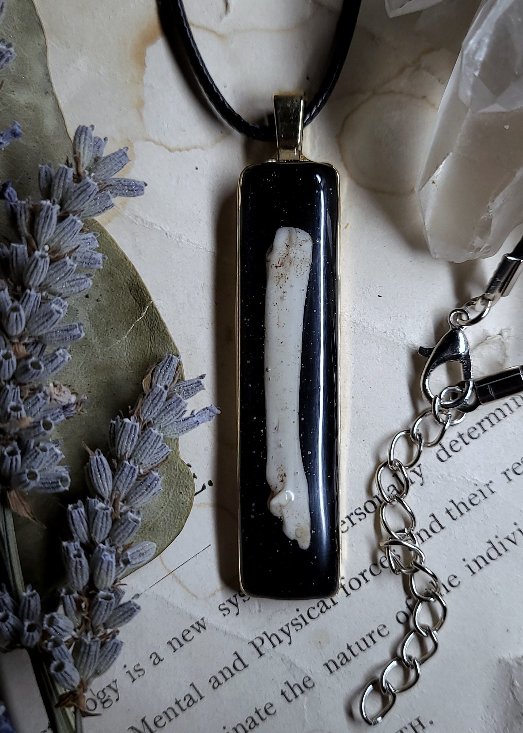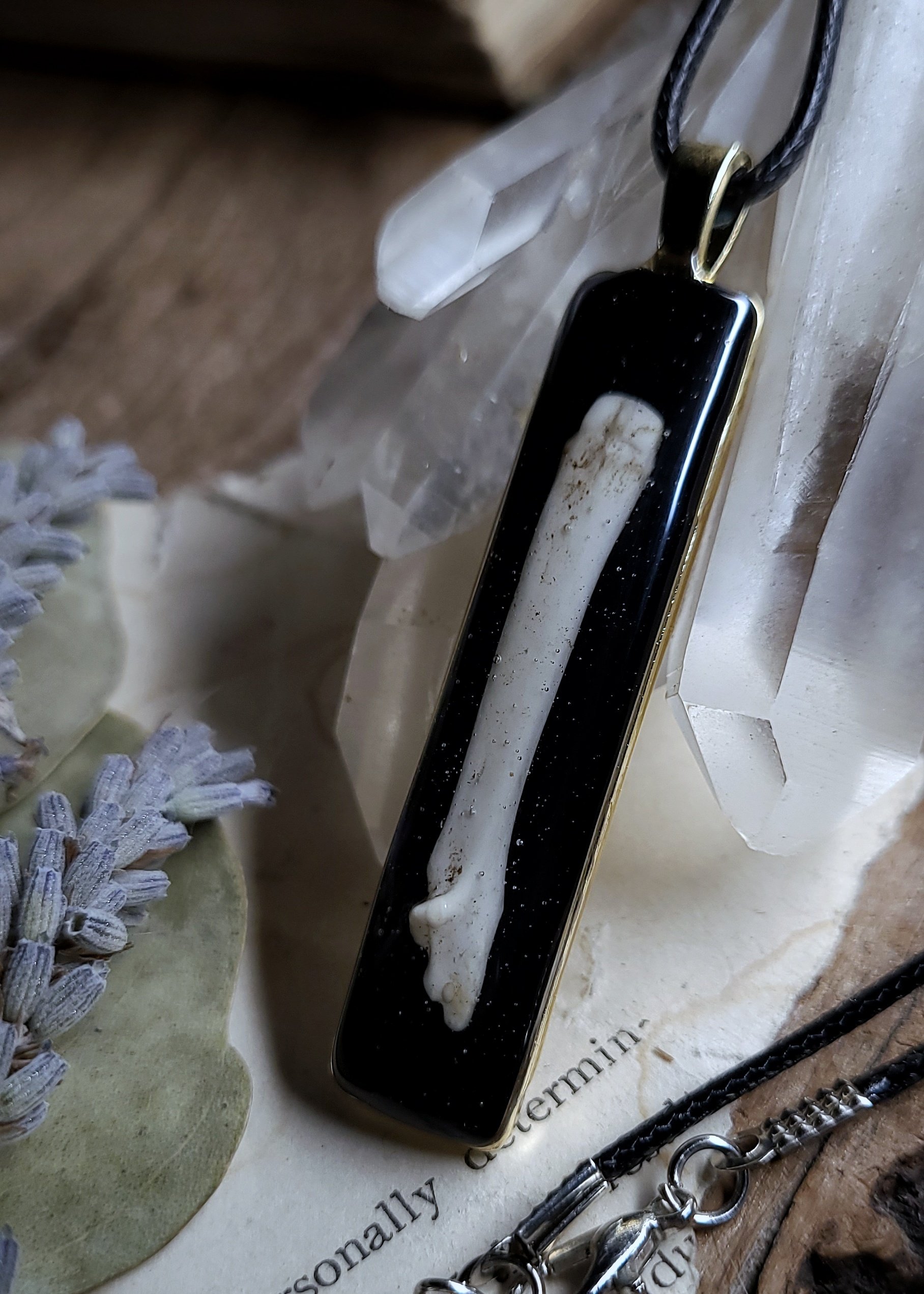 A single raccoon bone sealed under clear resin on a shiny black background inside of a golden brass pendant.