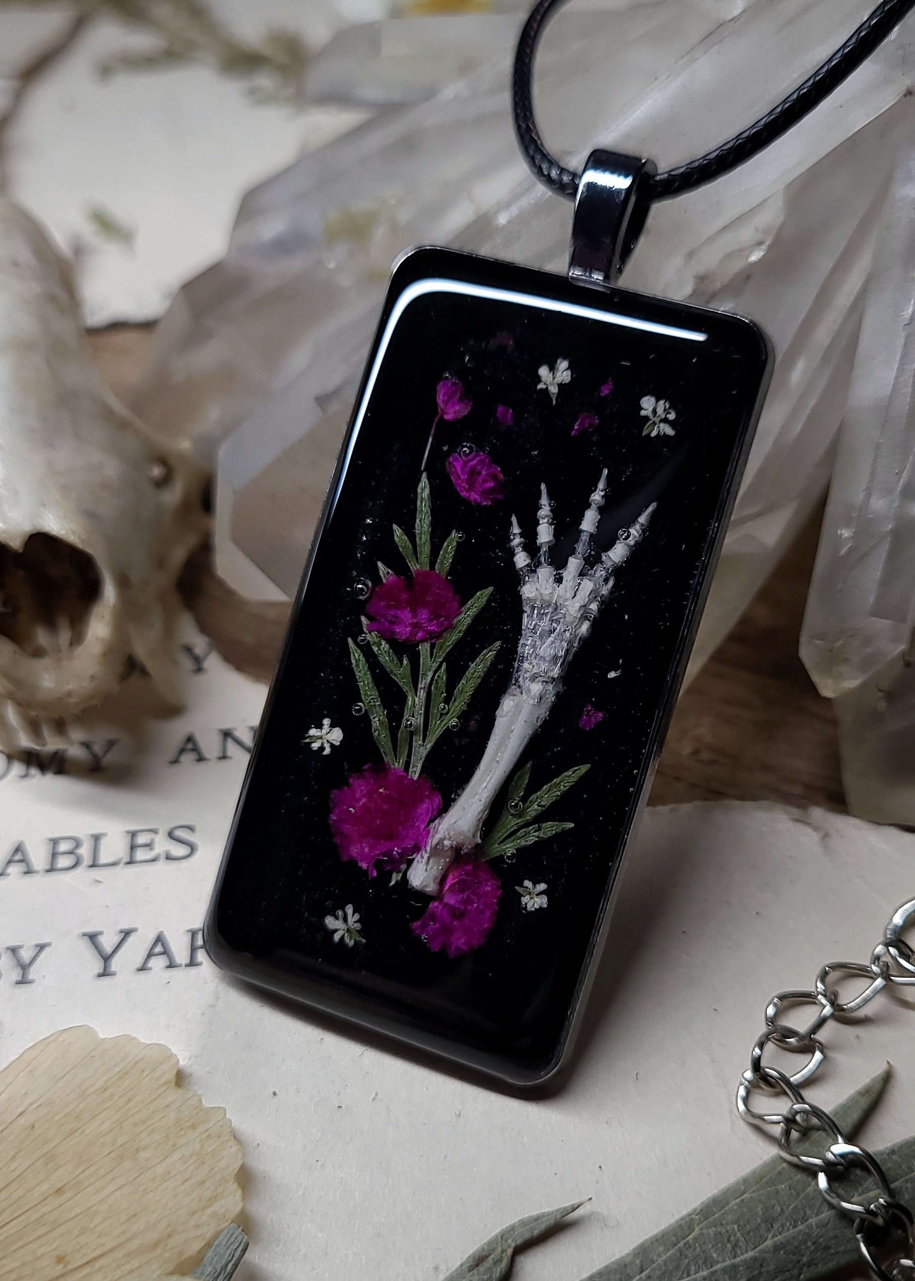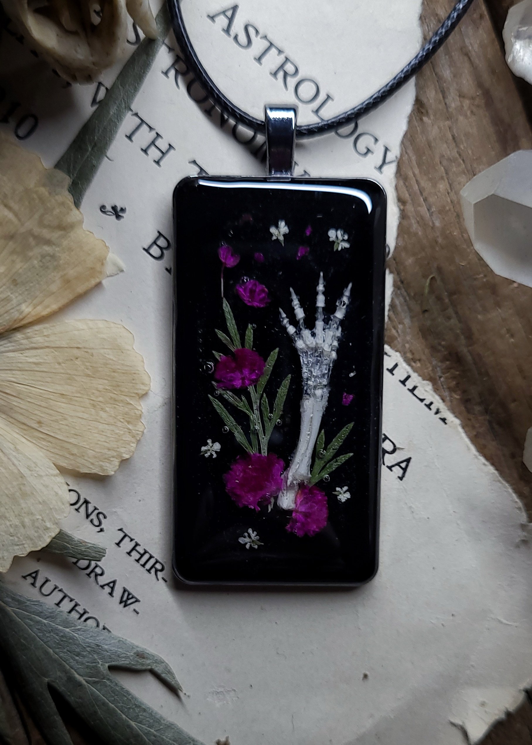 A tiny skeletal baby rabbit arm, foot, and claws with dried wildflowers is sealed in clear resin on a shiny black background and framed in large rectangle silver brass charm pendant.