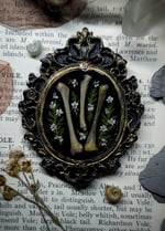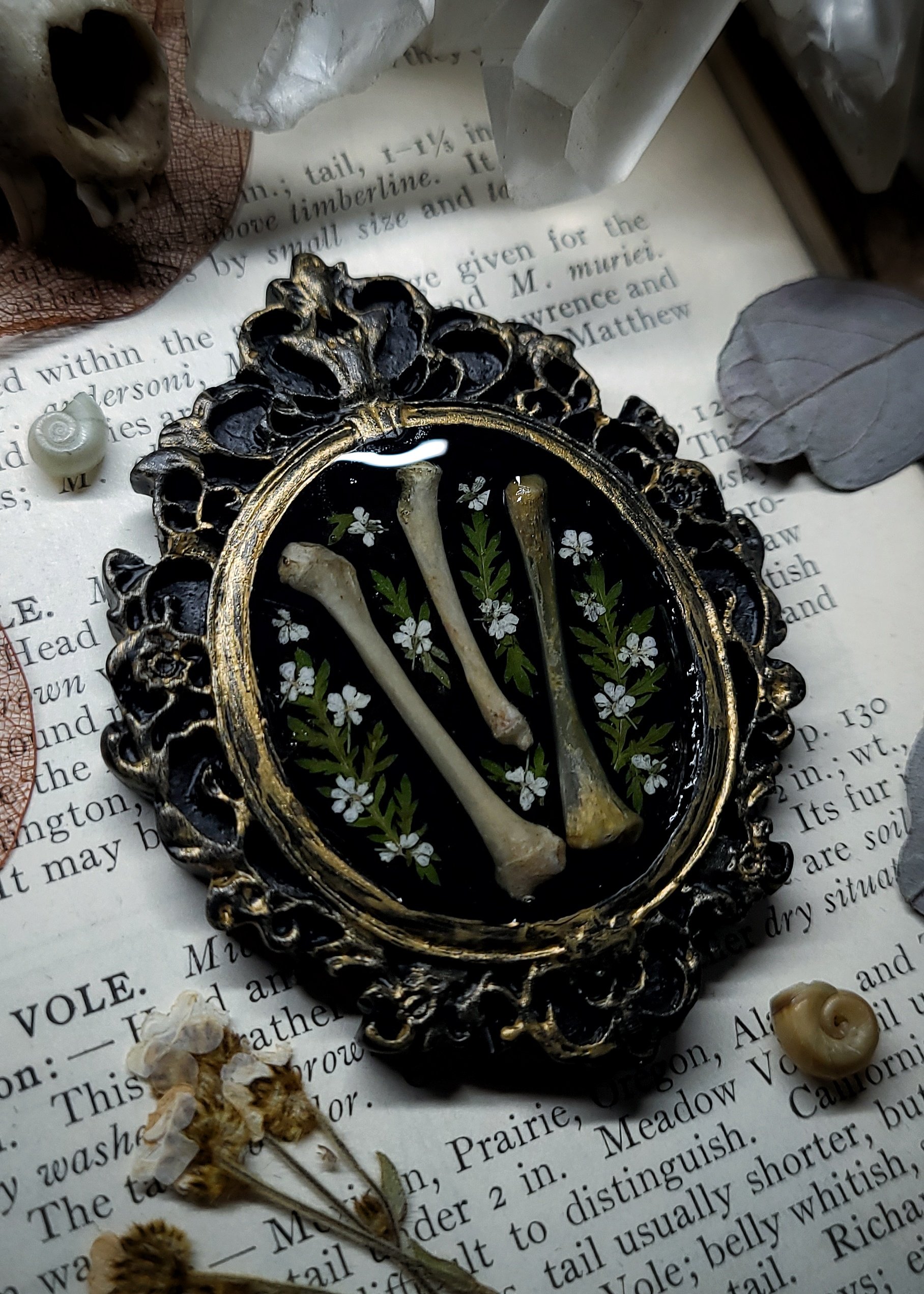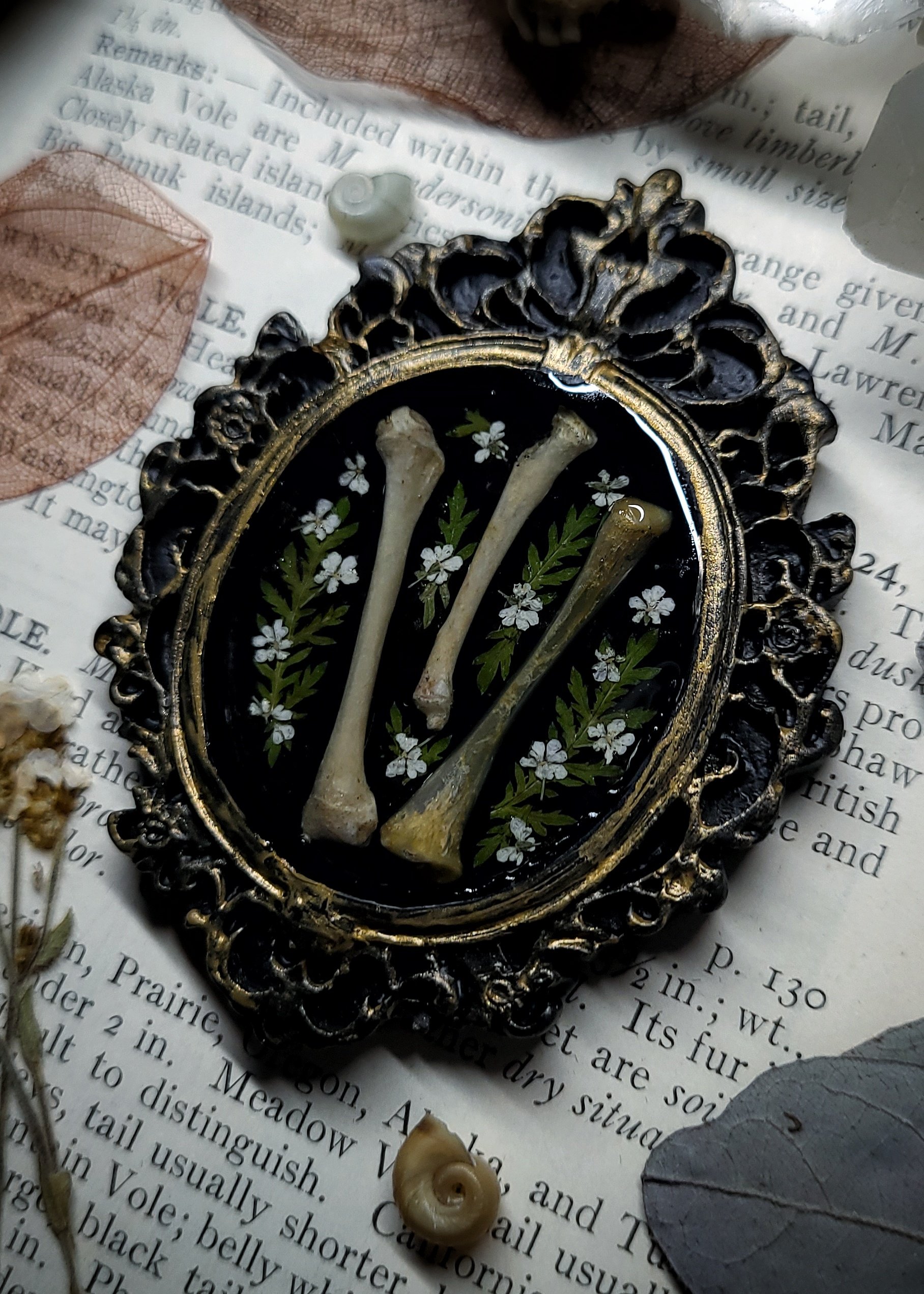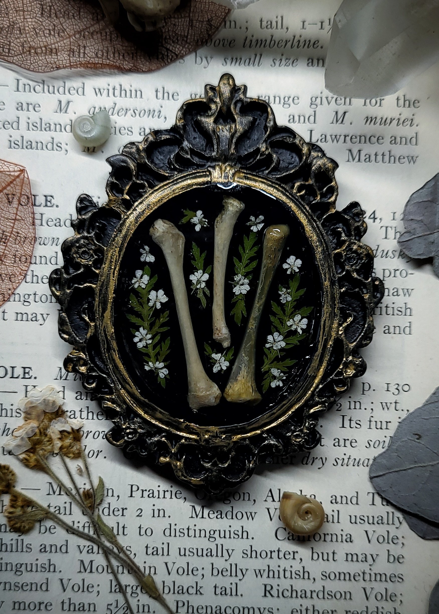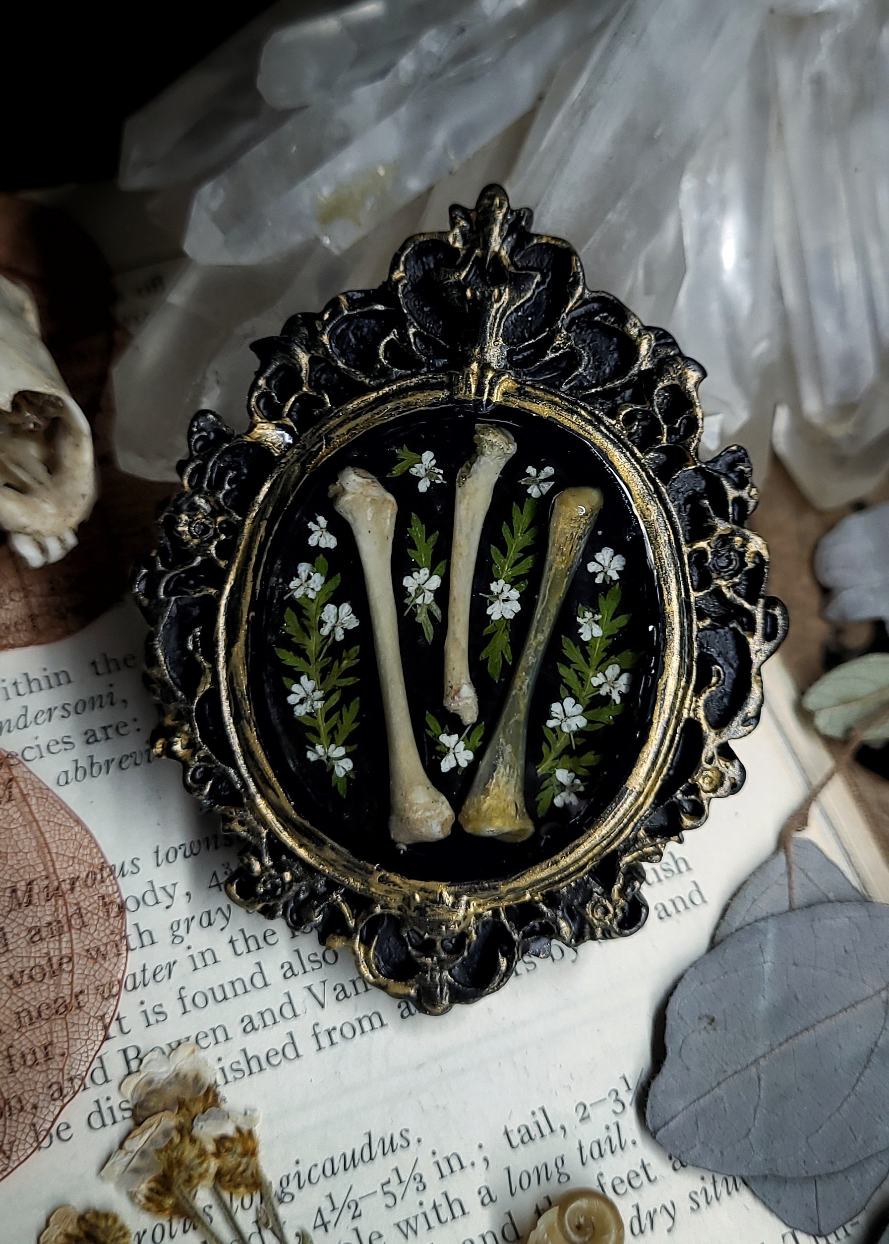 A small trio of rabbit bones on a black background with a dried pressed wildflowers and ferns, sealed under clear resin in a vintage rustic miniature wall frame in black and dark brushed gold.