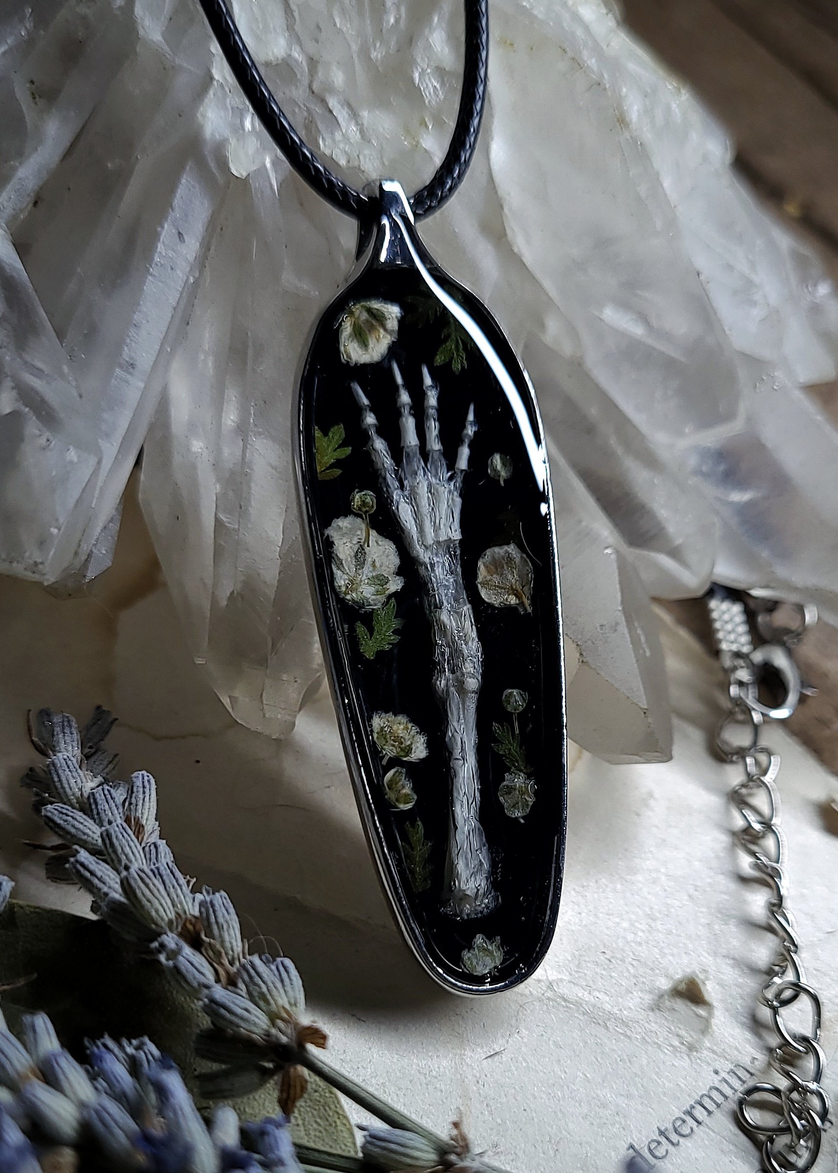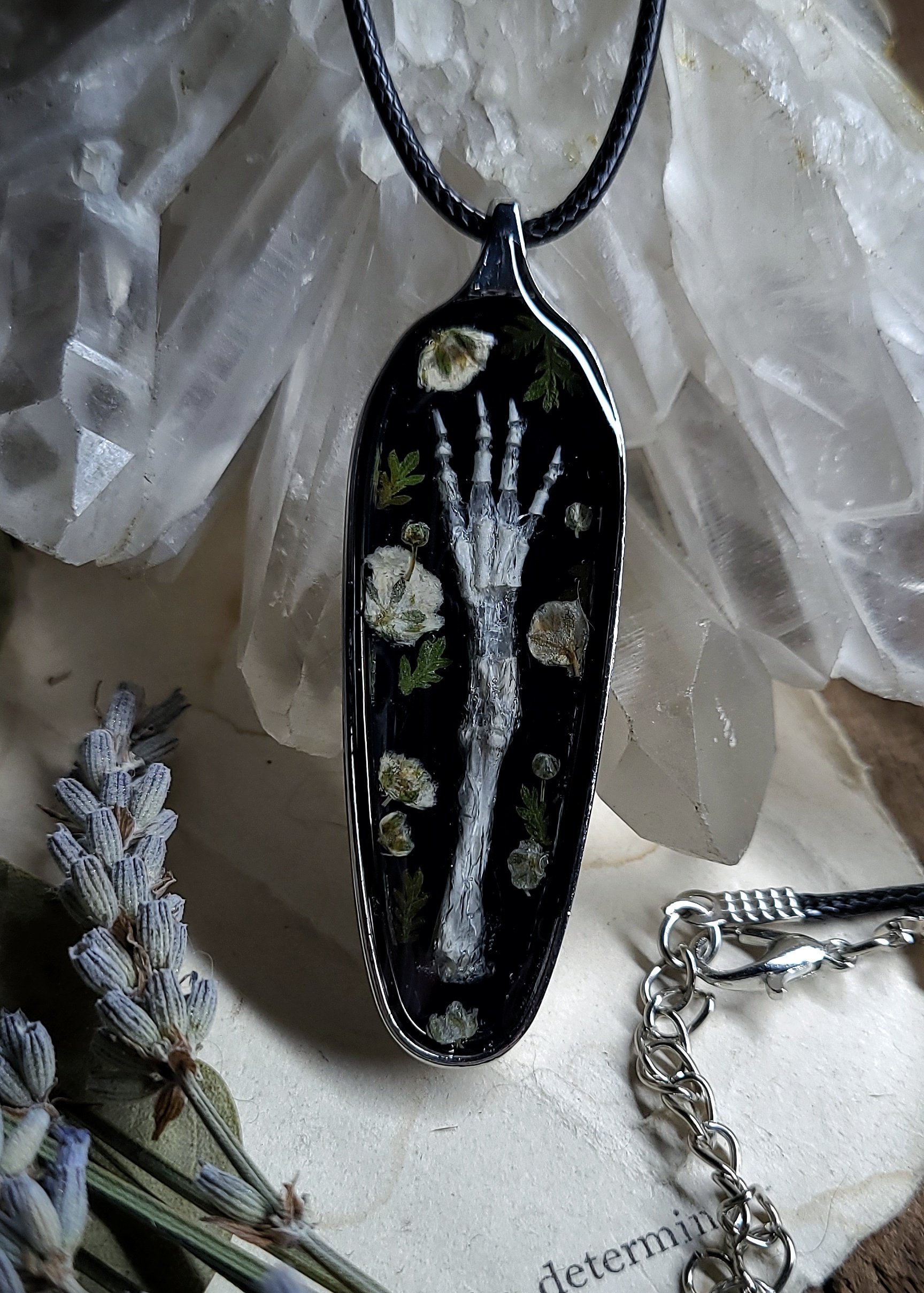 A tiny skeletal fetal rabbit foot is sealed under clear resin inside of a deep shadowbox style silver brass pendant on a shiny black background with white wildflowers.