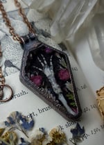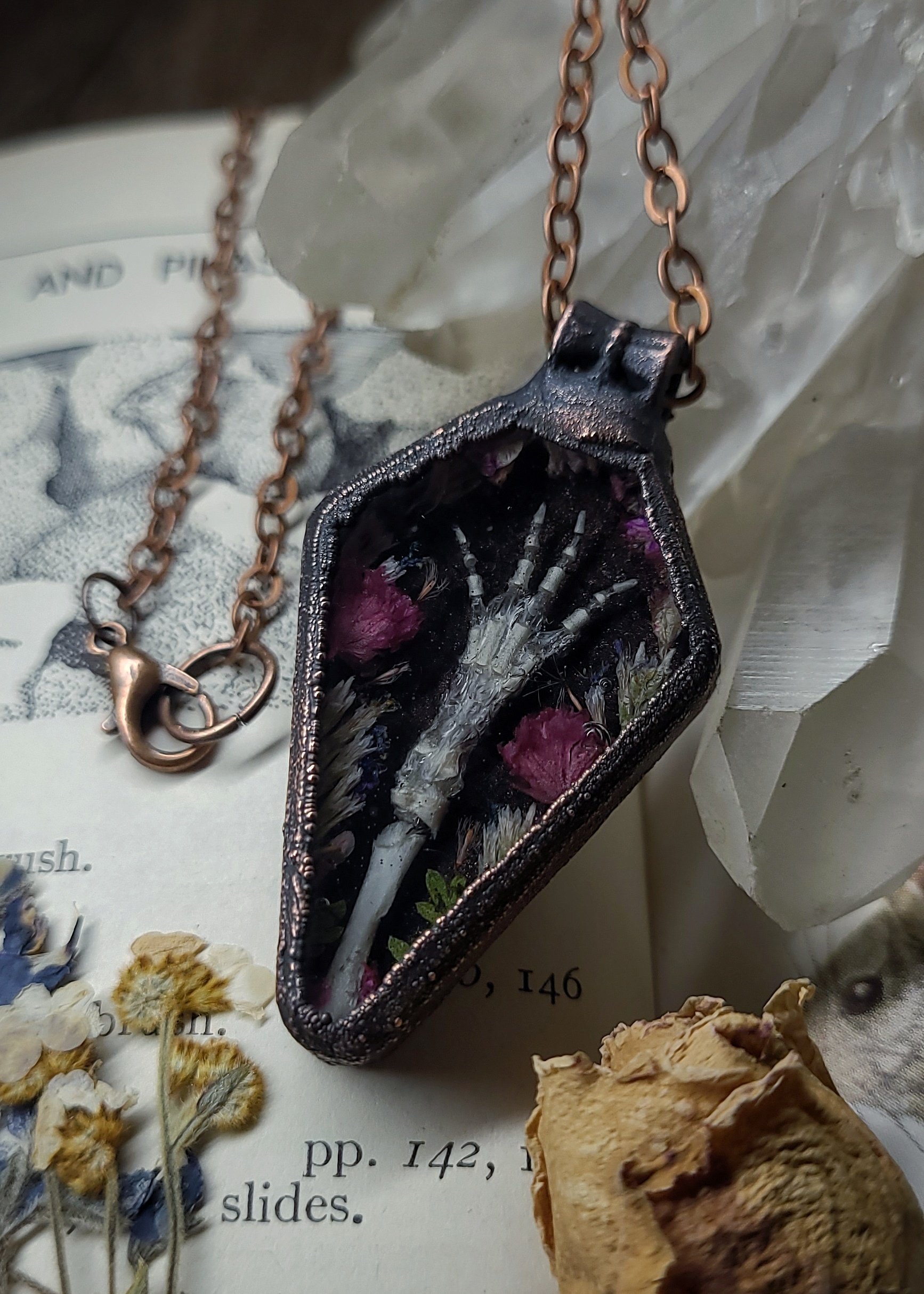 A preserved skeletal bunny foot is sealed in clear resin with dried pink wildflowers and framed in thick and textured oxidized copper to last a lifetime.