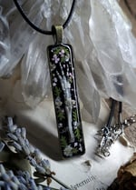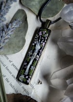 Pendant measures 60 mm x 12 mm and comes on a black waxed cord necklace in 18 inch length.