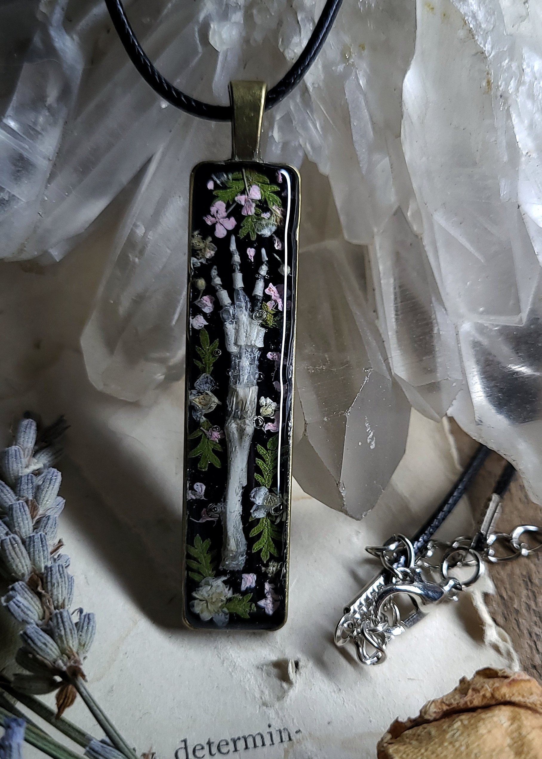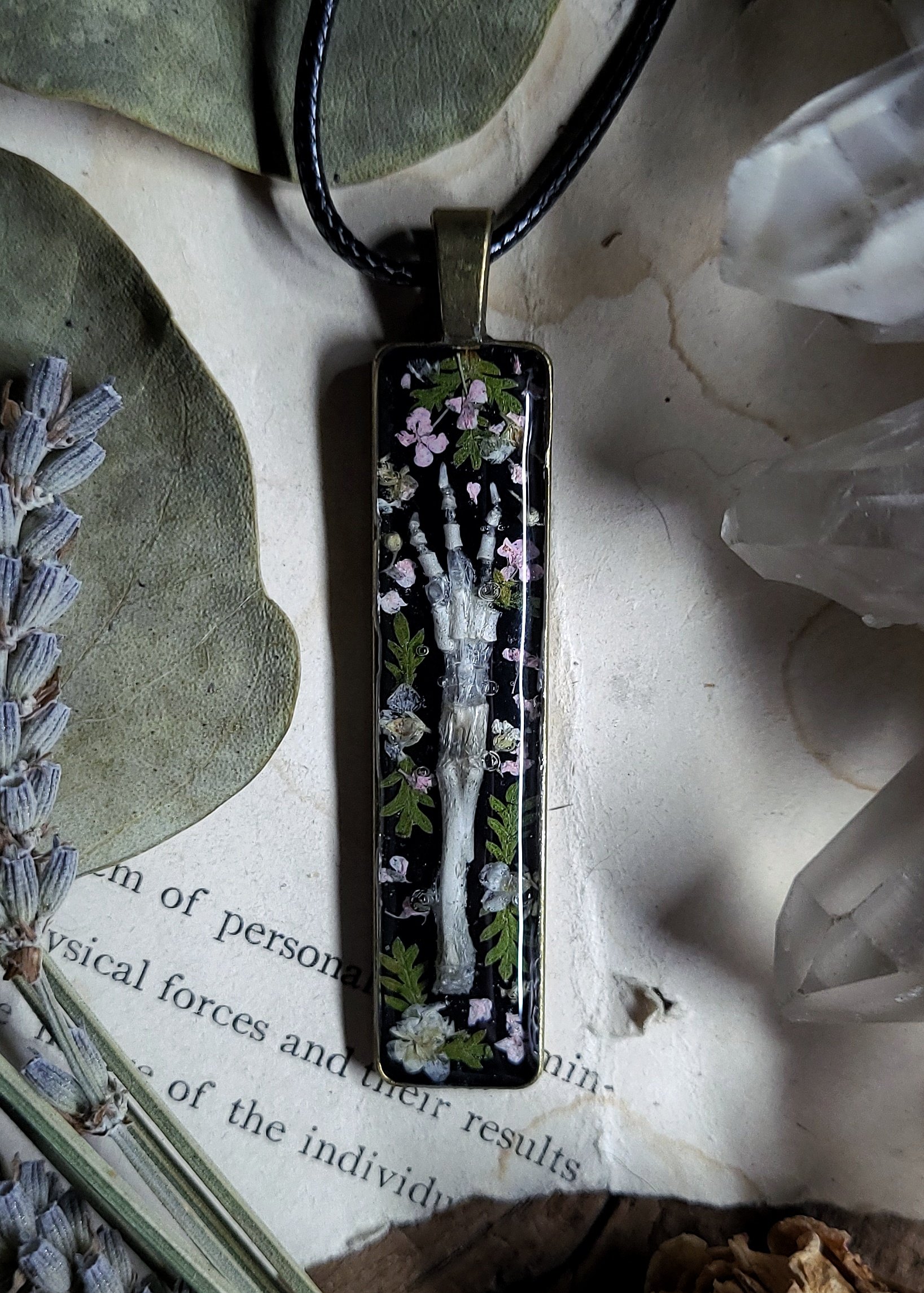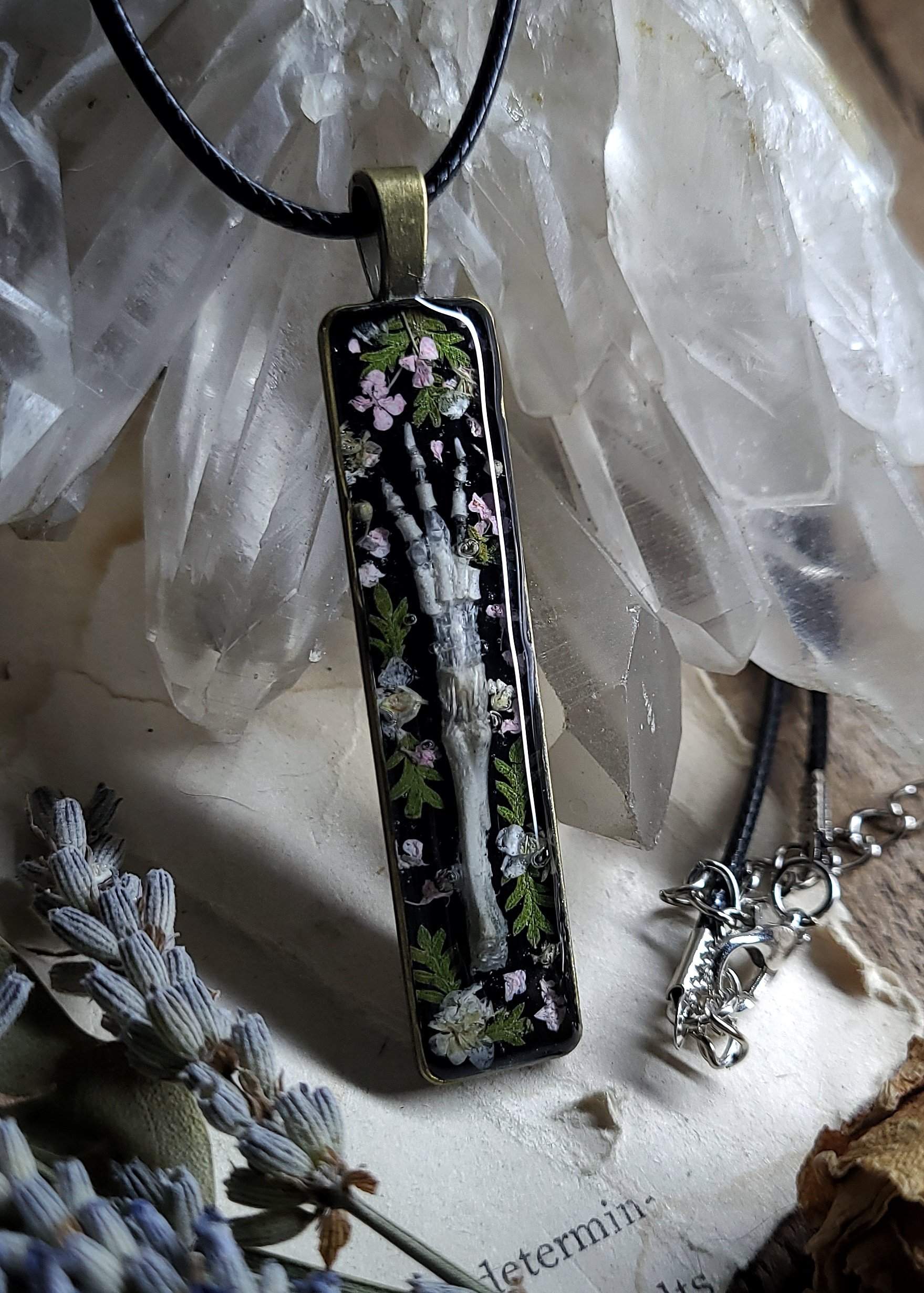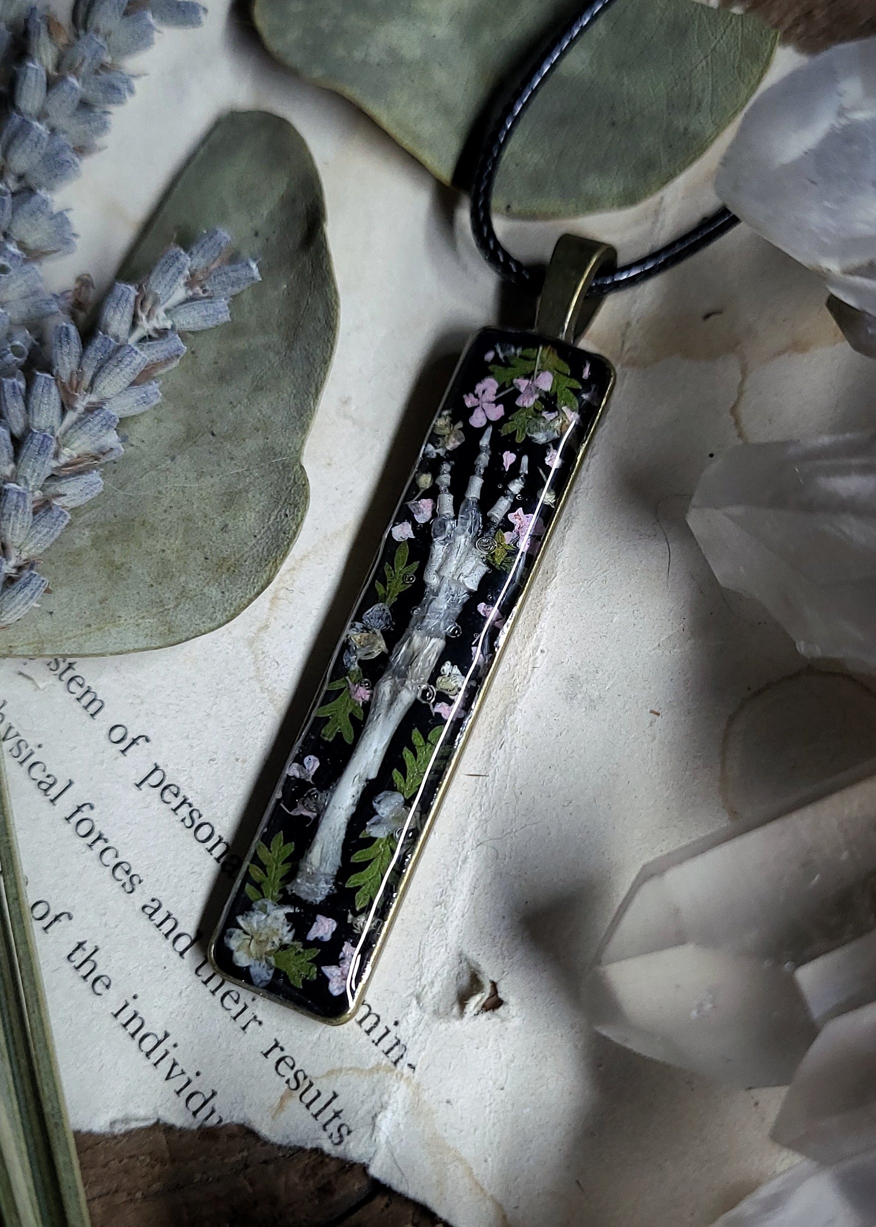 A tiny skeletal fetal rabbit foot and pink wildflowers are sealed under domed resin inside a bronze brass pendant.