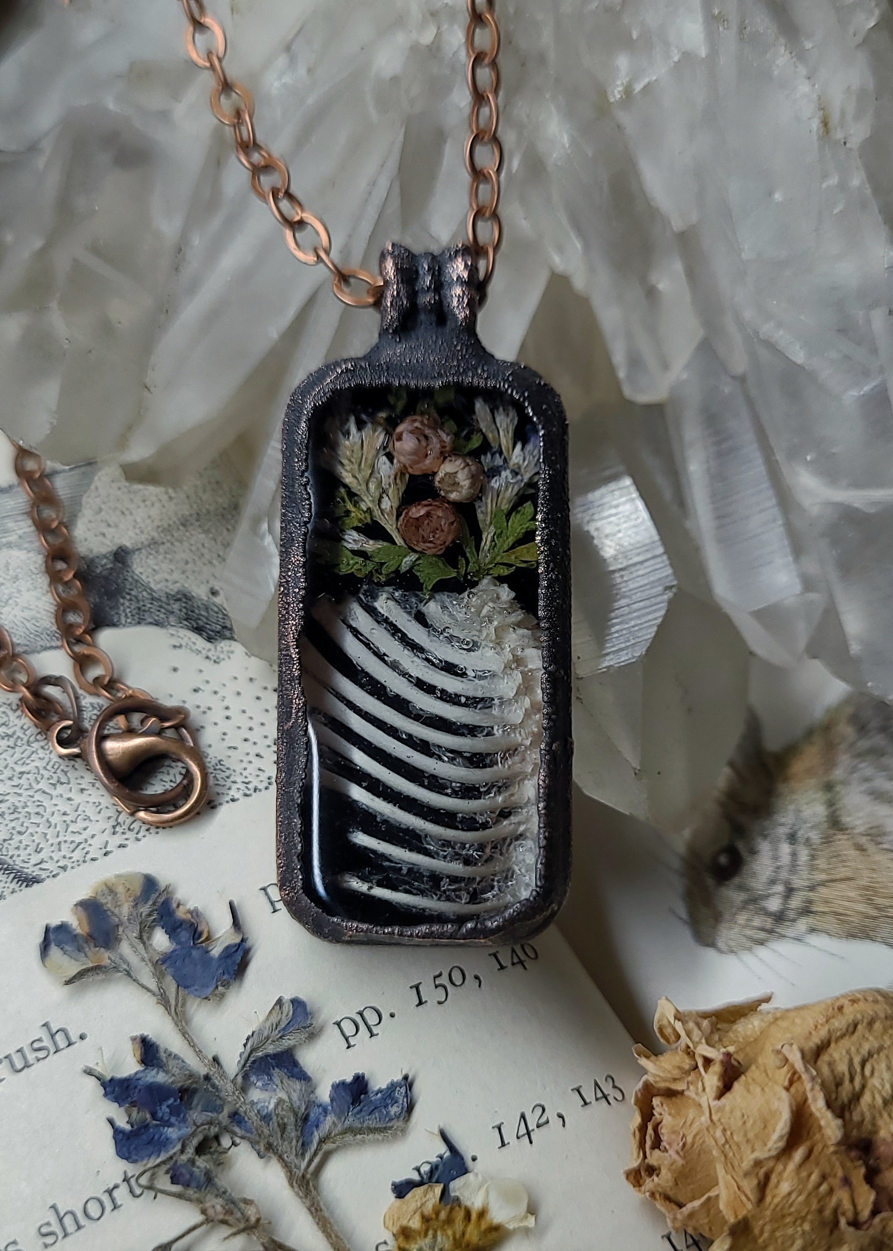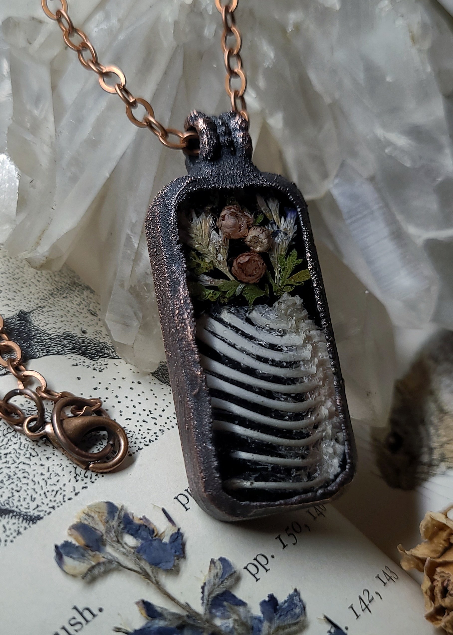 A preserved skeletal bunny ribcage is sealed in clear resin with dried pale pink wildflowers and framed in thick and textured oxidized copper to last a lifetime.