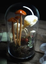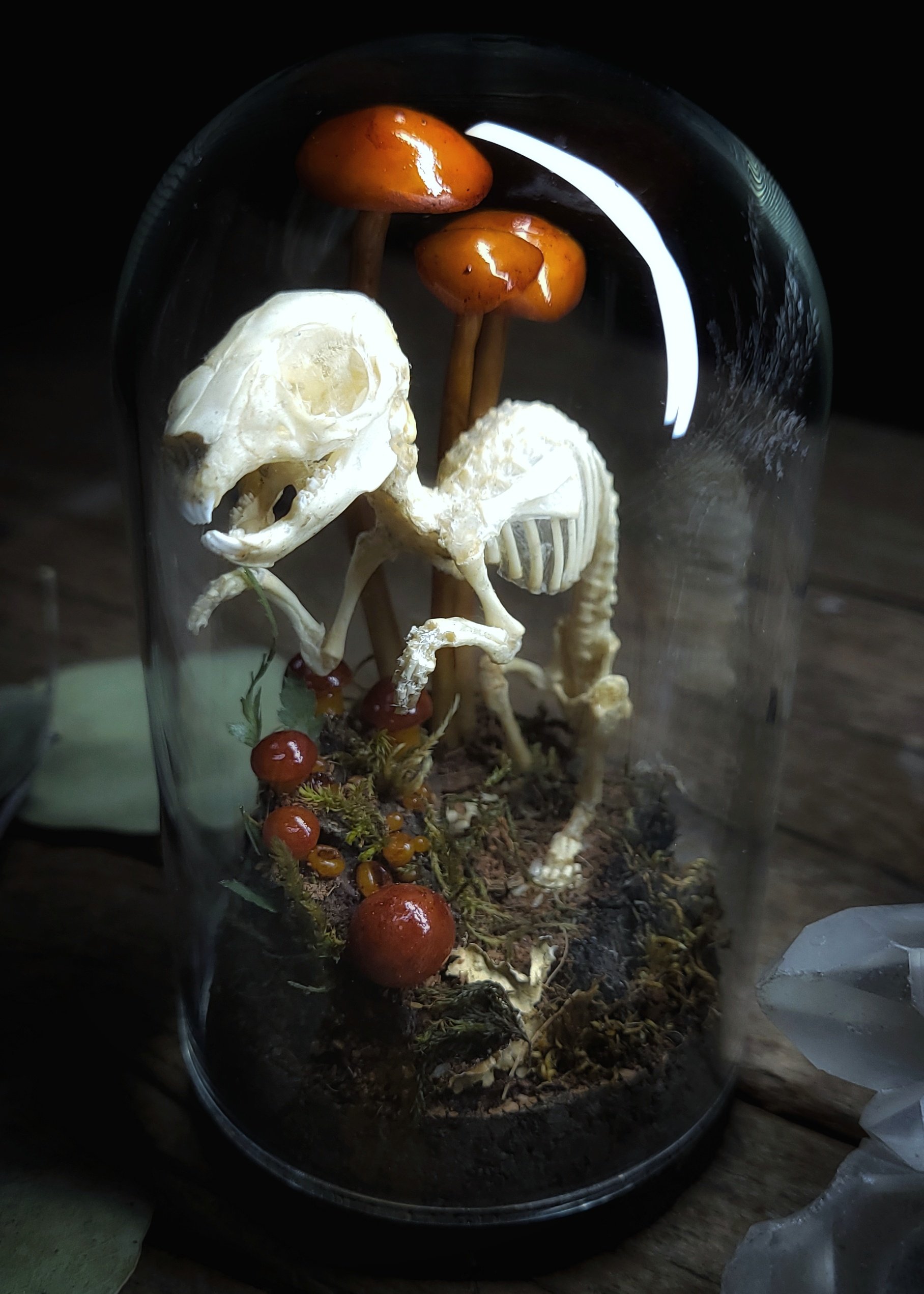 A small preserved rabbit skeleton sits on a forest floor base of preserved soil, mosses, and ferns with hand sculpted and painted orange and yellow mushrooms. Under glass dome with black cork base.