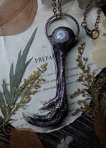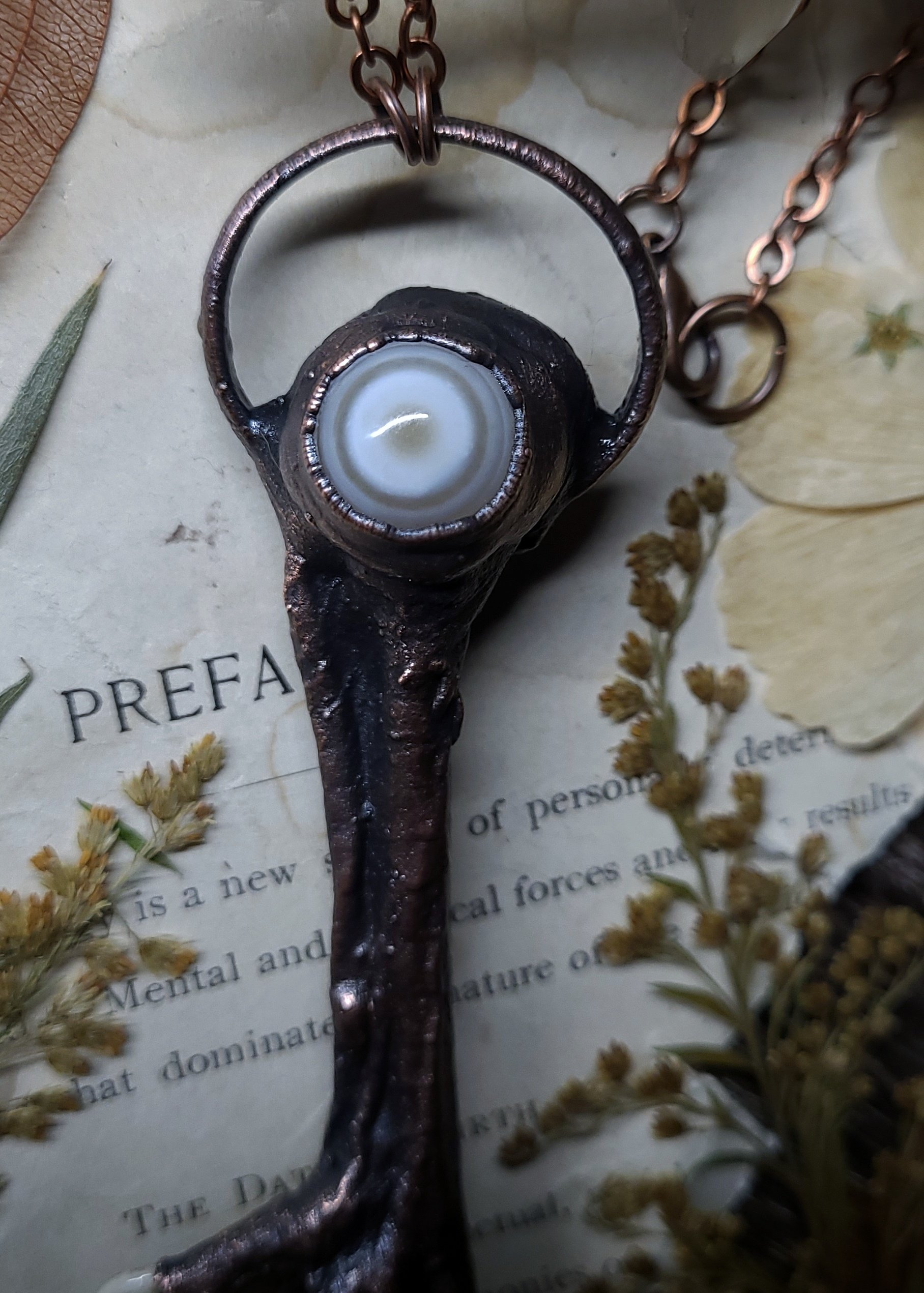 A large preserved chicken foot is adorned with a pale cream and white eye agate gemstone and is fully encased in thick oxidized copper metal with the natural claws exposed to make this extra large statement amulet.