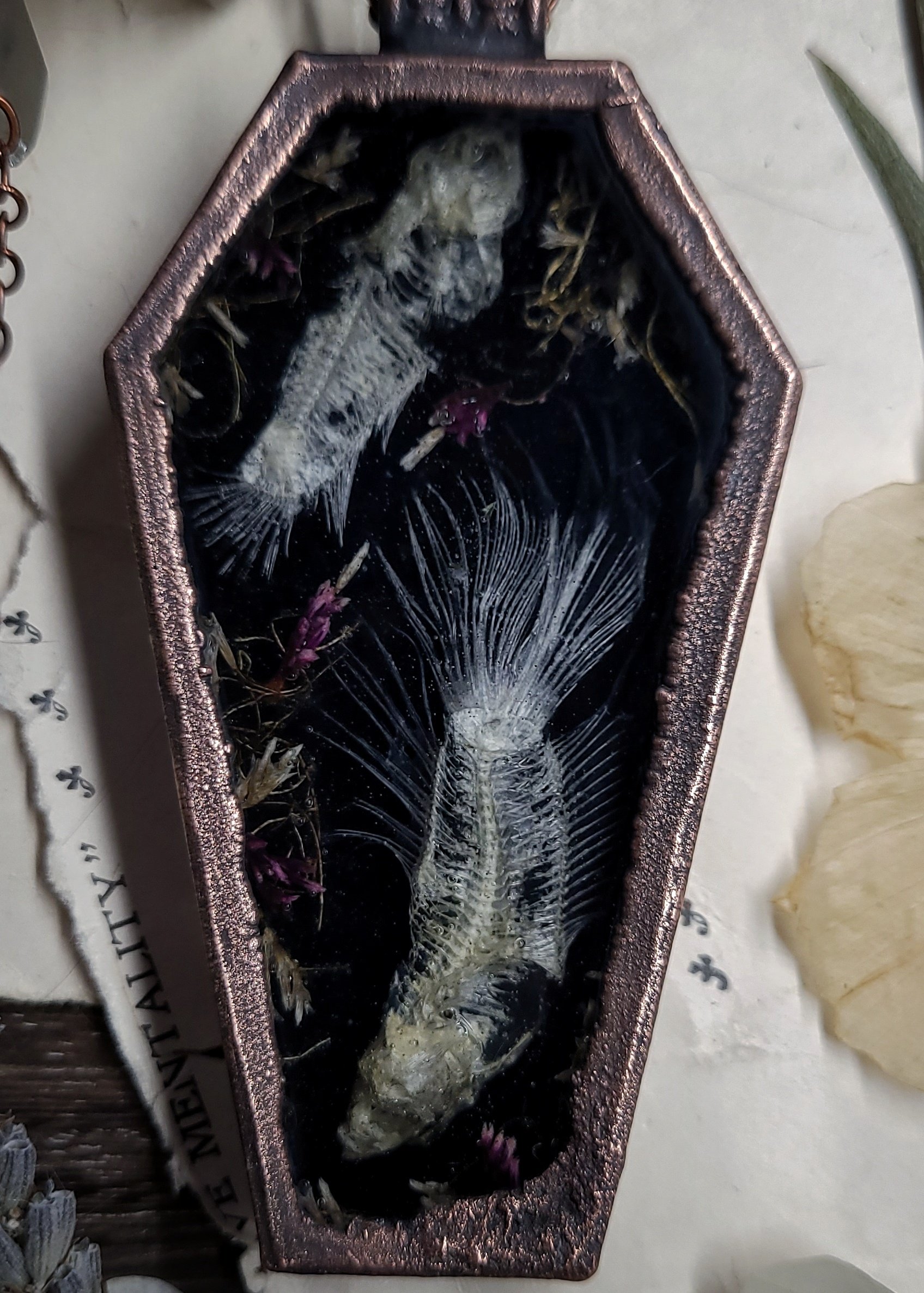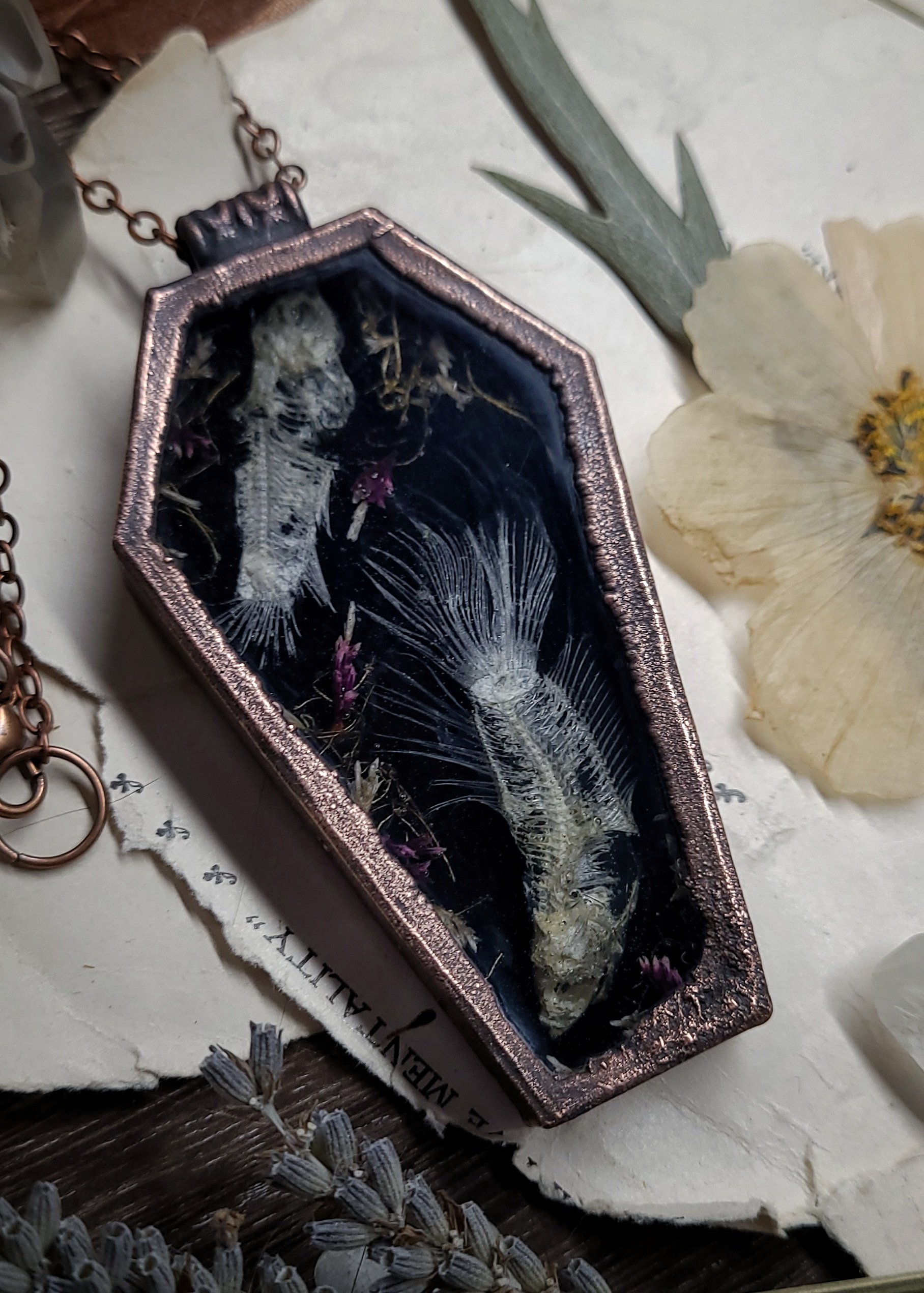 A preserved skeletal pair of betta fish are sealed in clear resin with dried wildflowers on a shiny black background inside of an extra large and deep coffin shaped amulet framed in thick and textured oxidized copper to last a lifetime.