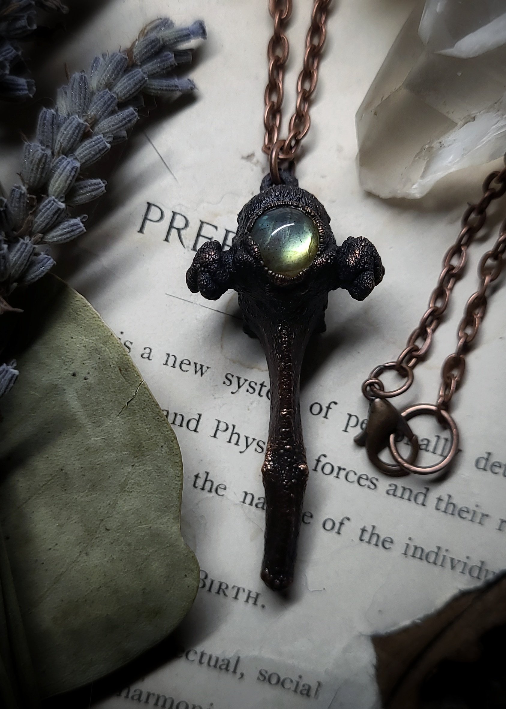 A real preserved vertebra bone from a domestic black cat holds a mossy green labradorite gemstone with gold flash.