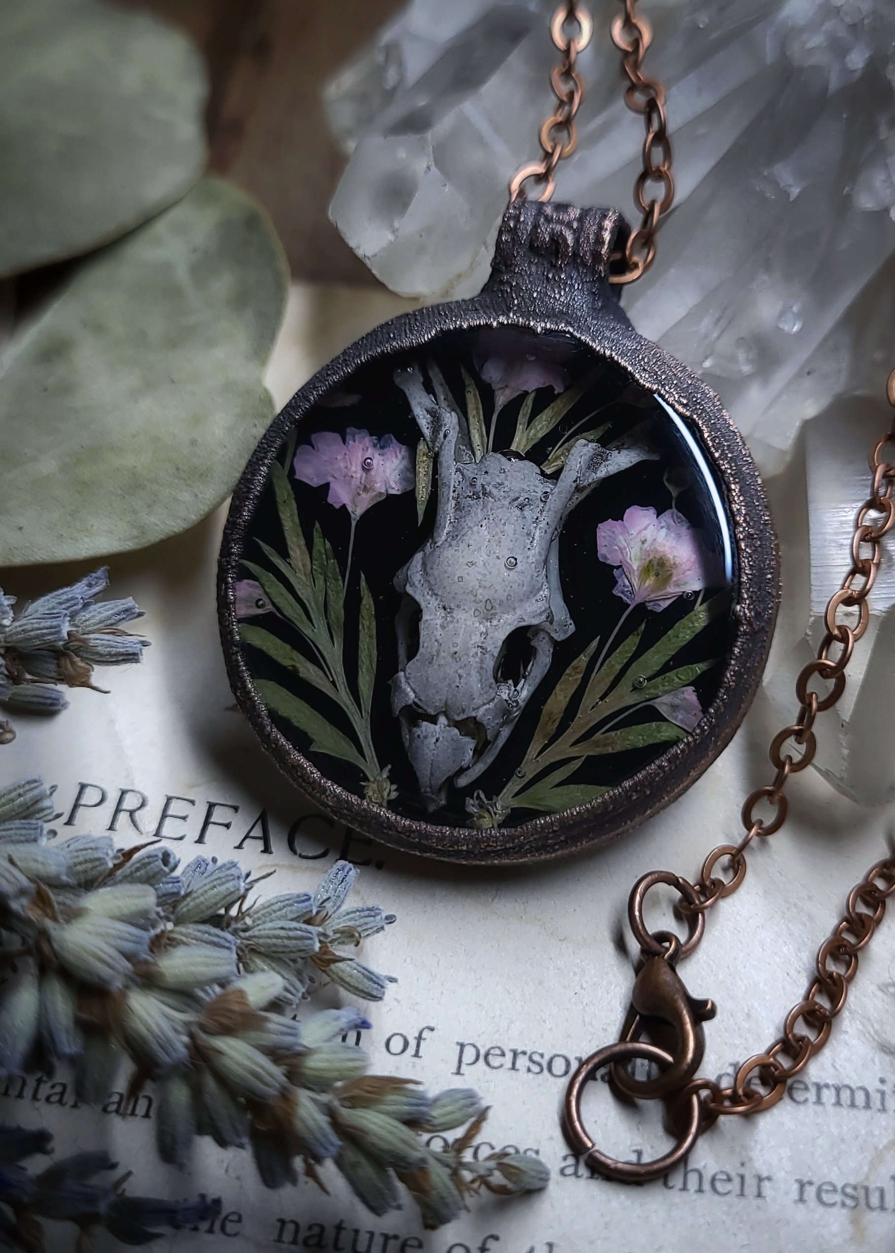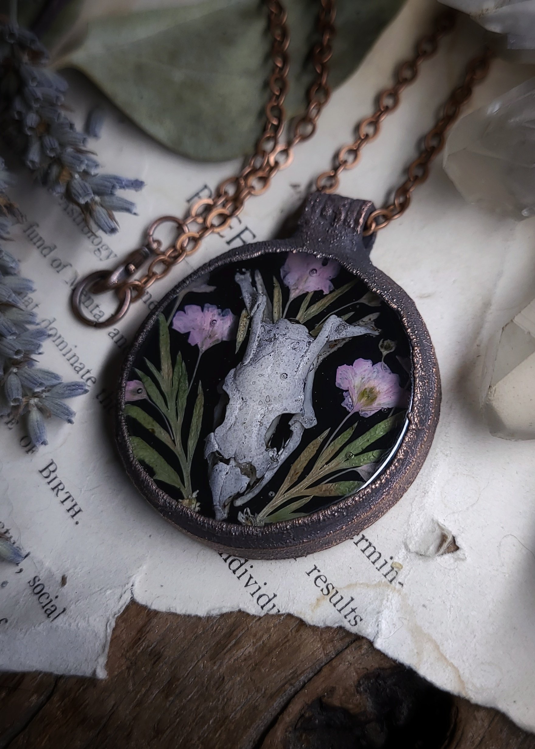 A naturally cleaned and stained kingsnake skull is sealed in clear resin with dried wildflowers and framed in thick and textured oxidized copper to last a lifetime.