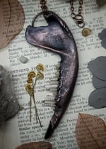 The jawbone is fully encased in thick oxidized copper metal with the remaining teeth exposed and natural.