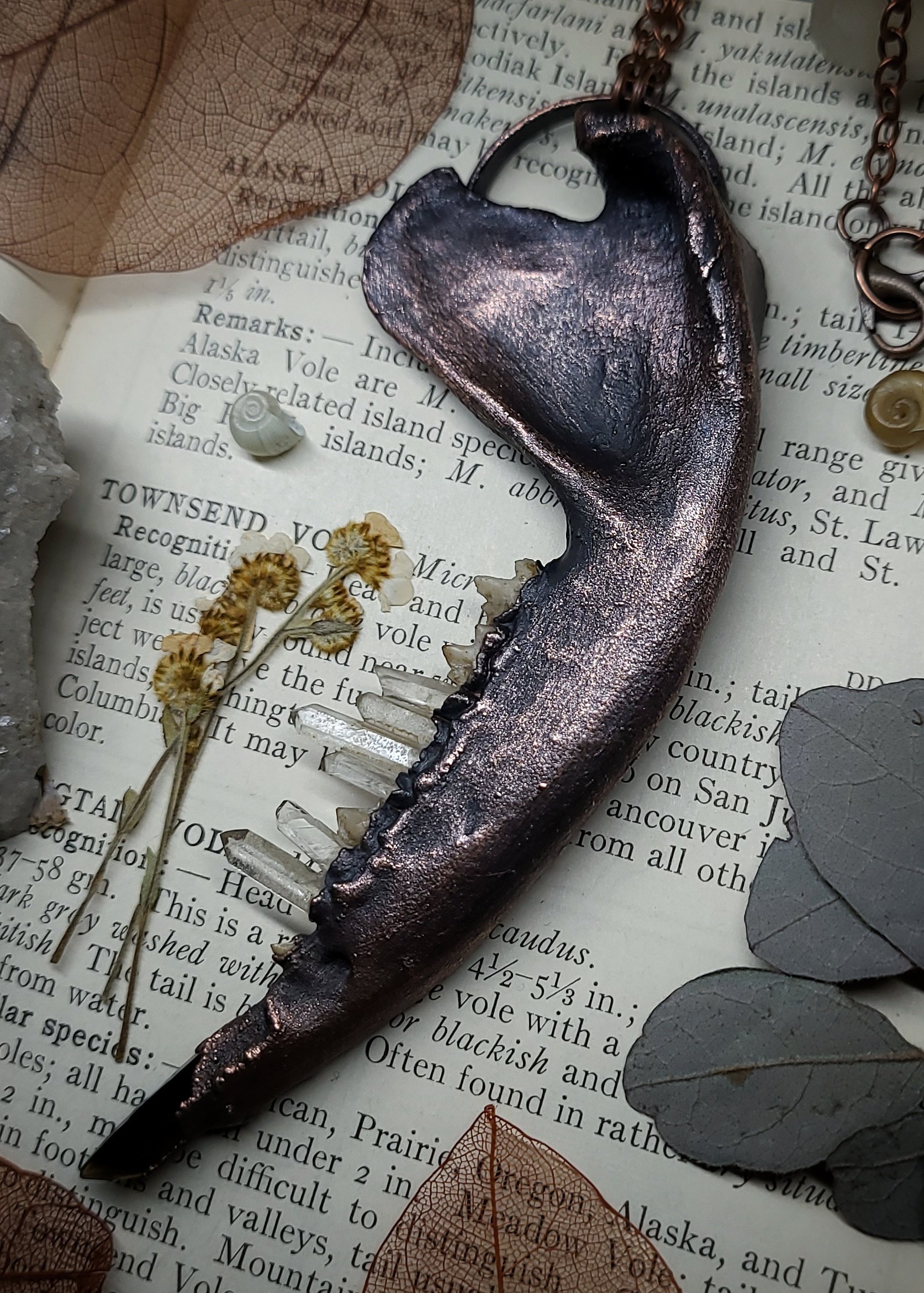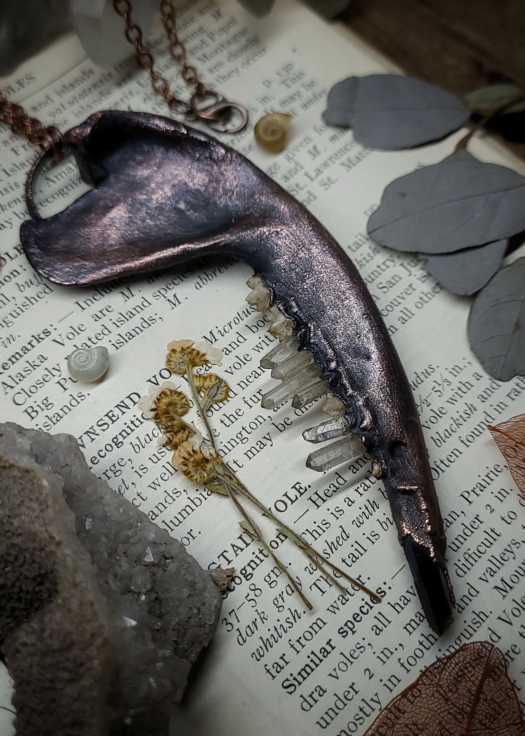 A large naturally foraged opossum jawbone with missing teeth holds multiple quartz crystal shards in place of the missing teeth.