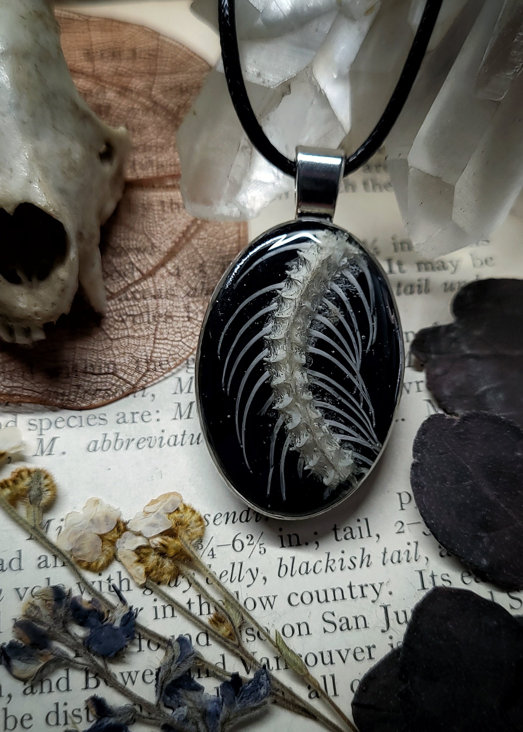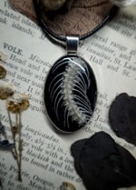 A double sided silver brass pendant with a section of snake spine and rib bones sealed under domed resin on a shiny black background on one side and an arrangement of dried pink wildflowers and ferns sealed under domed resin on a shiny black background on the other side.