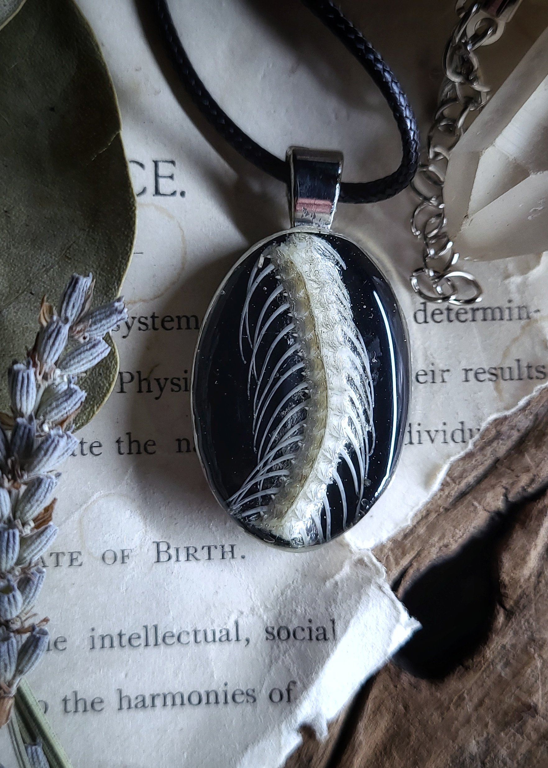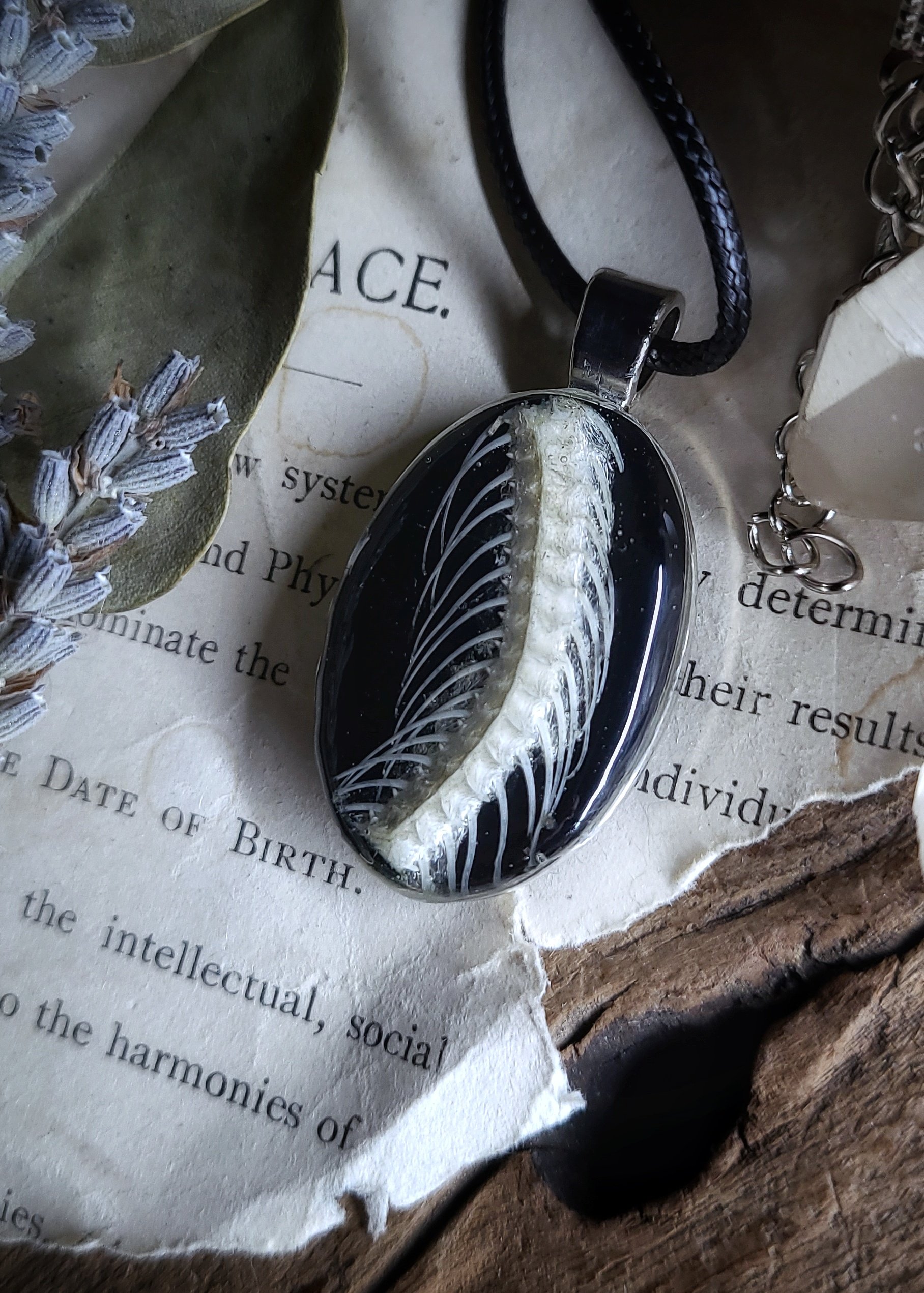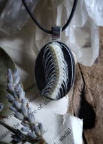 On one side - a section of spine and rib bones from a snake specimen, on the other side - dried pressed wildflowers and ferns, sealed under clear resin inside of a silver brass oval shaped pendant on a shiny black background.