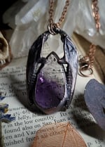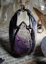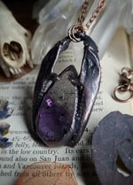 A pair of real preserved jawbones from a large bearded dragon specimen hold an extra large teardrop shaped purple and translucent fluorite crystal.