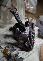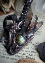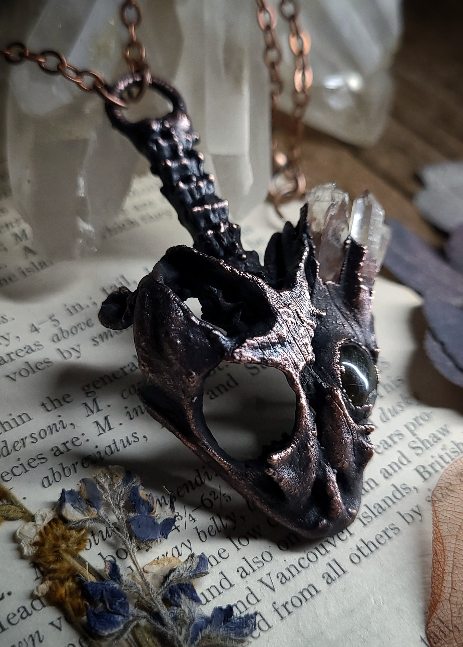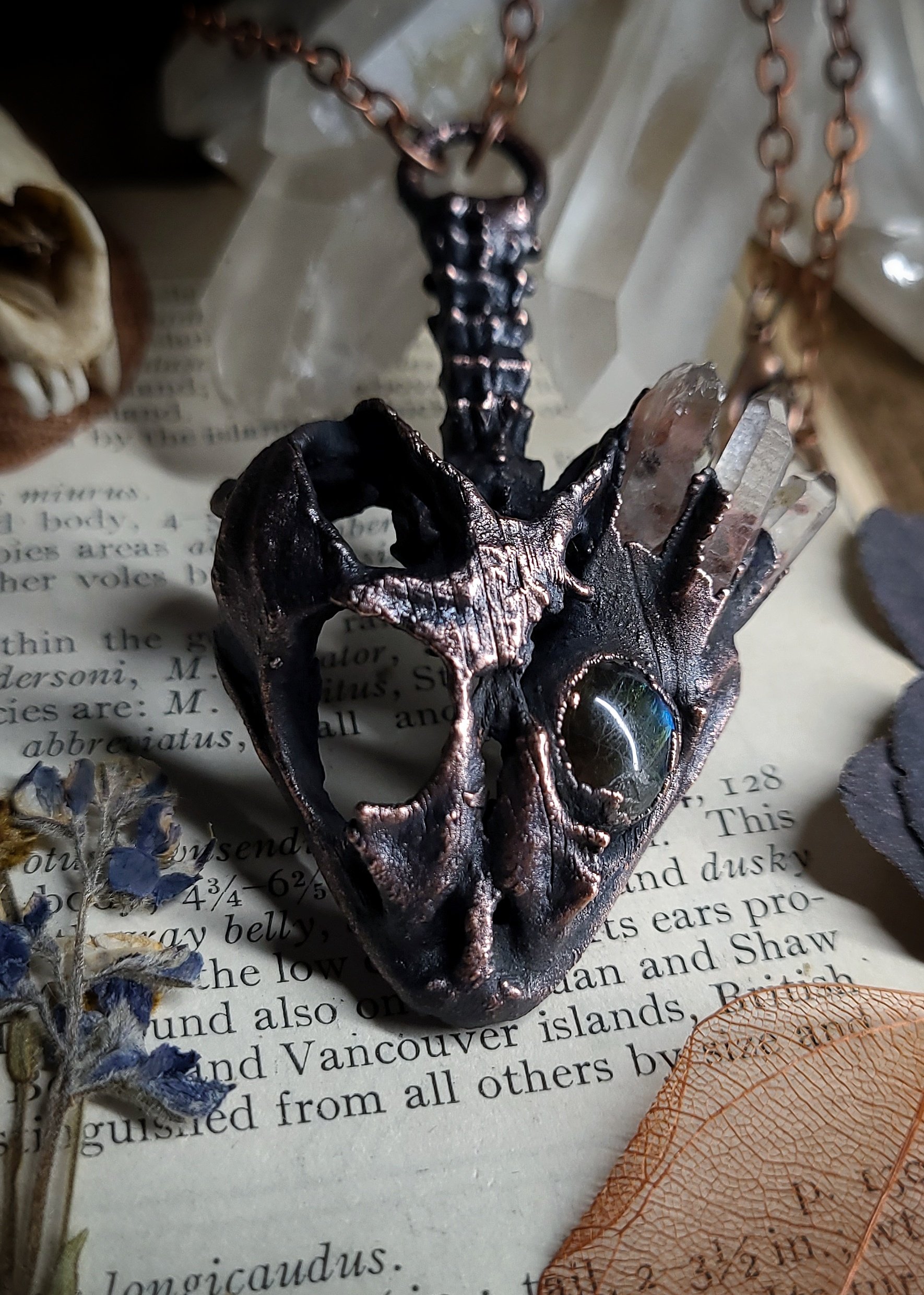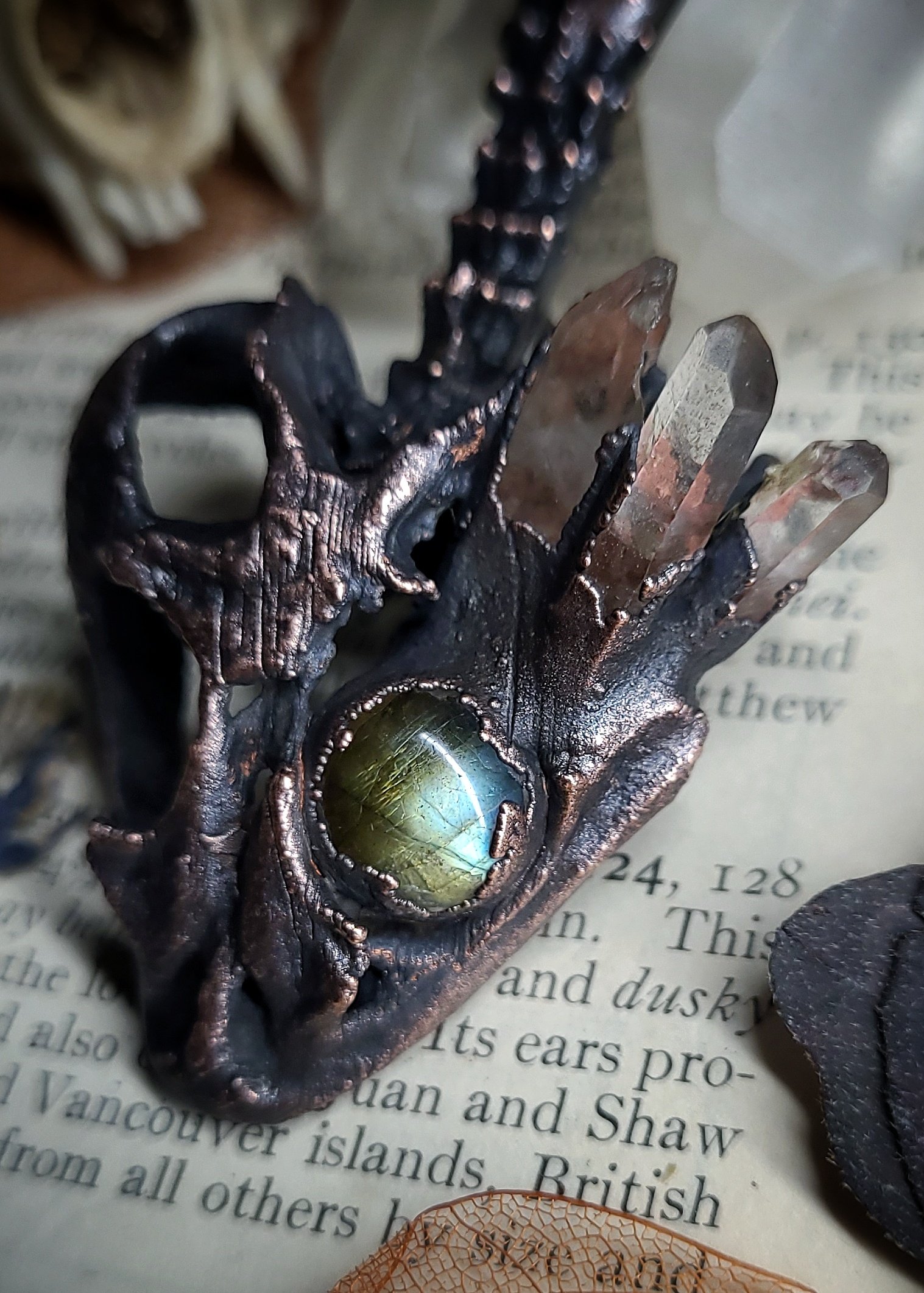 A real preserved skull and partial spine from a large bearded dragon specimen hold a flashy labradorite gemstone eye and a crown of smoky quartz crystal points.