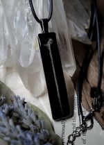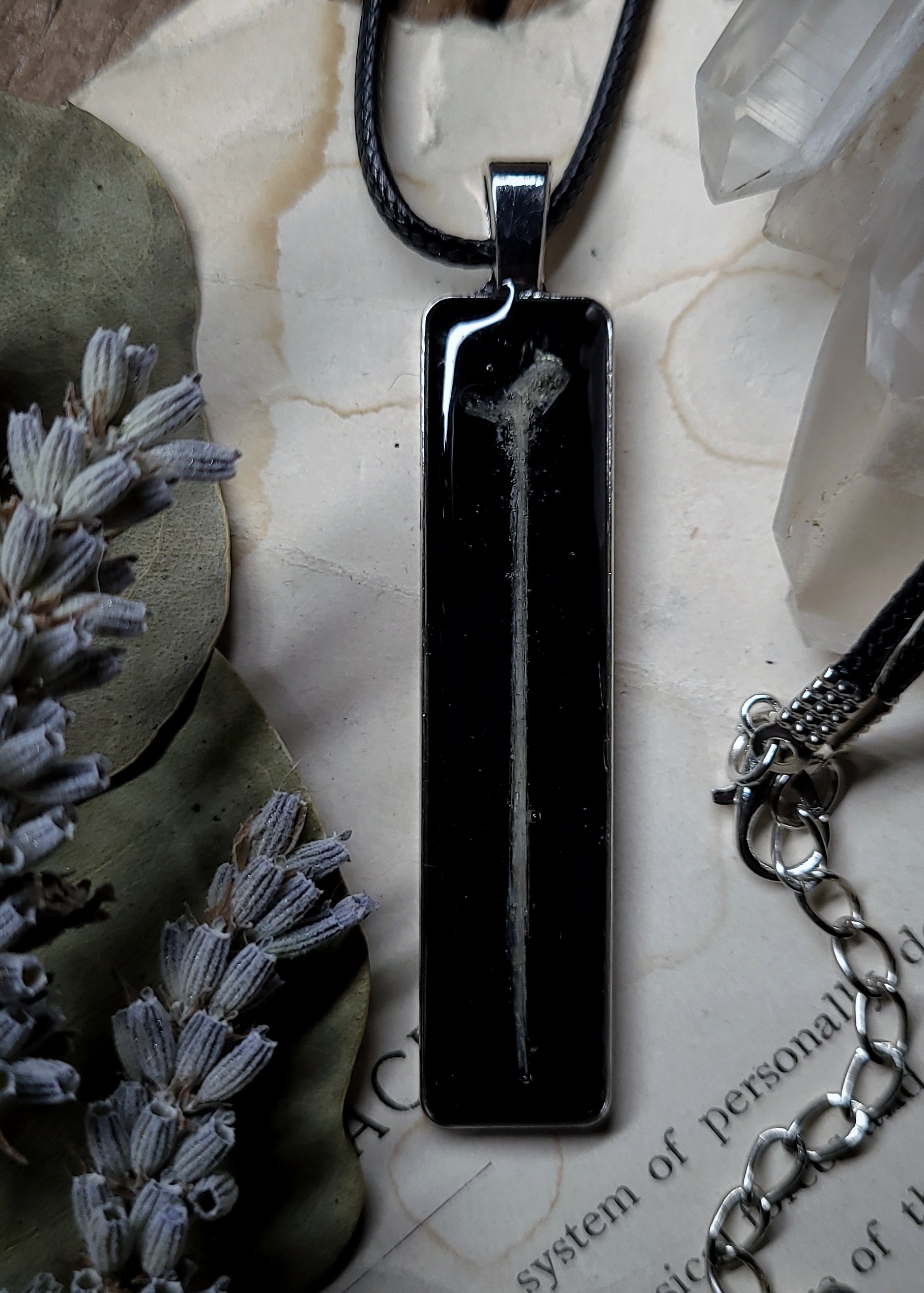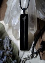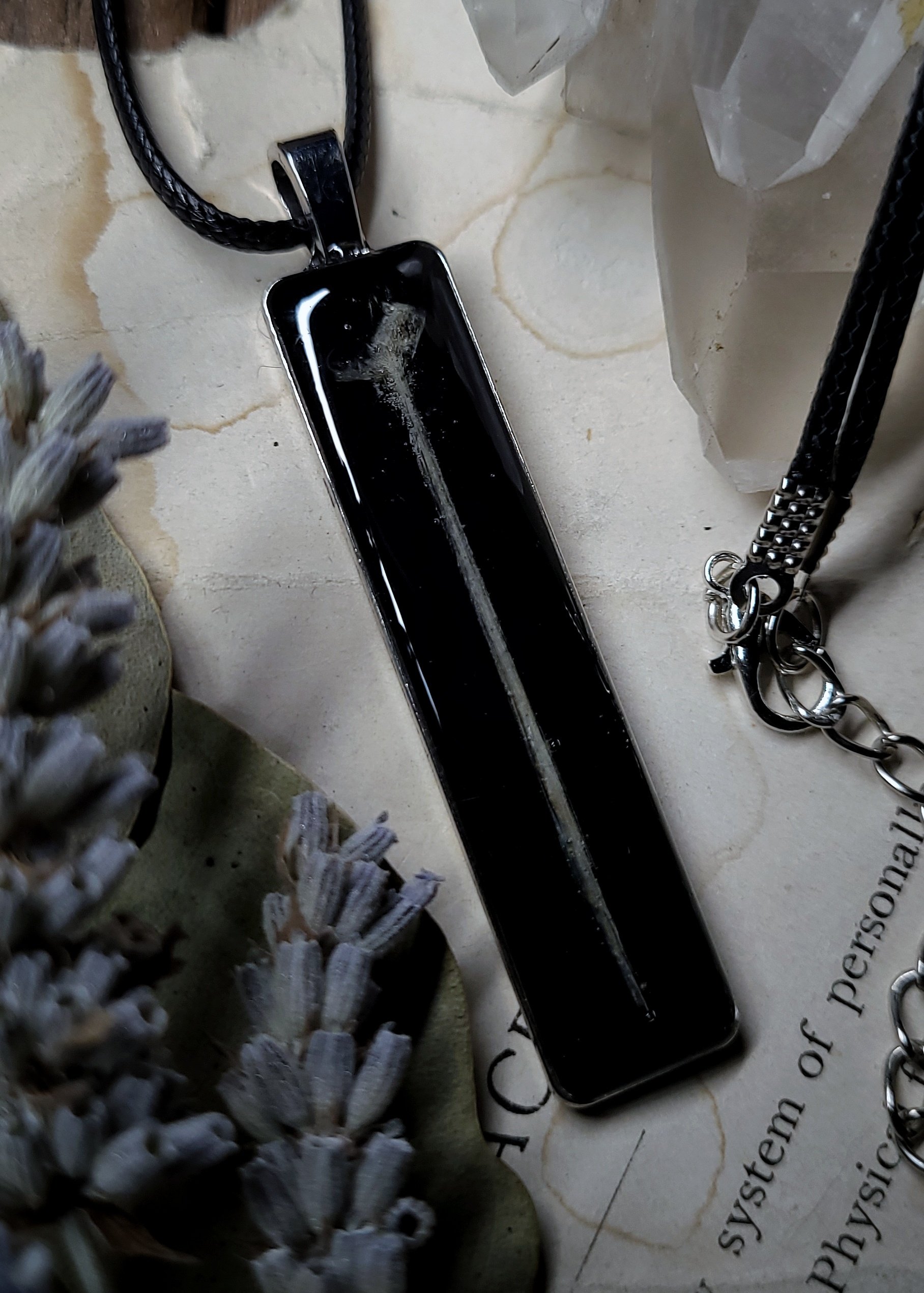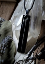 Pendant measures 60 mm x 12 mm and comes on a black waxed cord necklace in 18 inch length.