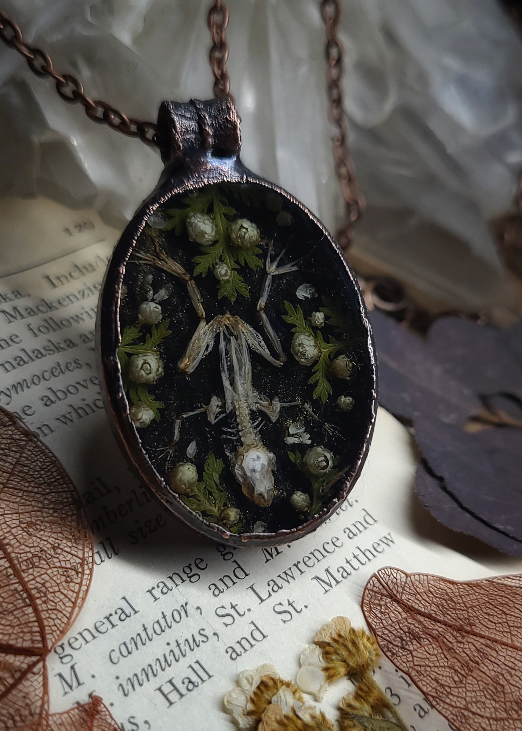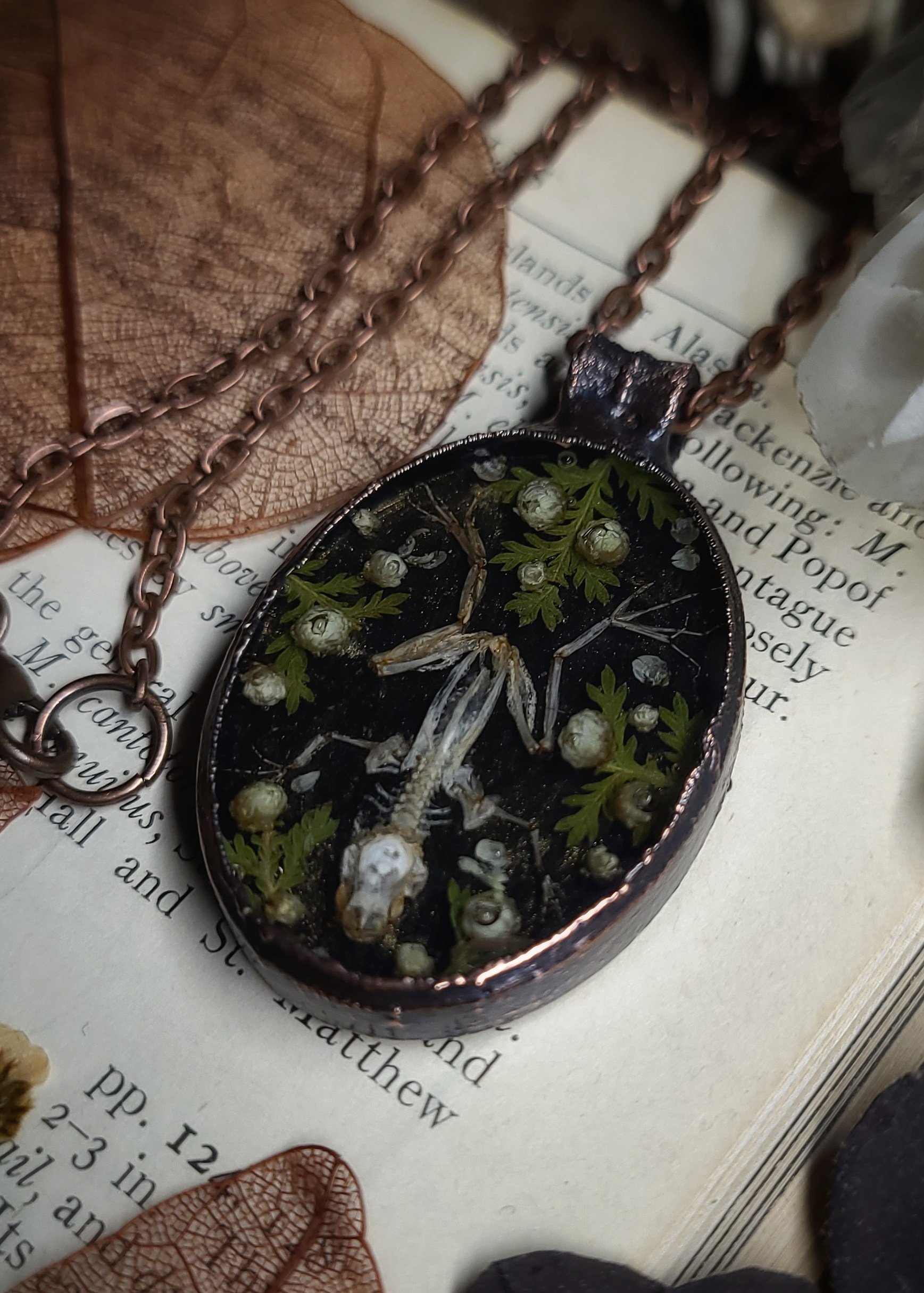 A naturally cleaned and stained tiny frog skeleton is sealed in clear resin with dried wildflowers and framed in thick and textured oxidized copper to last a lifetime.