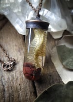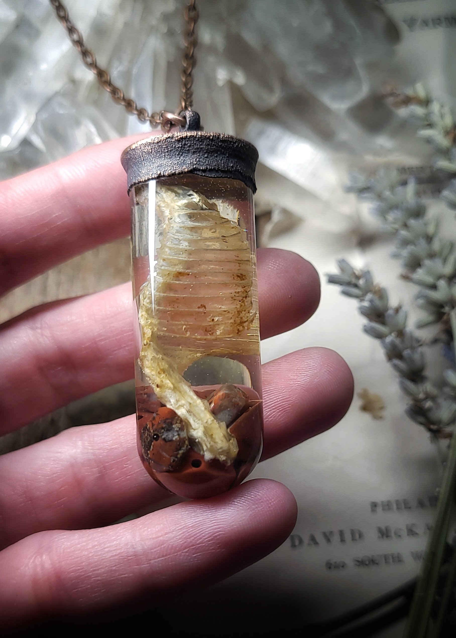 A real preserved mouse ribcage and red jasper gemstone chips at suspended in clear resin inside of a thick glass tube vial with a thick antiqued copper cap and ring to make this pendant.