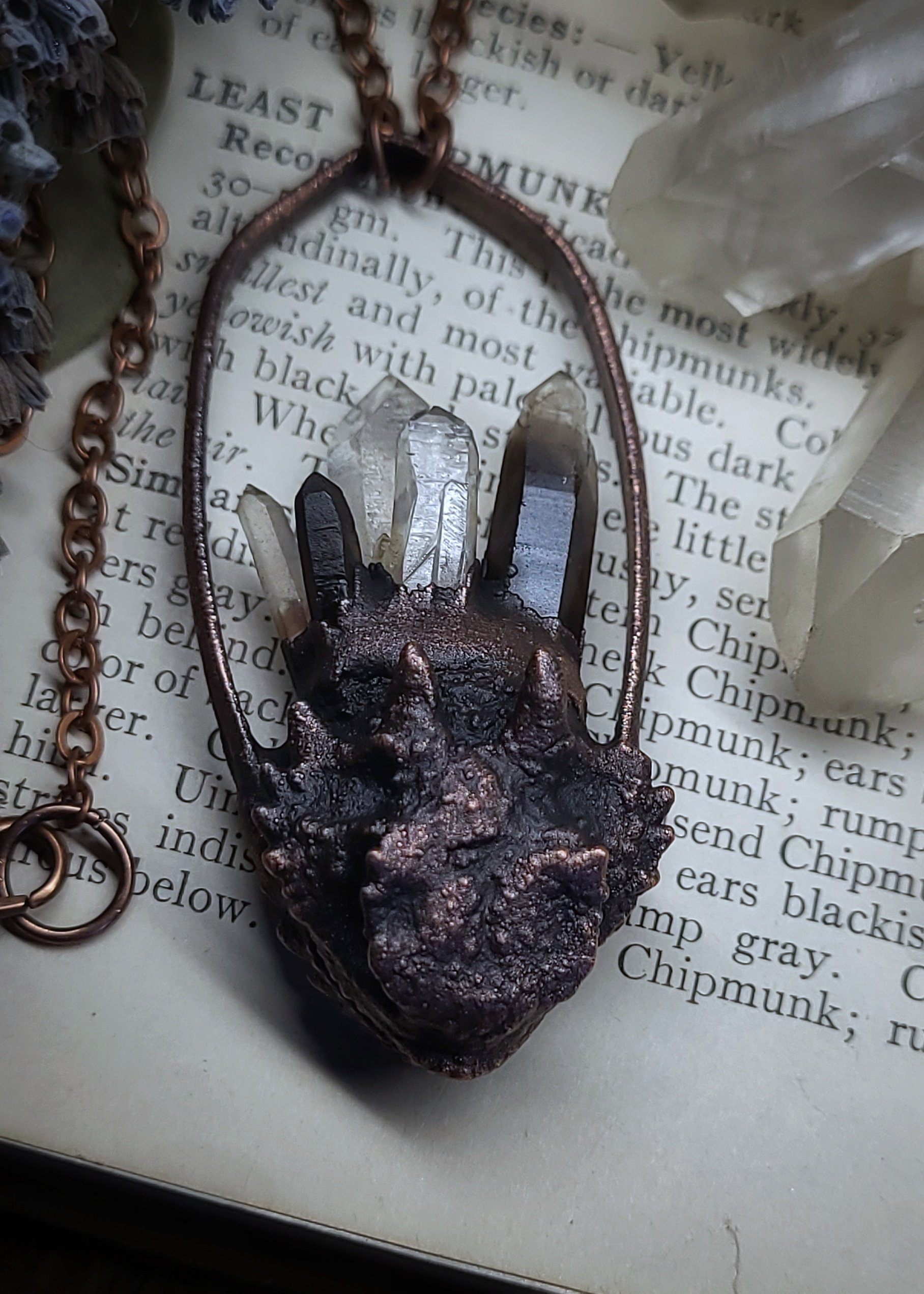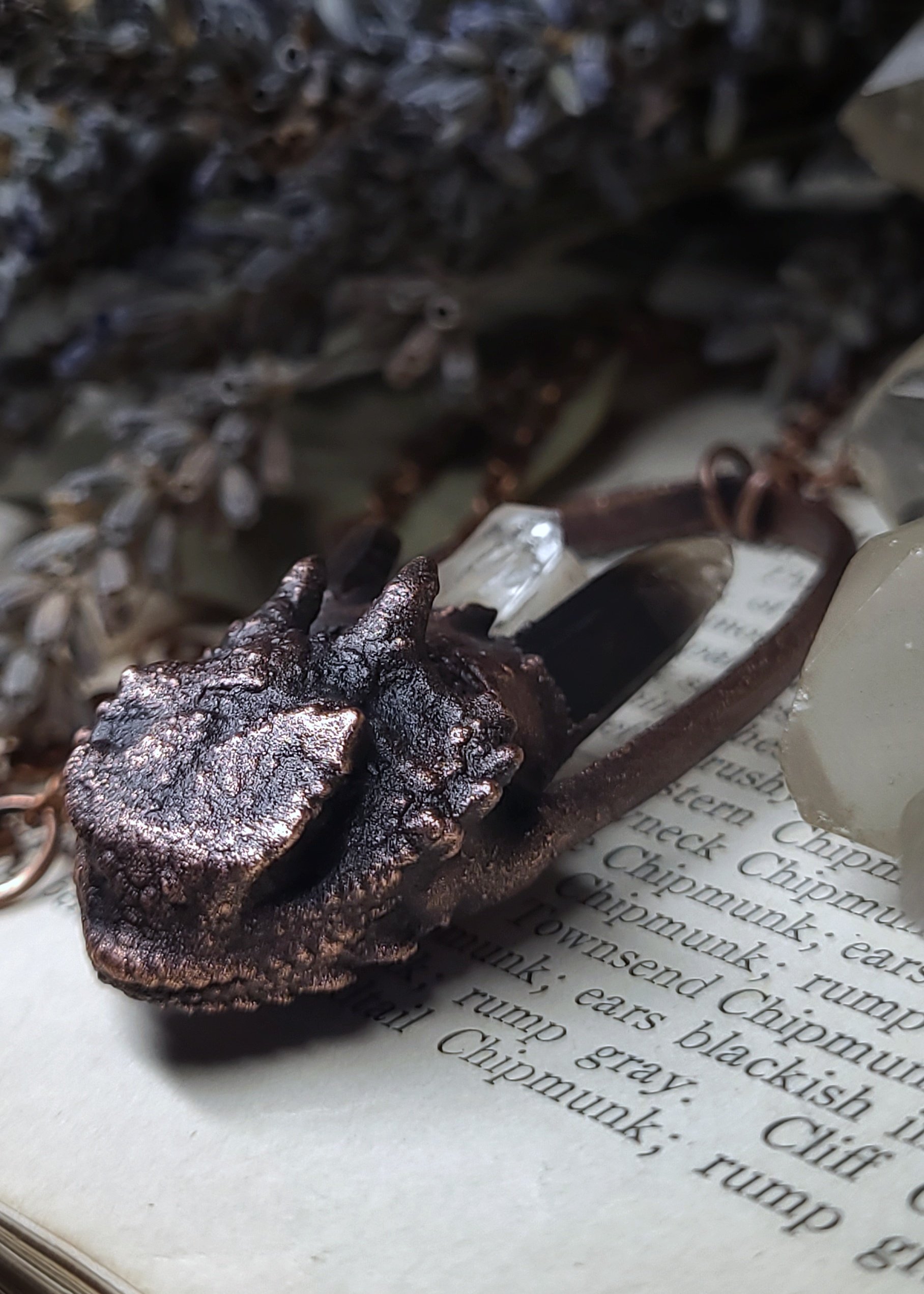 A large plaster death cast head from a real horned lizard specimen is crowned in white and smoky quartz crystal points and is fully encased in thick oxidized copper to last a lifetime.