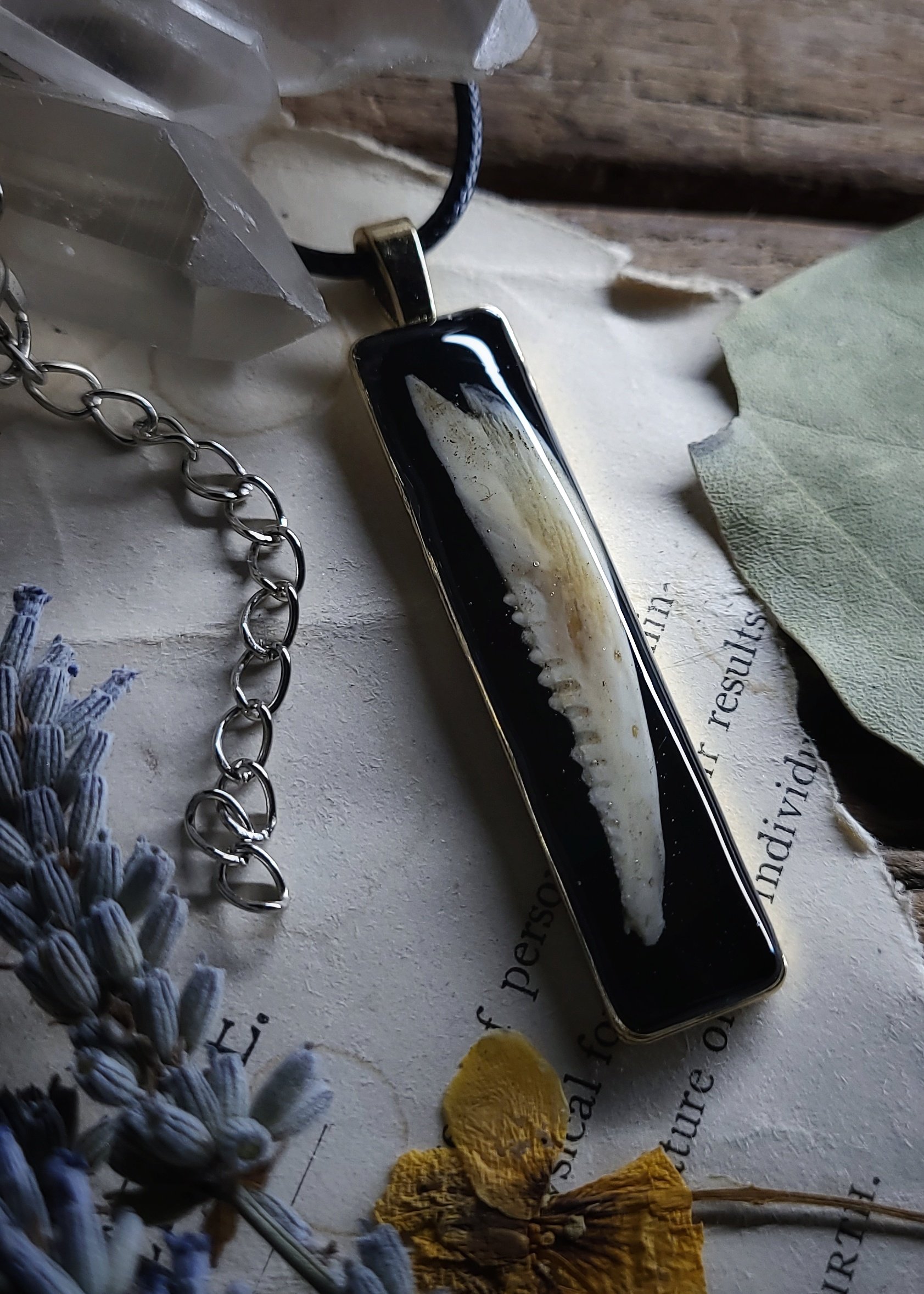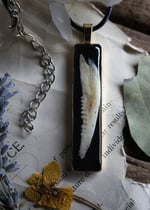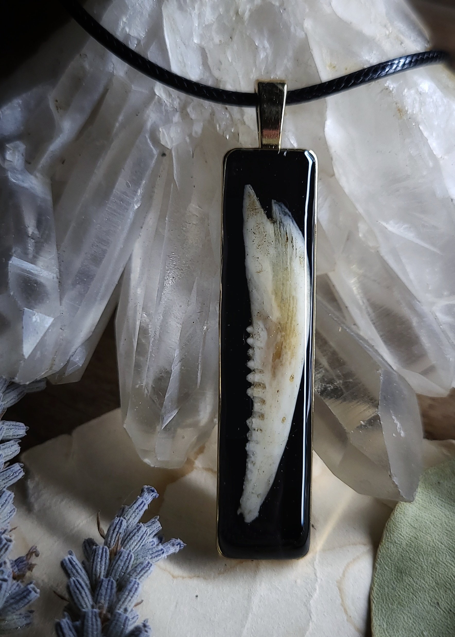 Pendant measures 60 mm x 12 mm and comes on a black waxed cord necklace in 18 inch length.