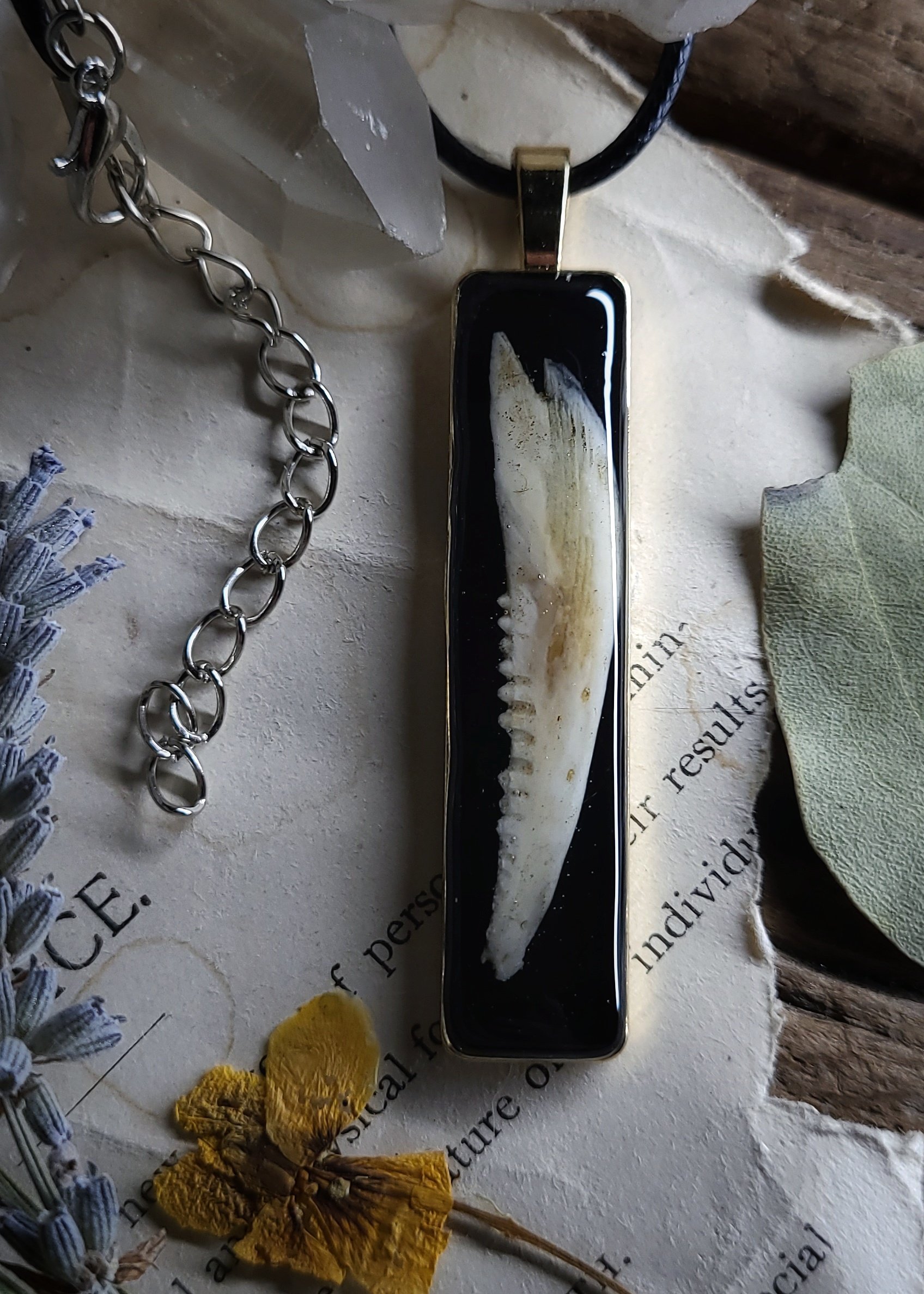 A real preserved bearded dragon jawbone on shiny black background sealed under domed resin inside a bronze brass pendant.