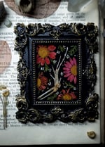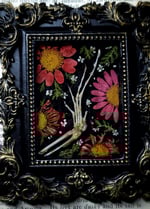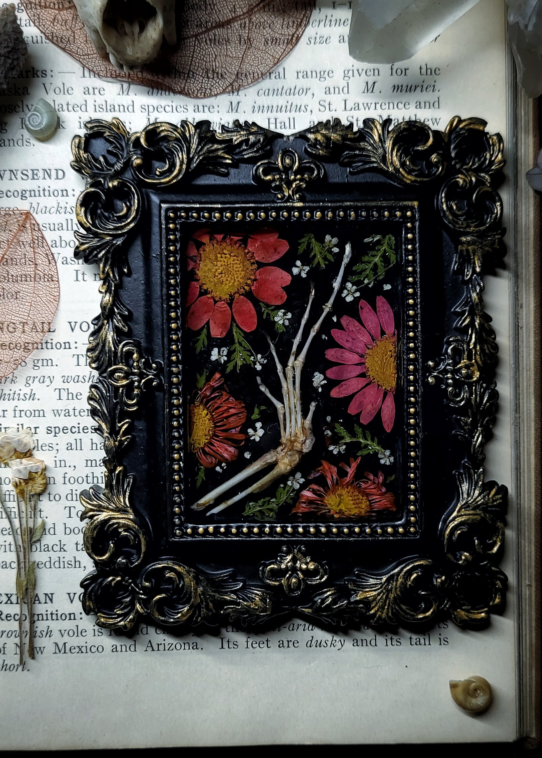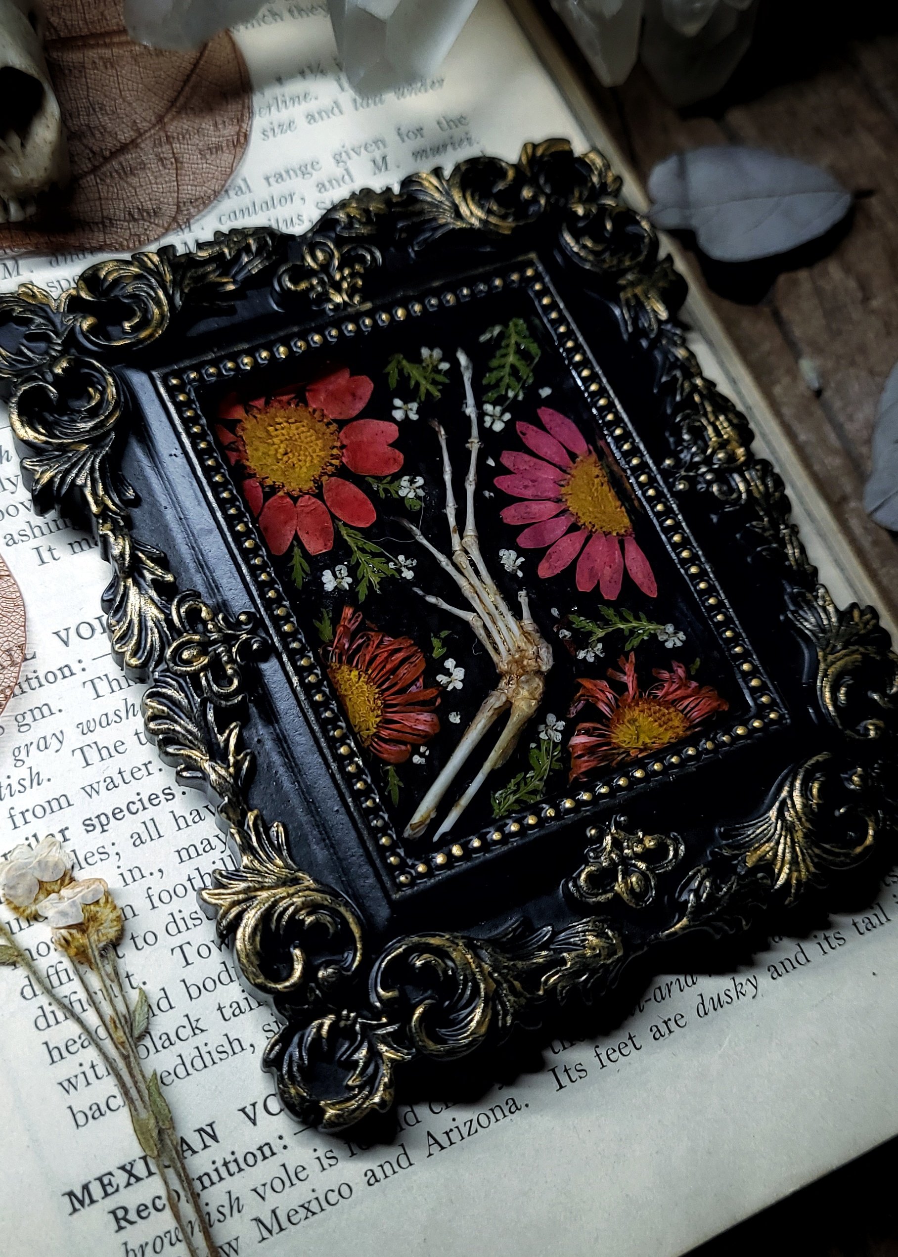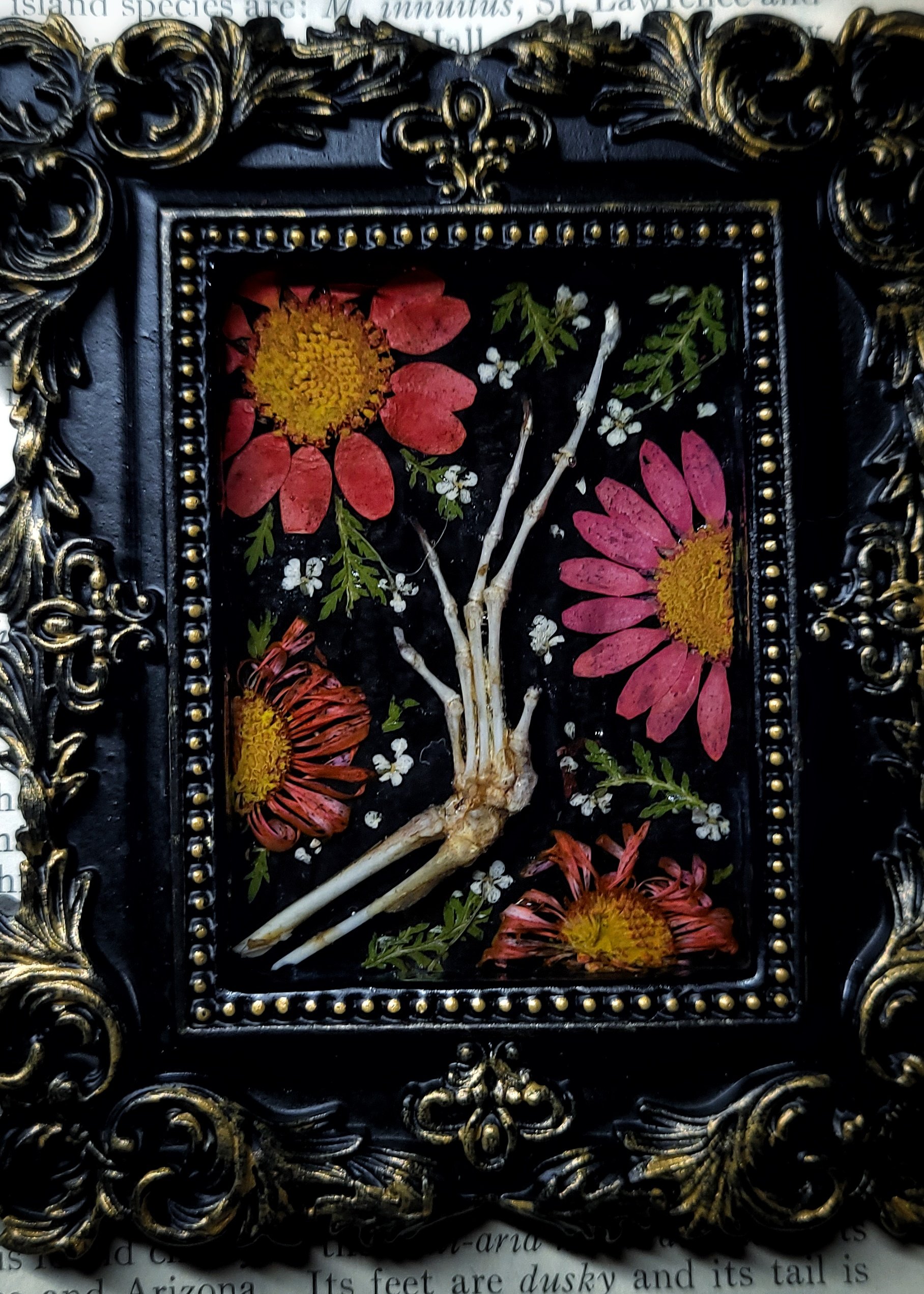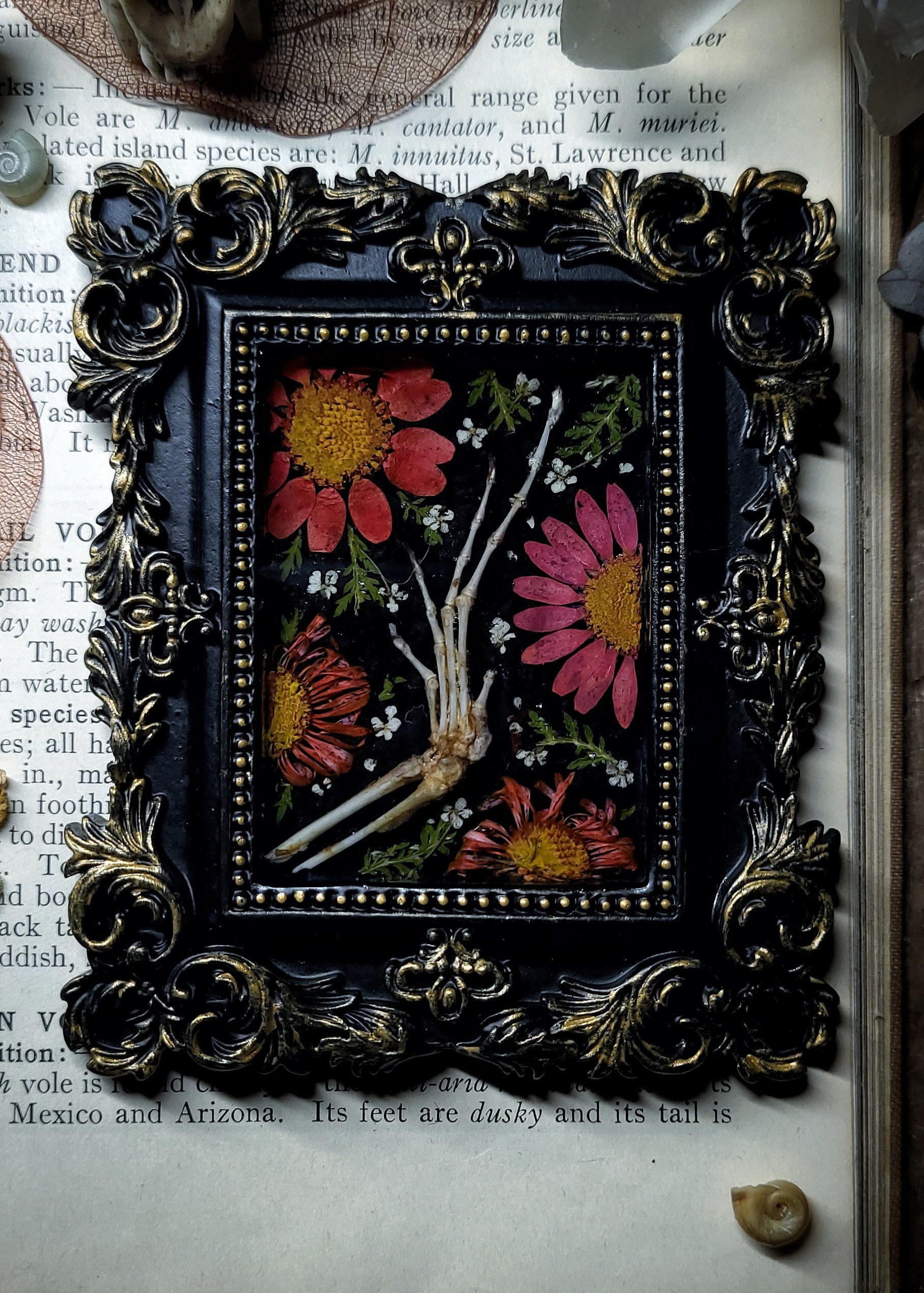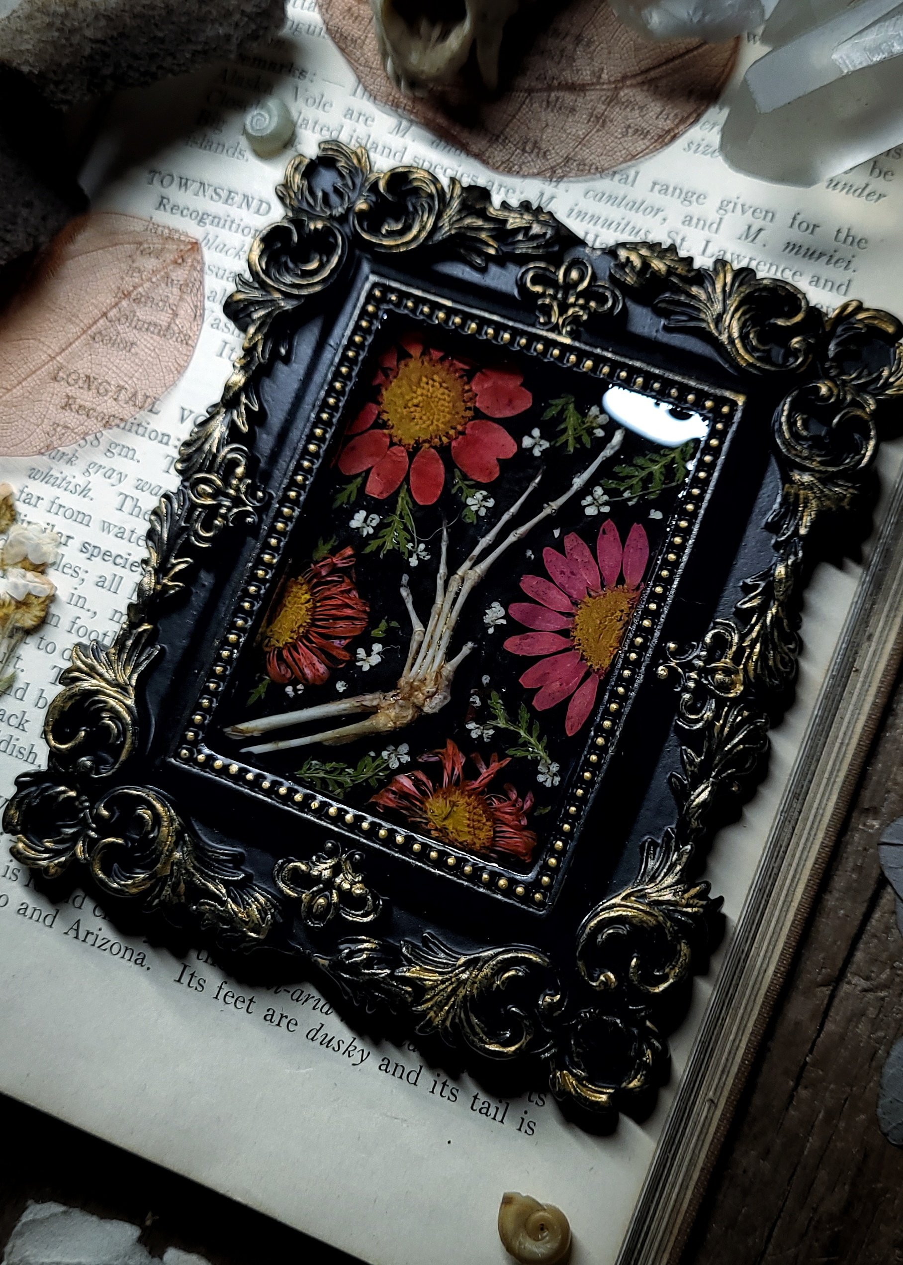 A large articulated skeletal lizard arm and claw bones is set on a black background with dried pressed wildflowers and ferns, sealed under clear resin in a vintage rustic miniature wall frame in black and dark brushed gold.