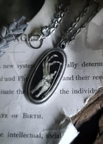 Pendant measures 33 mm x 15 mm and comes on a matching chain necklace in 18 inch length.