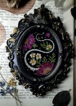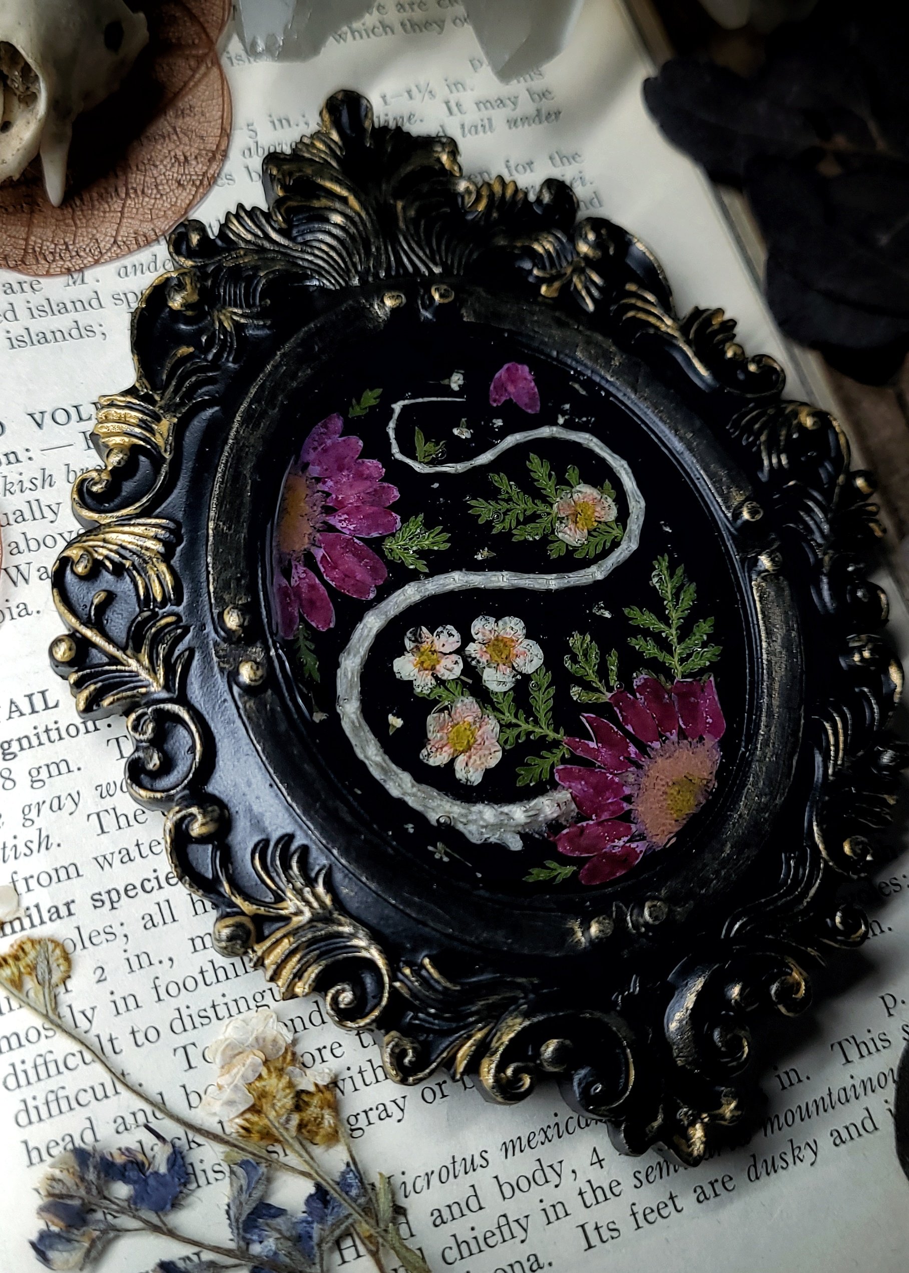 The skeletal tail of a mouse is coiled on a black background with dried pressed wildflowers and ferns, sealed under clear resin in a vintage rustic small wall frame in black and dark brushed gold.