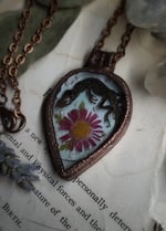 A naturally mummified lizard is sealed in clear resin with dried pink daisy and framed in thick and textured oxidized copper to last a lifetime.