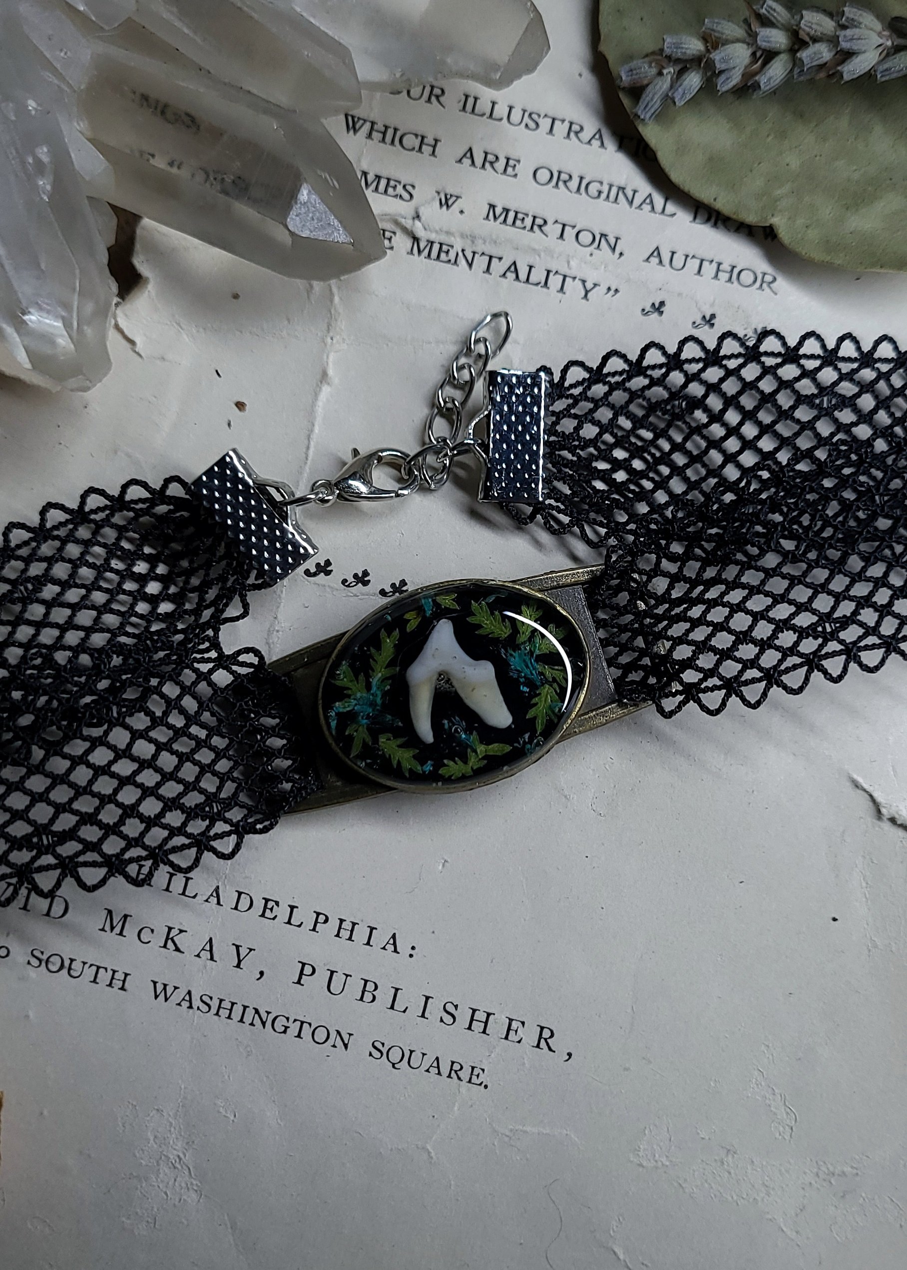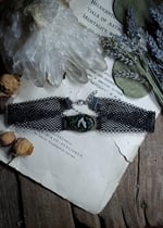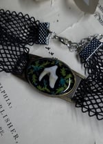 Pendant measures 44 mm x 21 mm and comes on a black stretchy lace choker necklace.
