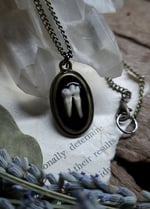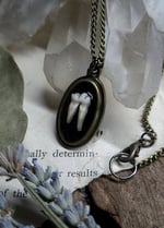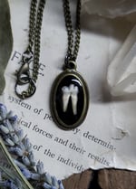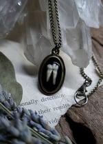 A single foraged opossum tooth is sealed under clear resin inside of a brass oval shaped pendant on a shiny black background.