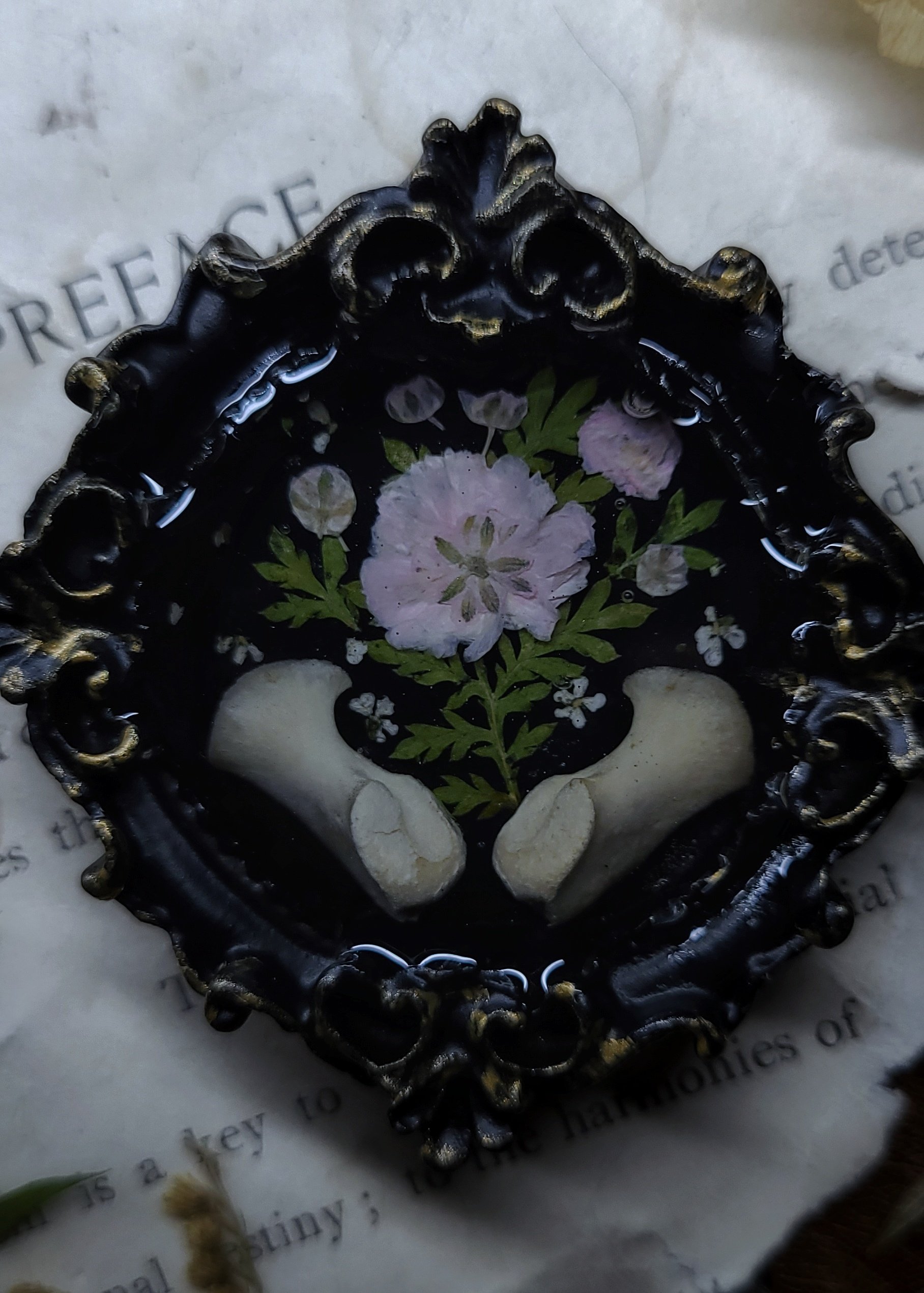 A pair of small piglet bones on a black background with a dried pressed wildflowers and ferns, sealed under clear resin in a vintage rustic miniature wall frame in black and dark brushed gold.