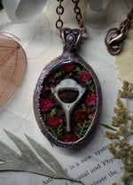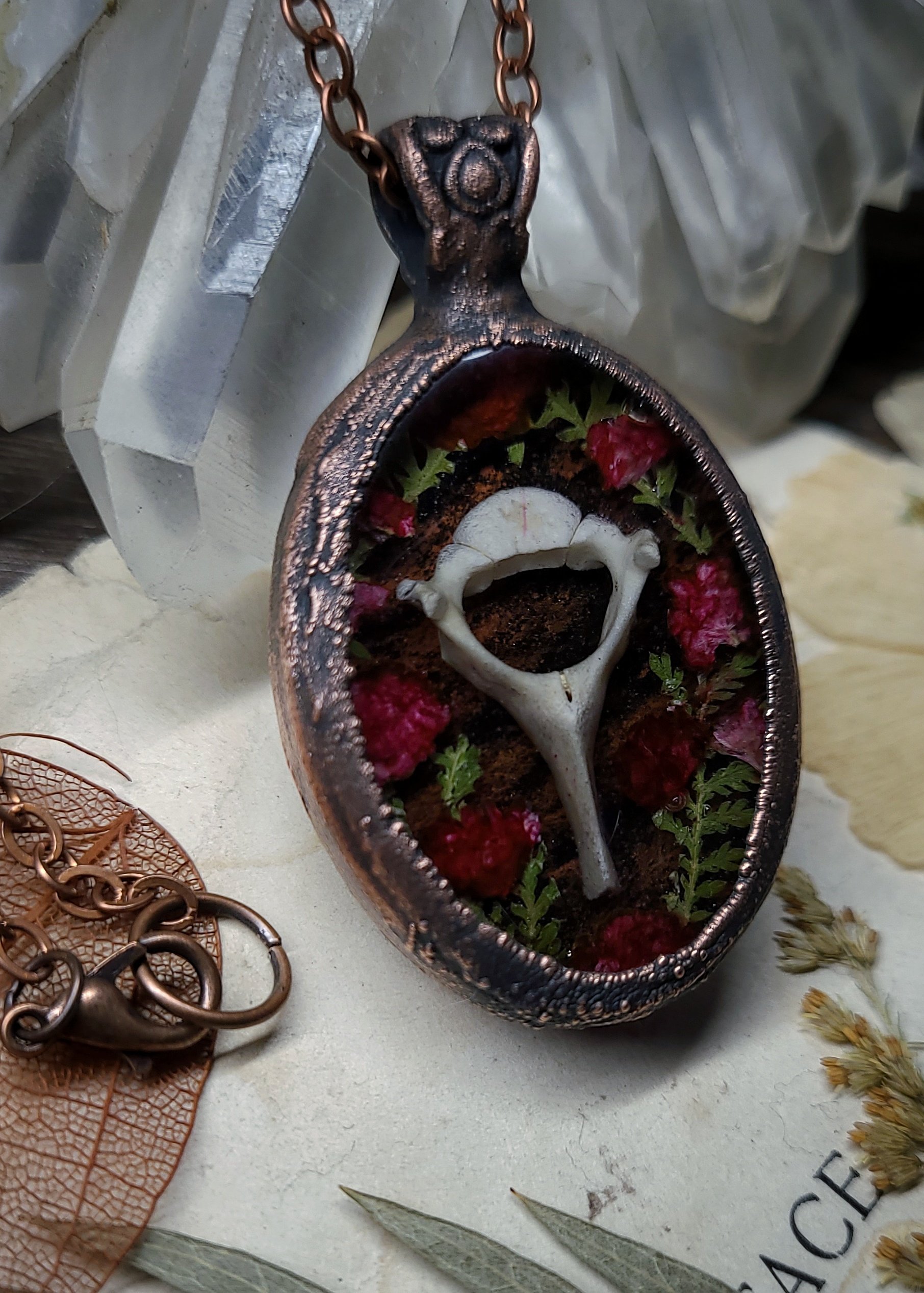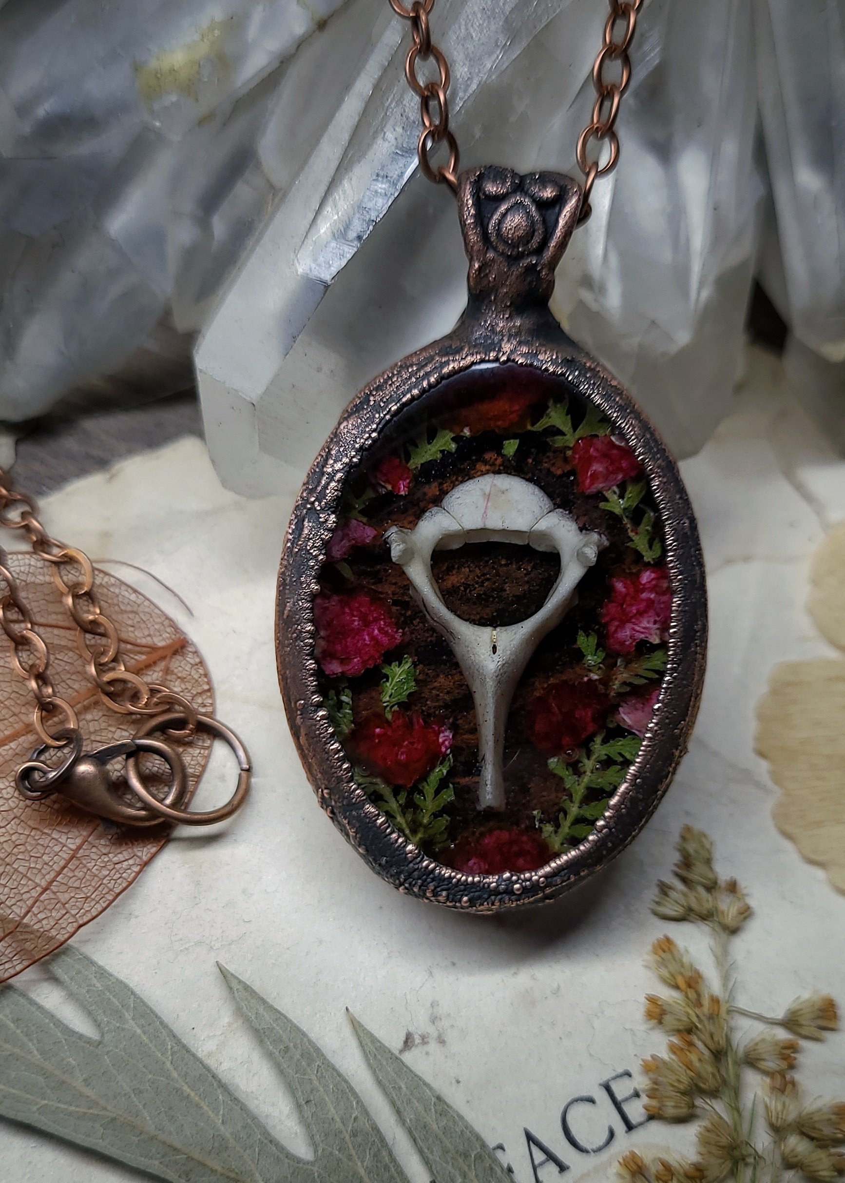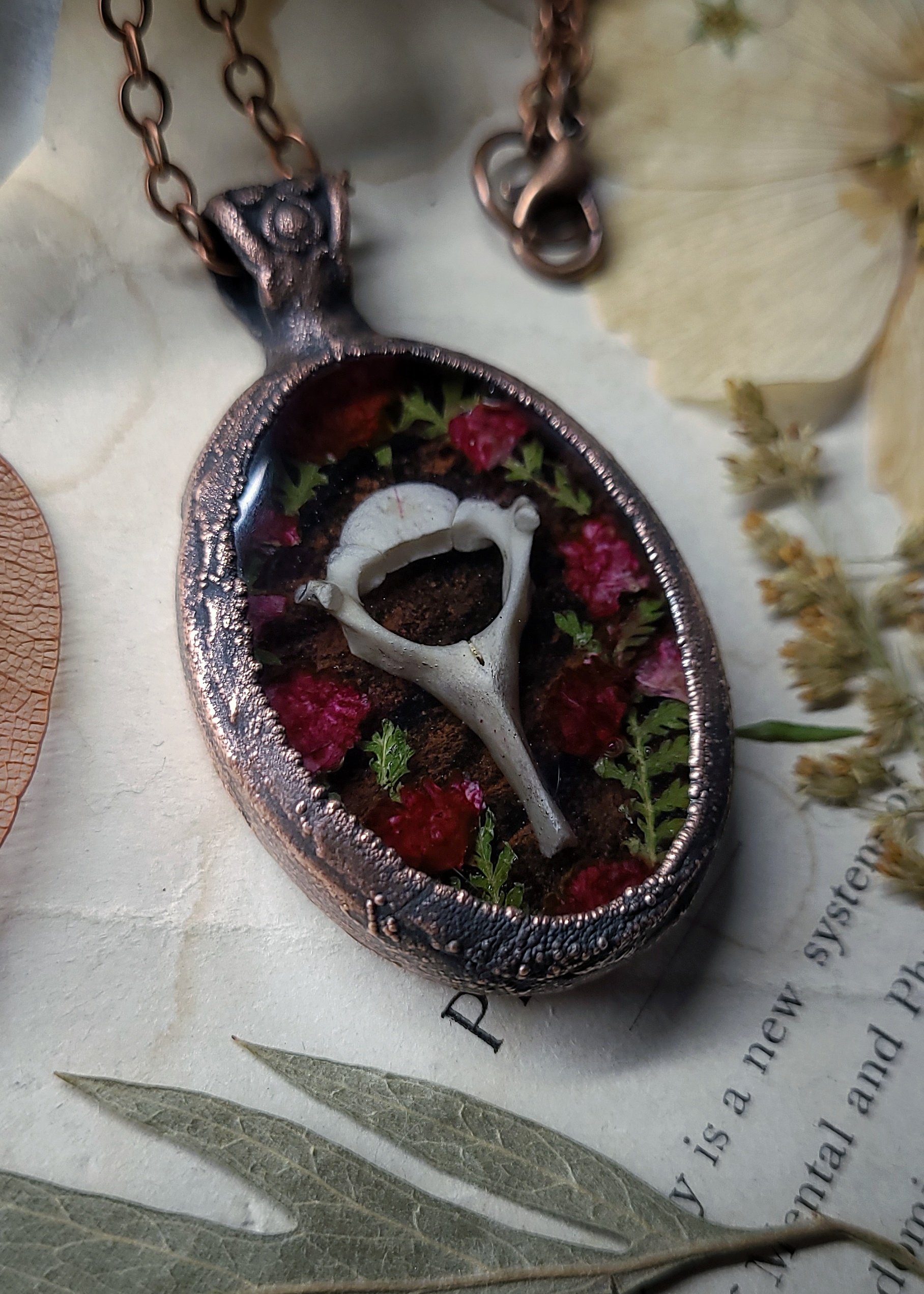 A small piglet vertebra bone is sealed in clear resin with dried red wildflowers and ferns on a shiny black and shimmery red background and framed in a thick and textured oxidized copper pendant.