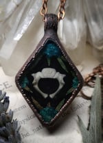 A small piglet vertebra bone is sealed in clear resin with dried blue wildflowers and ferns on a shiny black background and framed in a thick and textured oxidized copper pendant.