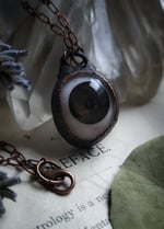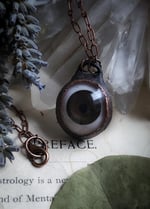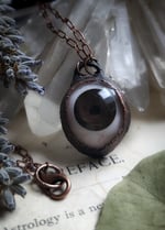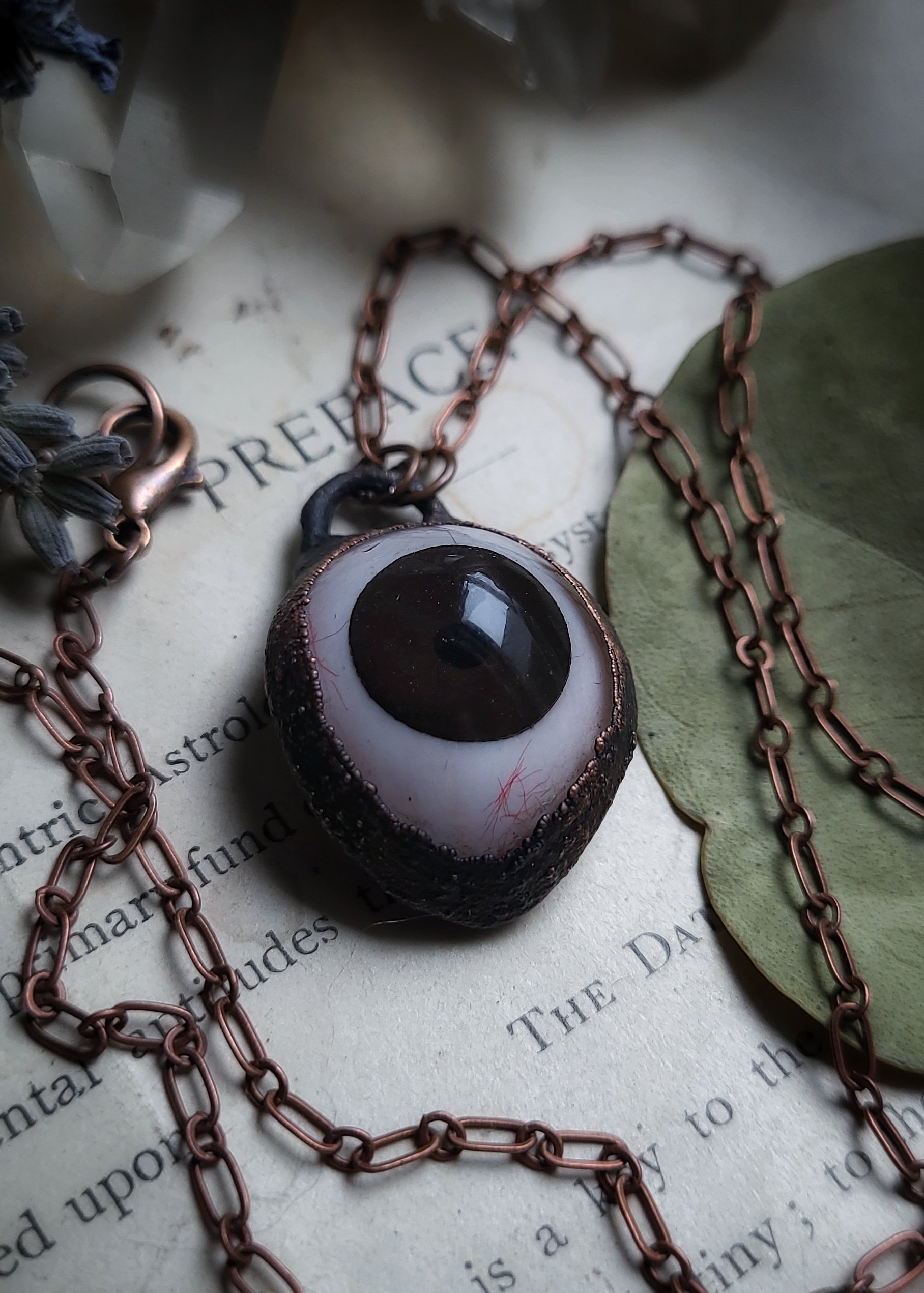 A dark brown acrylic prosthetic eye framed in textured and oxidized copper metal.