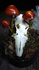 A large foraged and nature cleaned rabbit skull sits on a forest floor base of preserved soil, mosses, and ferns with hand sculpted and painted red and yellow mushrooms. Under glass dome with black cork base.