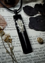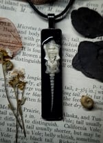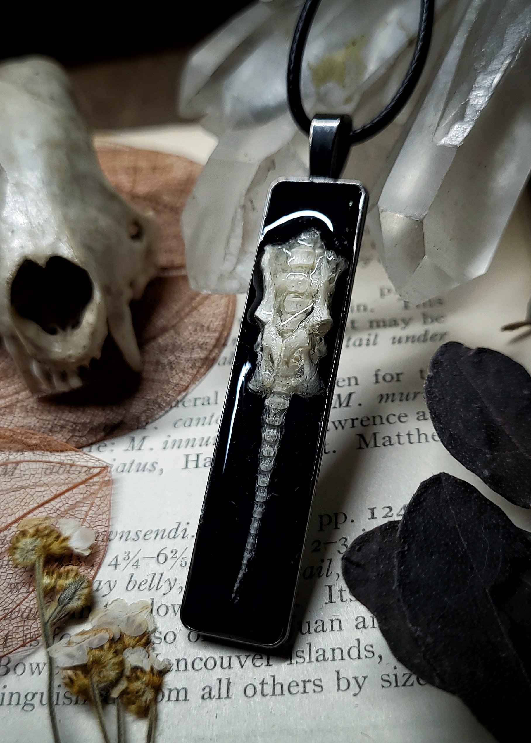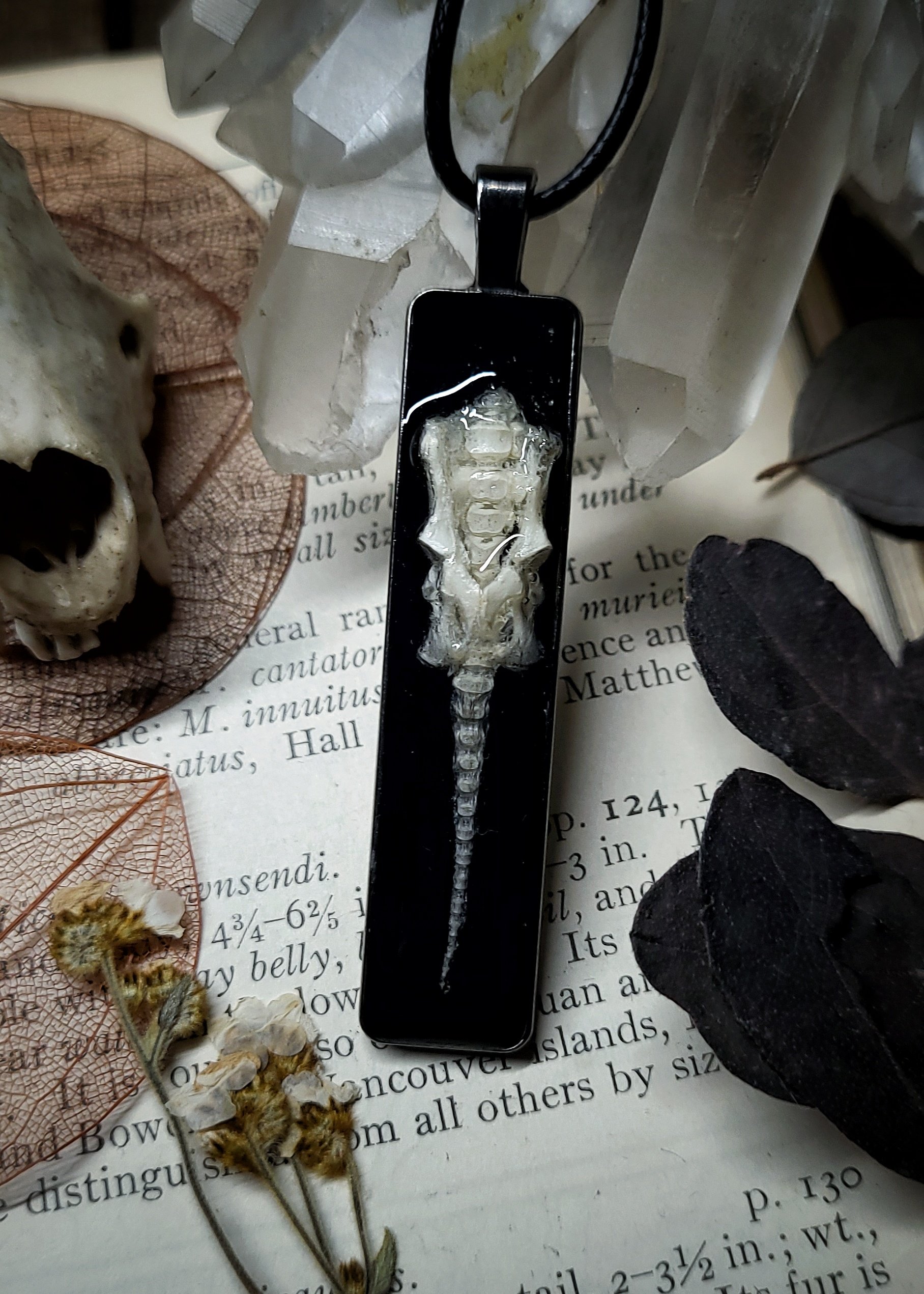 A real preserved fetal rabbit spine and pelvic bone is glazed under clear resin inside a silver brass pendant.