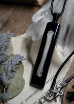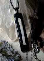 Pendant measures 60 mm x 12 mm and comes on a black waxed cord necklace in 18 inch length.