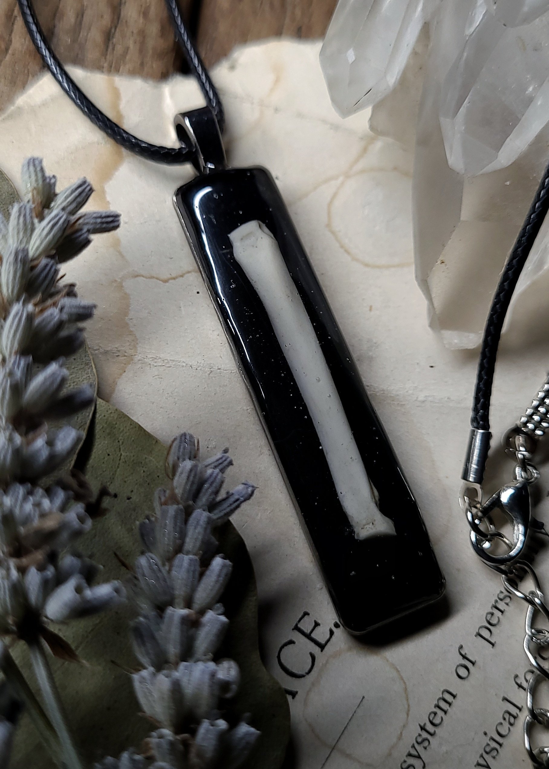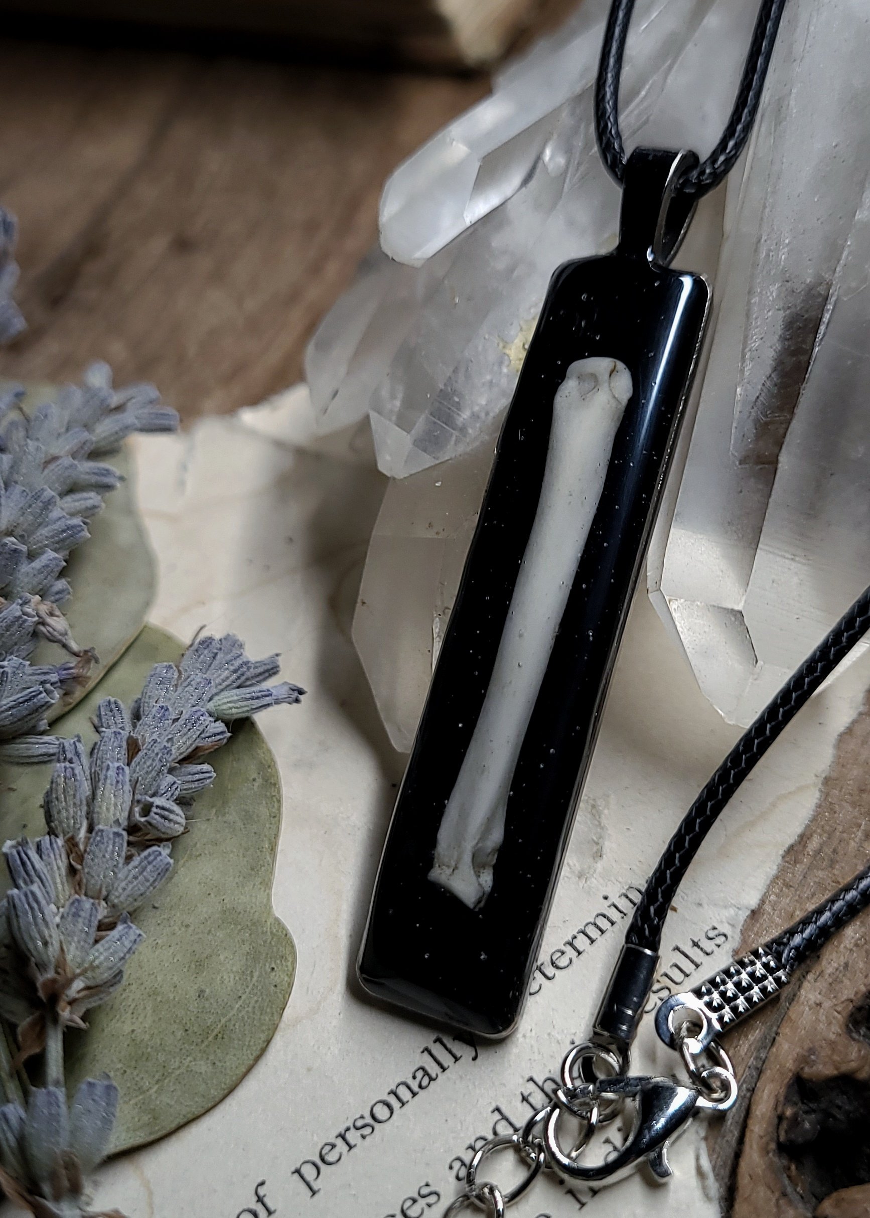 A single raccoon bone sealed under clear resin on a shiny black background inside of a silver brass pendant.