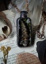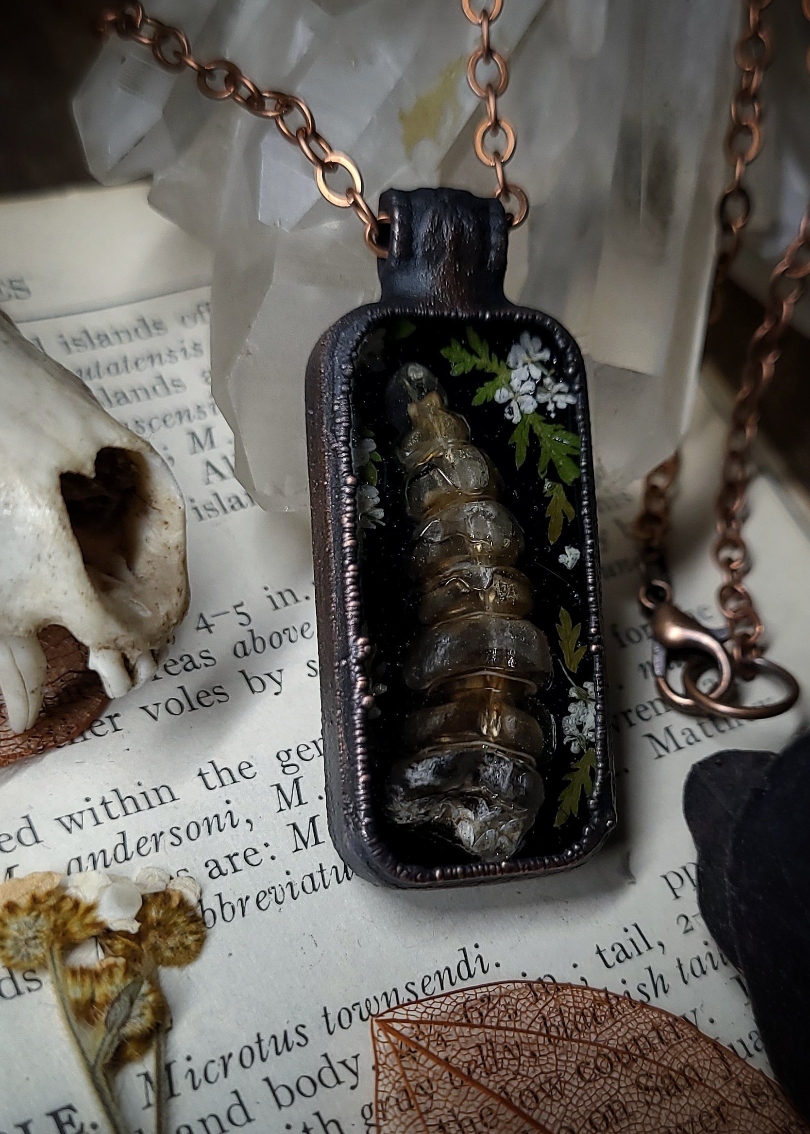 A preserved rattlesnake rattle and dried wildflowers are sealed under clear resin on a shiny black background and framed in thick and textured oxidized copper to last a lifetime.