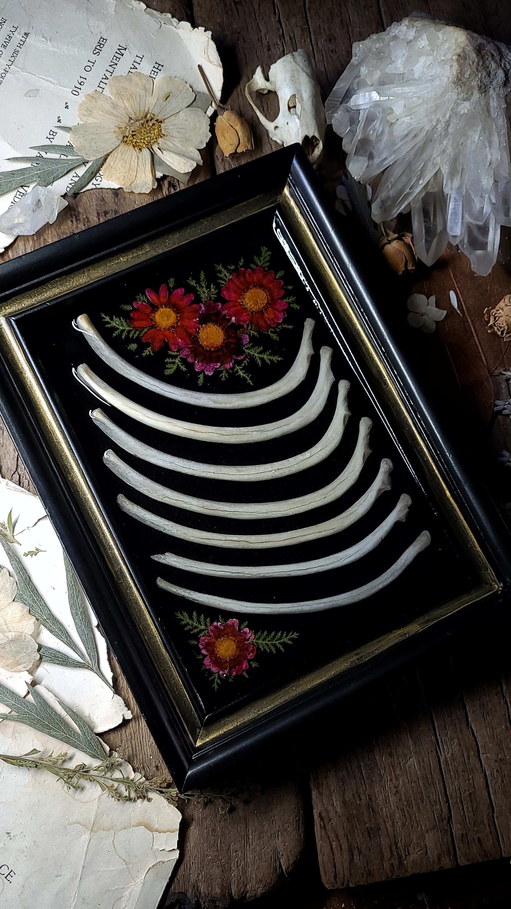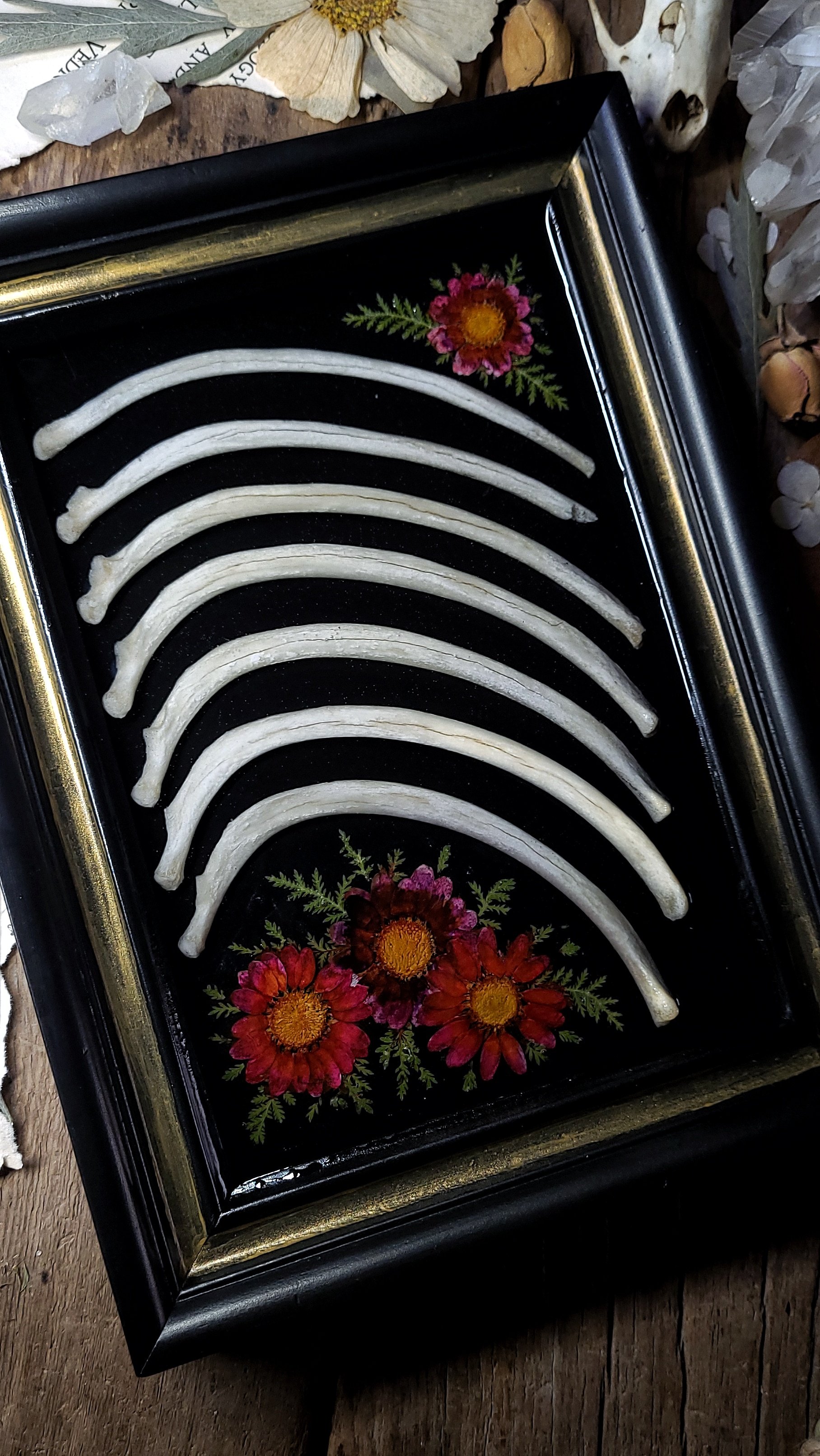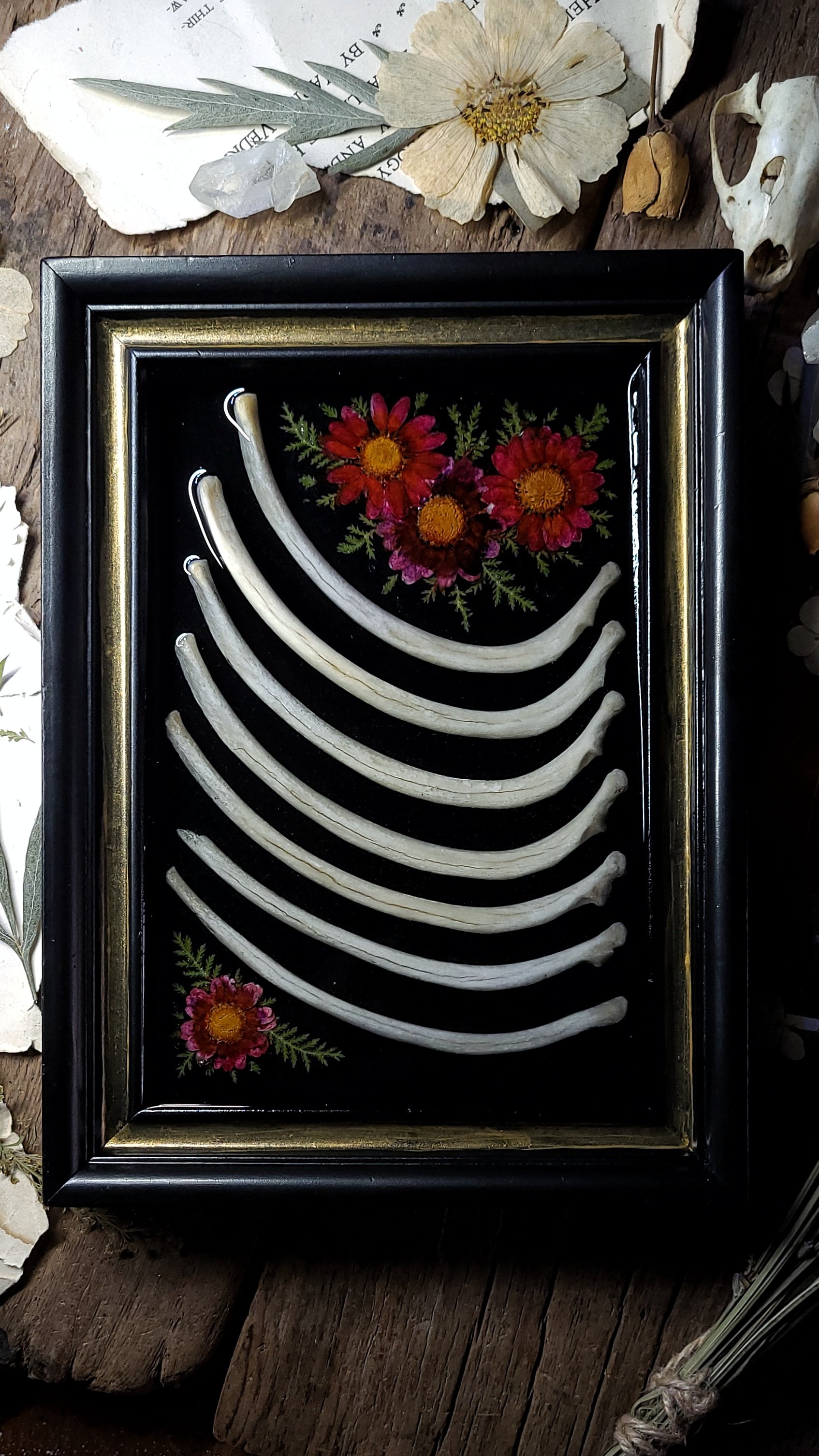 7 extra large raccoon rib bones on a shiny black background and surrounded by dried pressed red daisy flowers and ferns, sealed under clear resin with a few bones emerged in a rustic hand painted gold and black wall frame.
