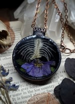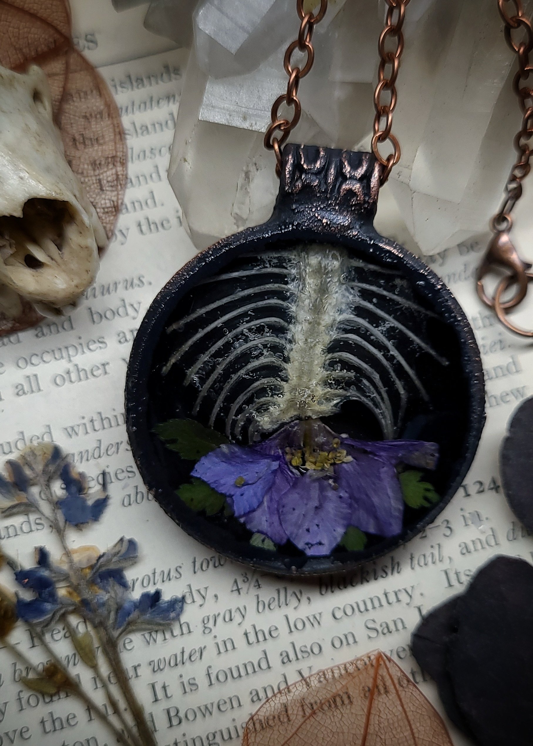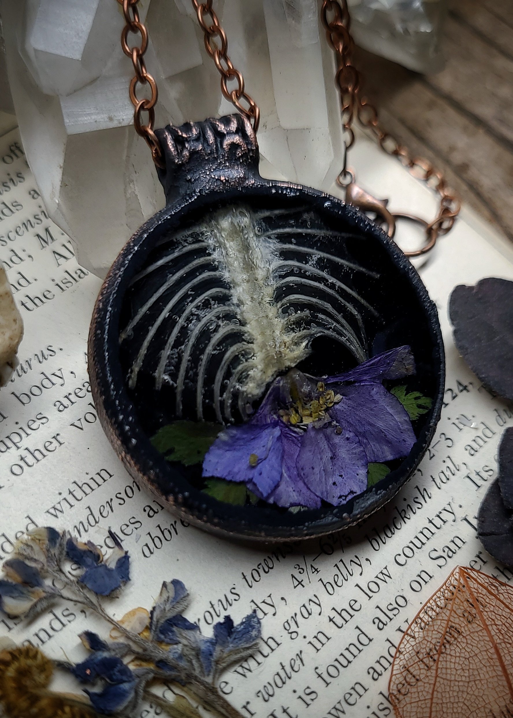 A small skeletal spine and rib bones from a mouse specimen are sealed in clear resin with large dried wildflower on a shiny black background and framed in a thick and textured oxidized copper pendant.