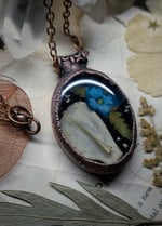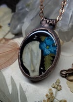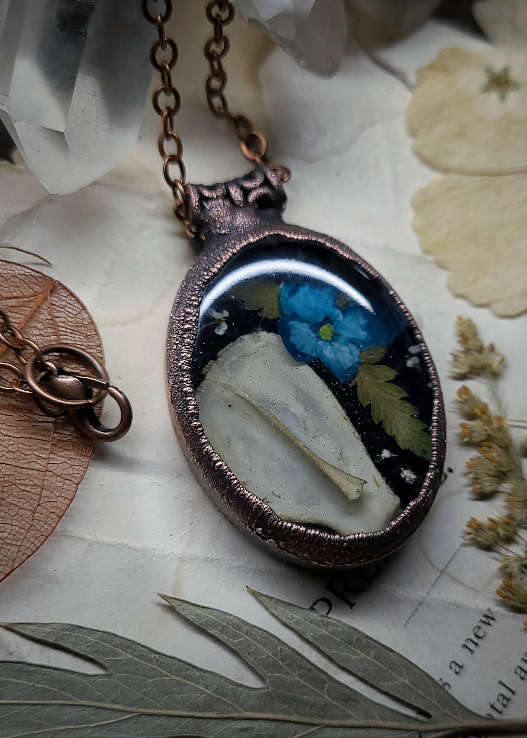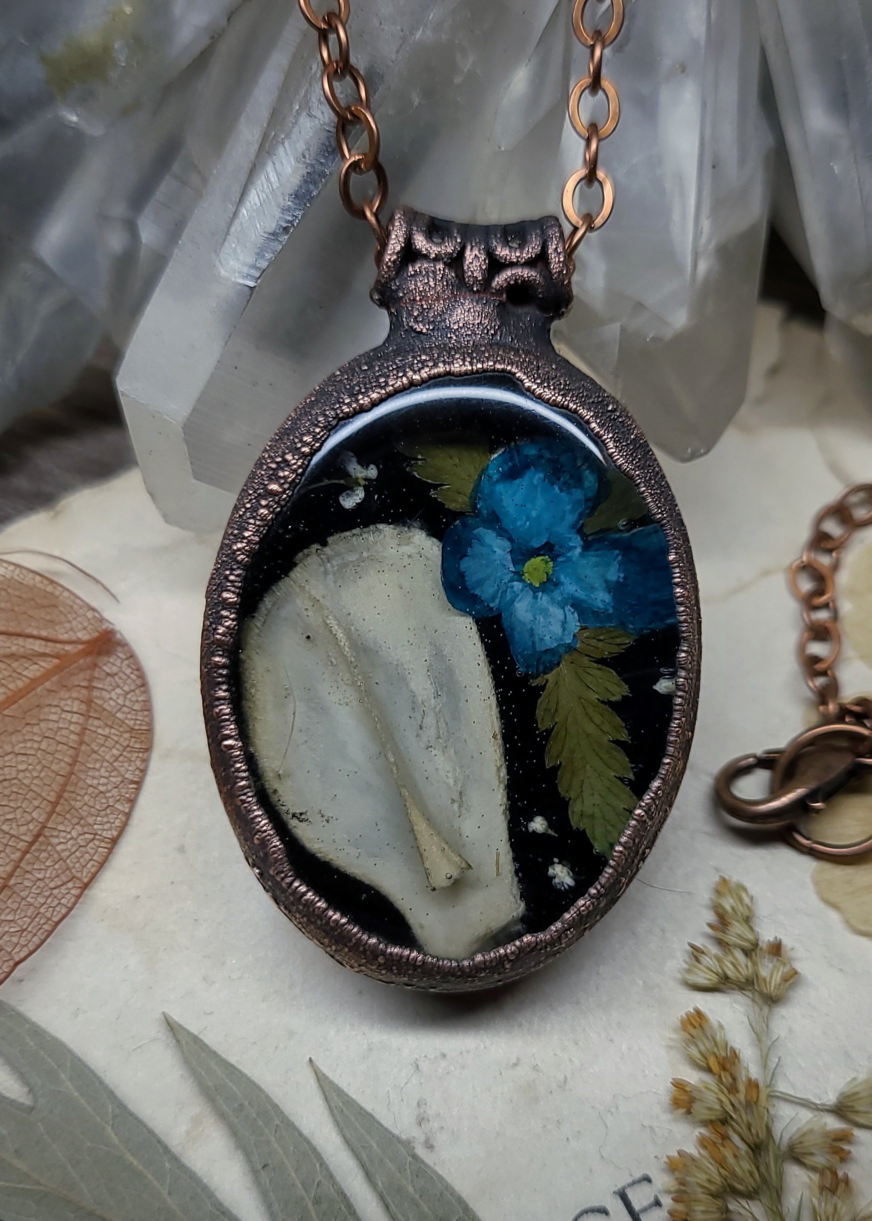 A small rabbit scapula bone is sealed in clear resin with dried wildflowers and ferns on a shiny black background and framed in a thick and textured oxidized copper pendant.