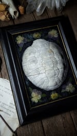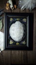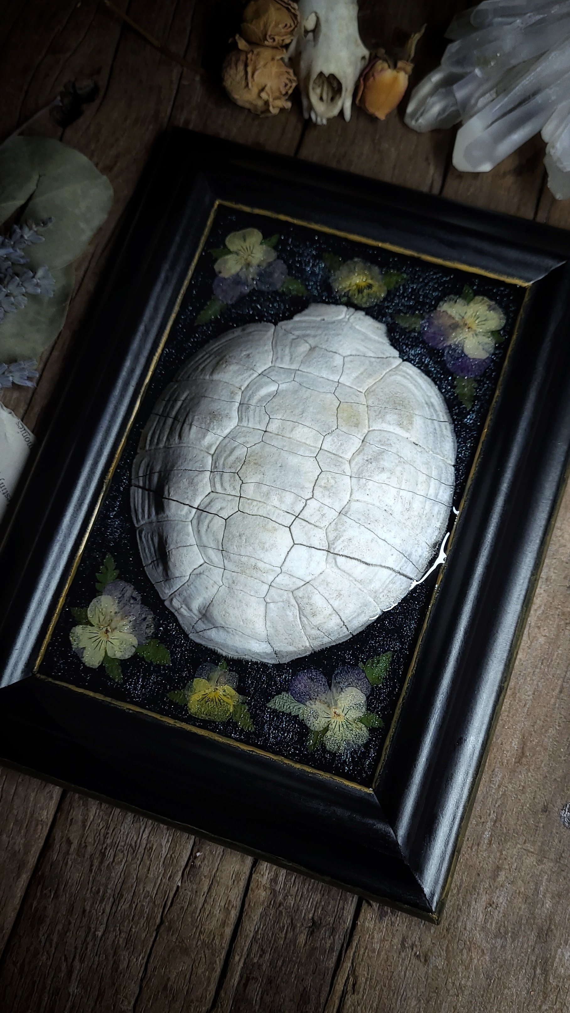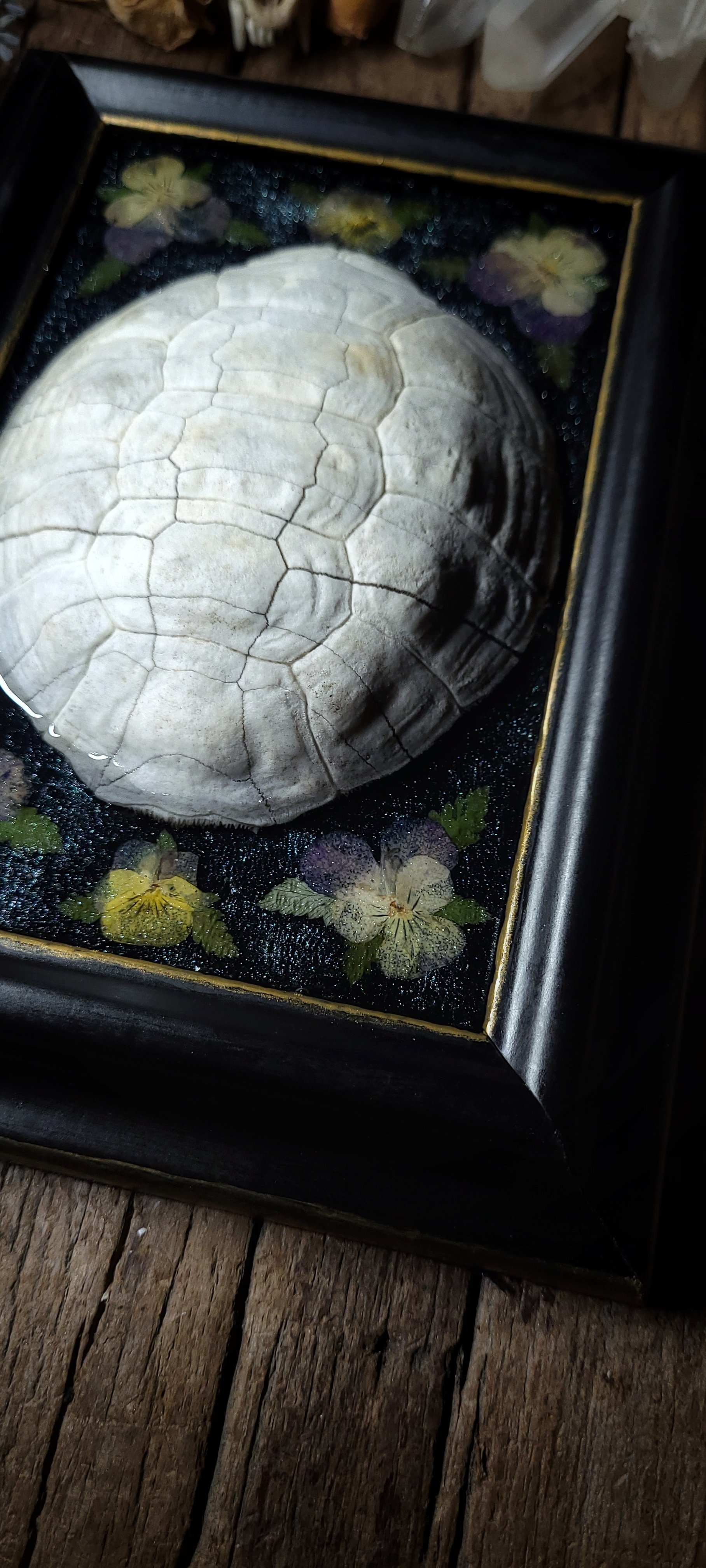 A articulated bone tortoise shell is surrounded by dried and pressed viola flowers on a shimmery black background that is sealed under clear resin with the shell raised above the resin with natural finish (degreased and lightly whitened but still has natural staining) on a vintage wall frame in black and brushed gold.
