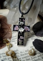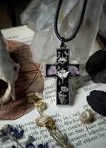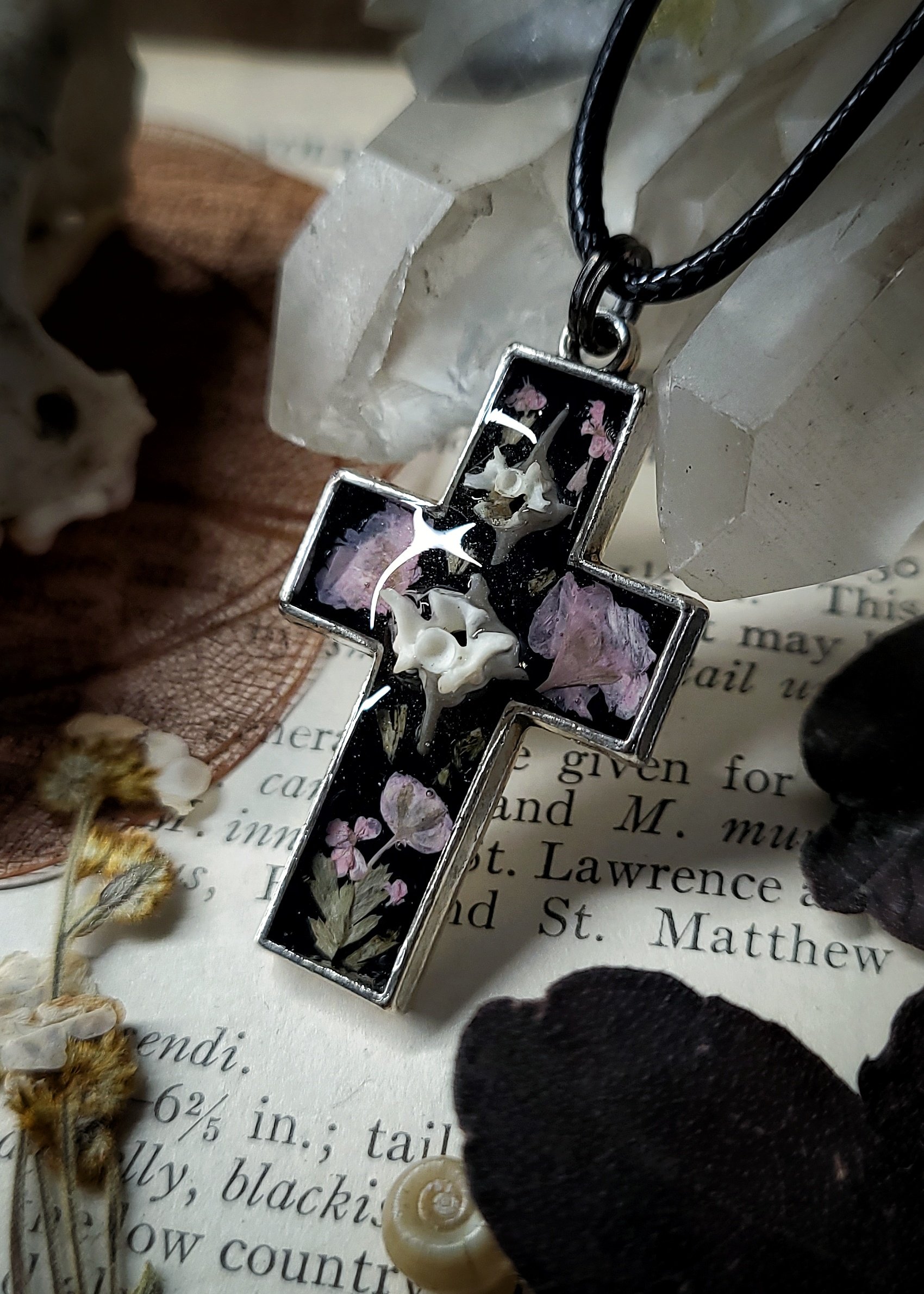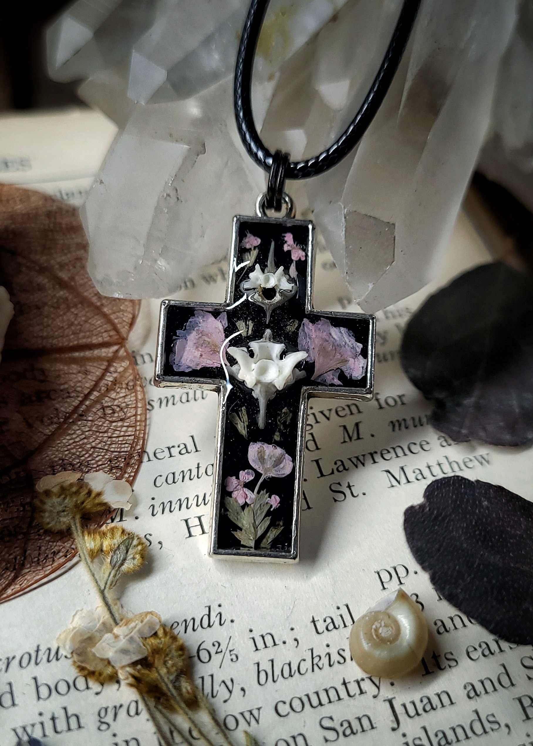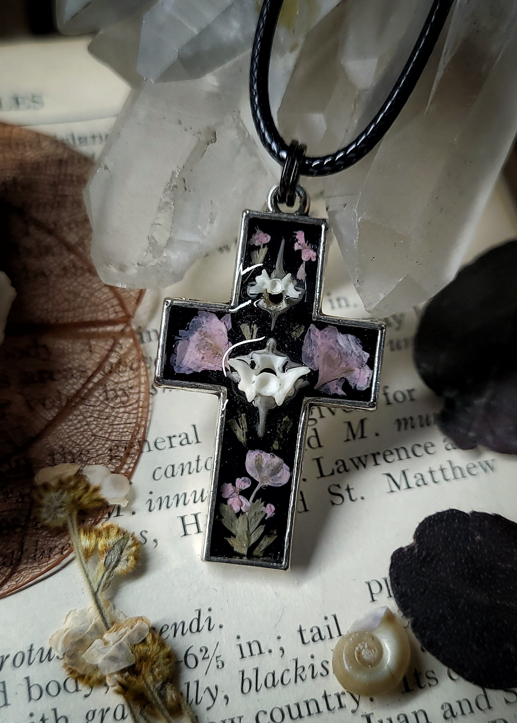 A pair of snake vertebrae bones are sealed with clear resin, partially protruding, inside of a silver brass cross shaped pendant on a shiny black background with pink wildflowers.