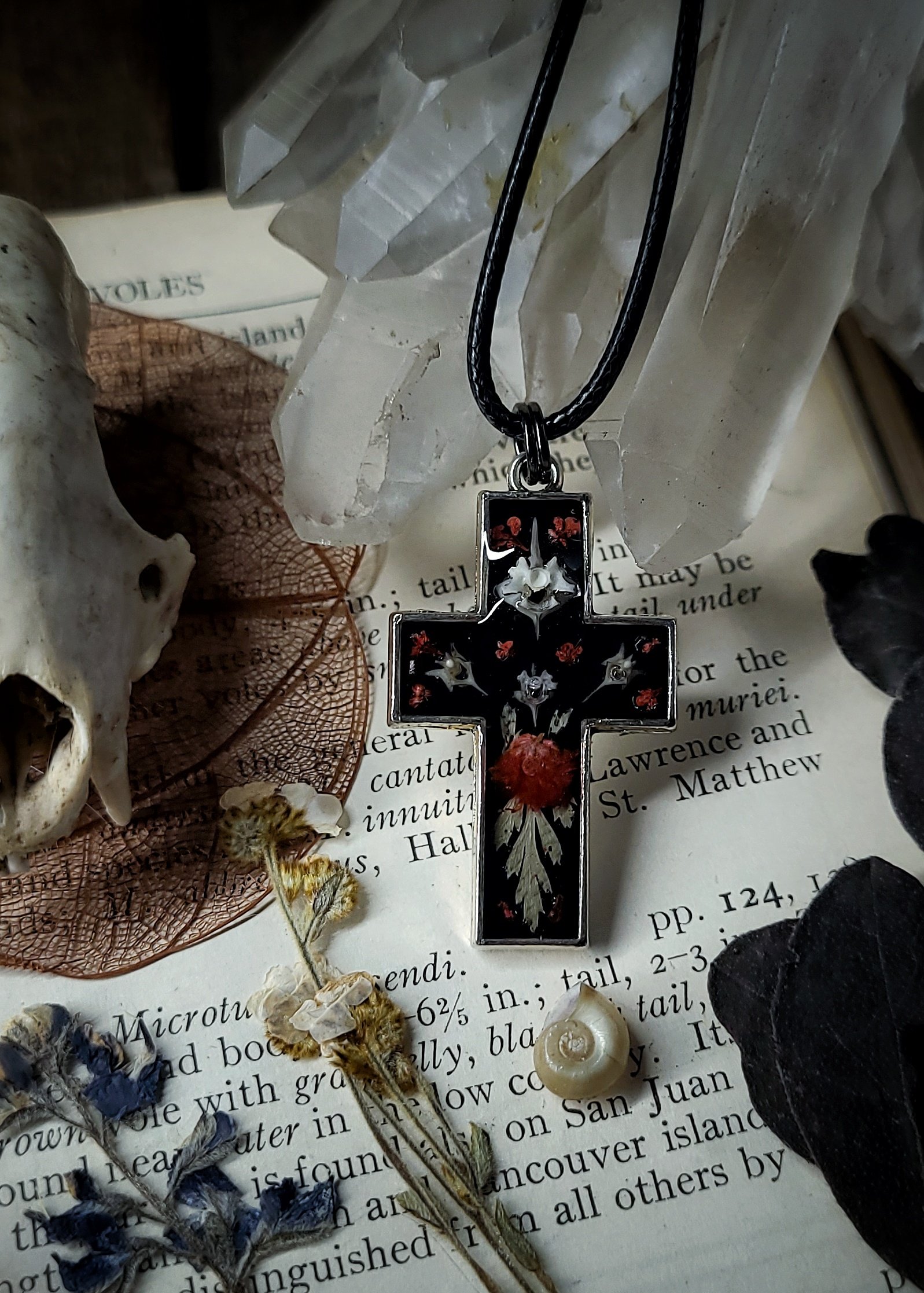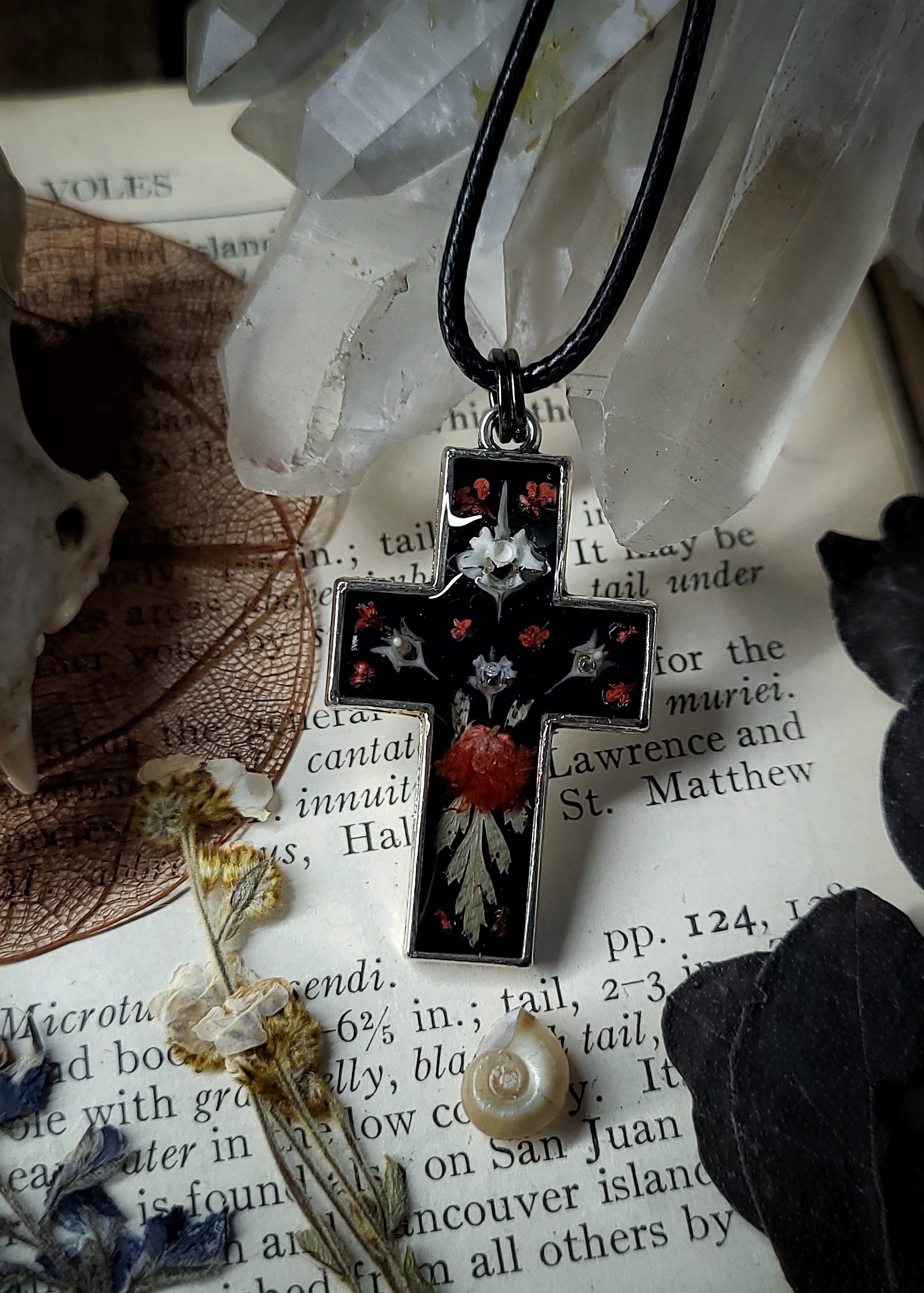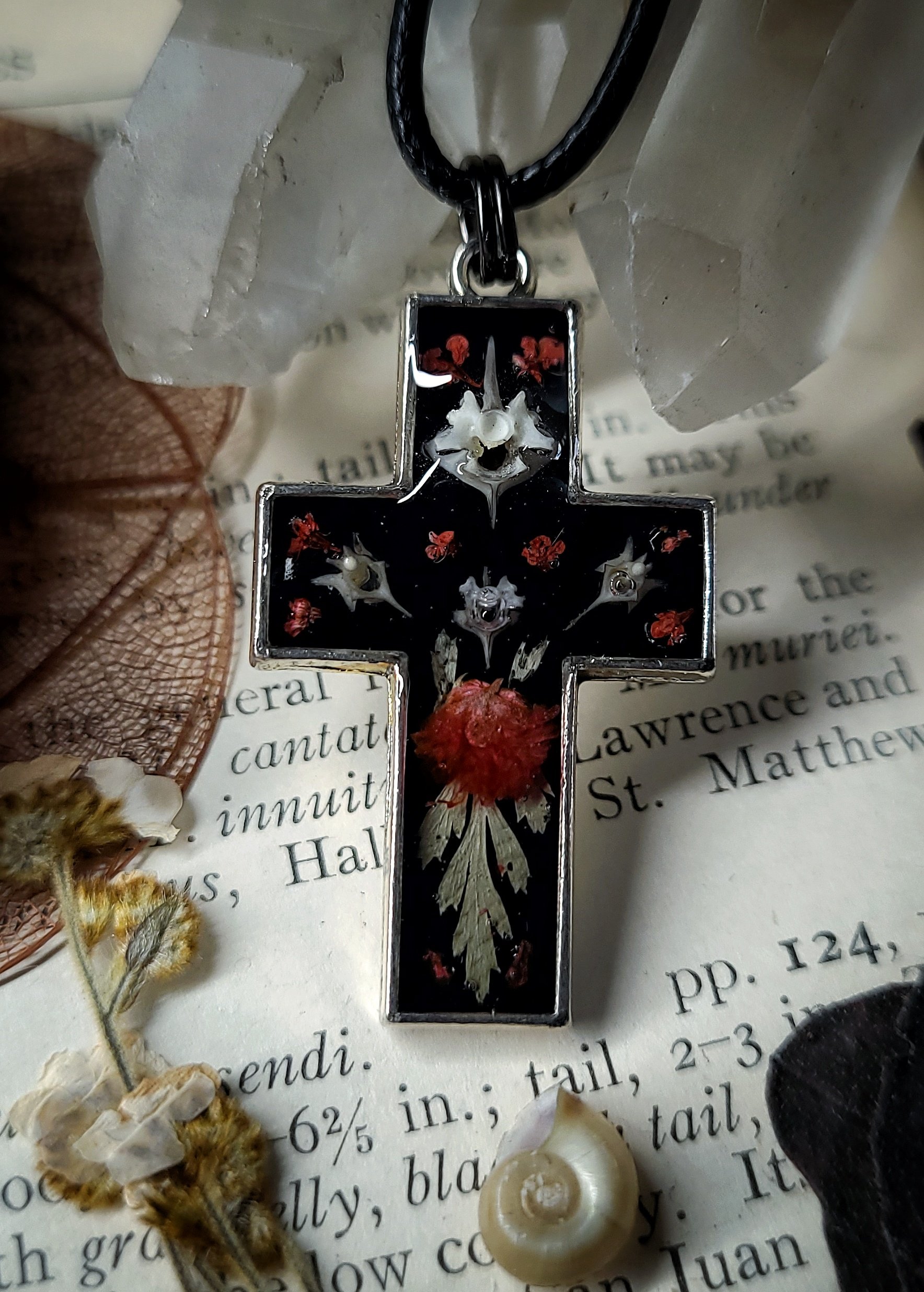 Multiple snake vertebrae bones are sealed with clear resin, partially protruding, inside of a silver brass cross shaped pendant on a shiny black background with red wildflowers.