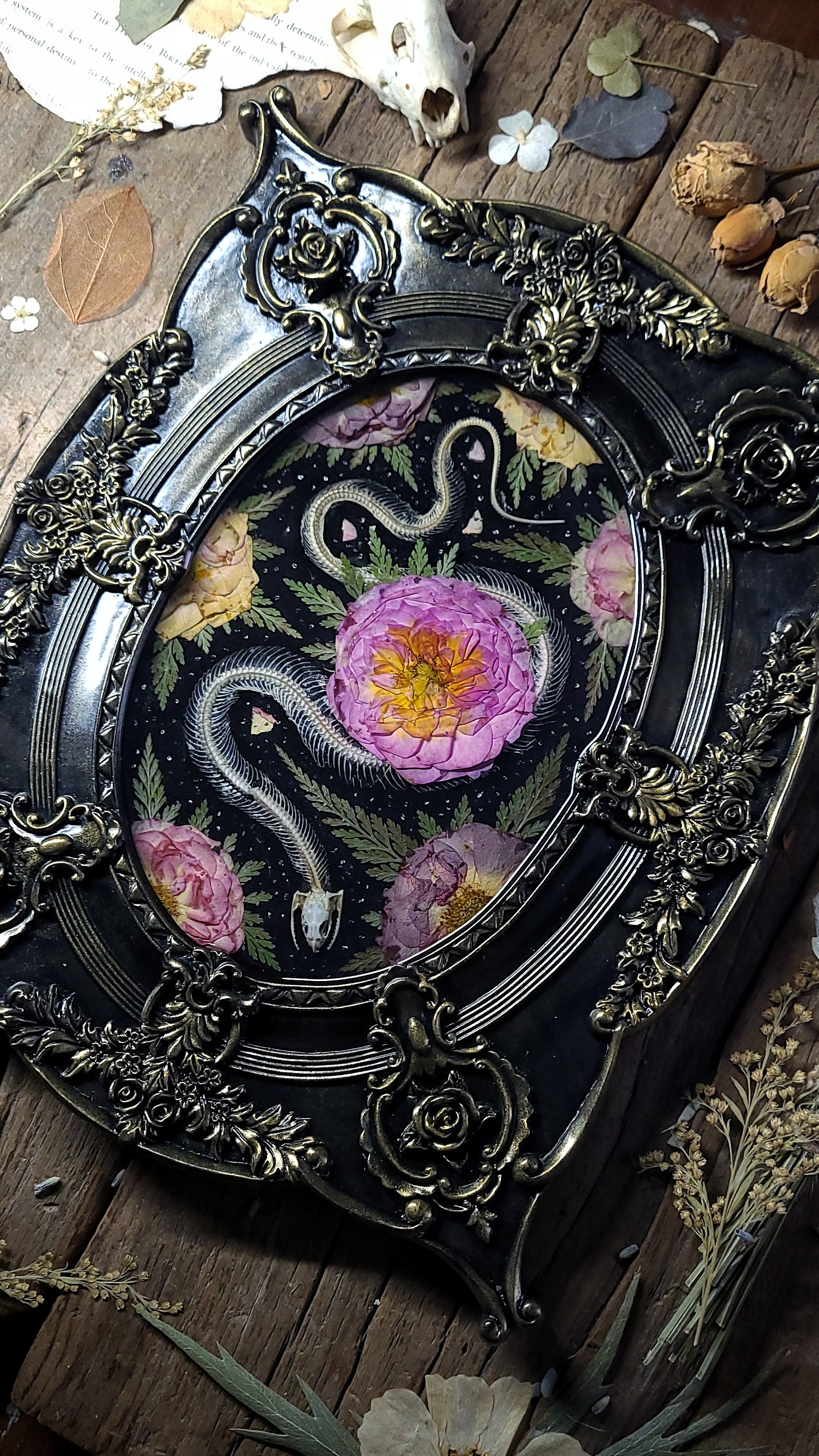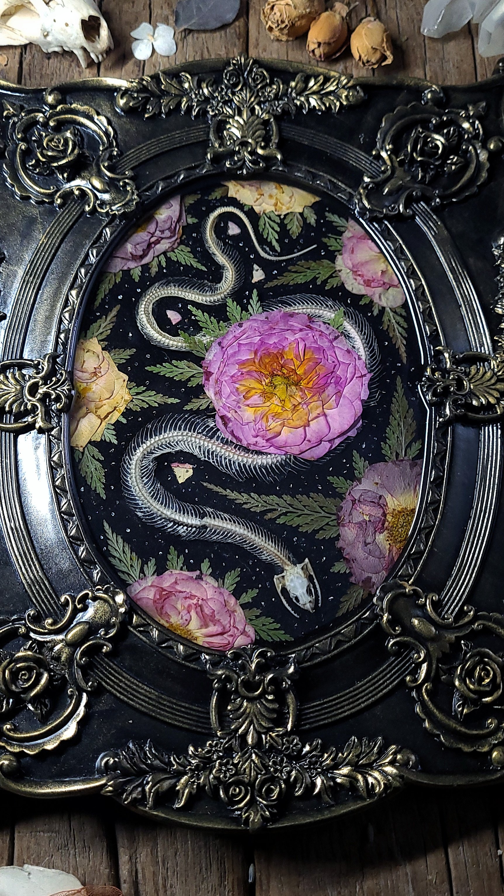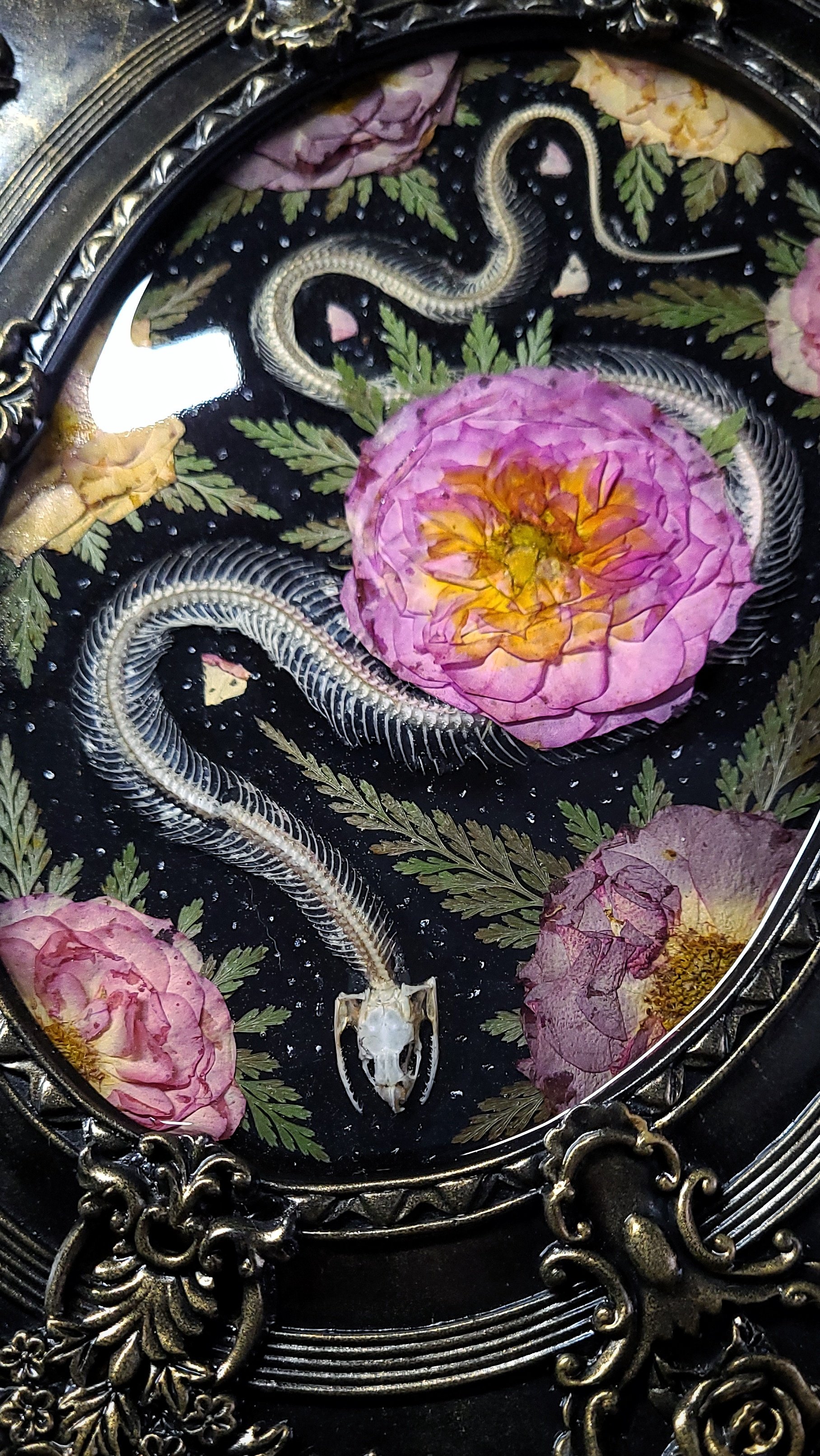 An articulated snake skeleton -processed from road casualty specimen with natural damage (such as small breaks in spine) surrounded by dried roses and ferns, sealed under clear resin in an ornate vintage wall frame in black and brushed gold.