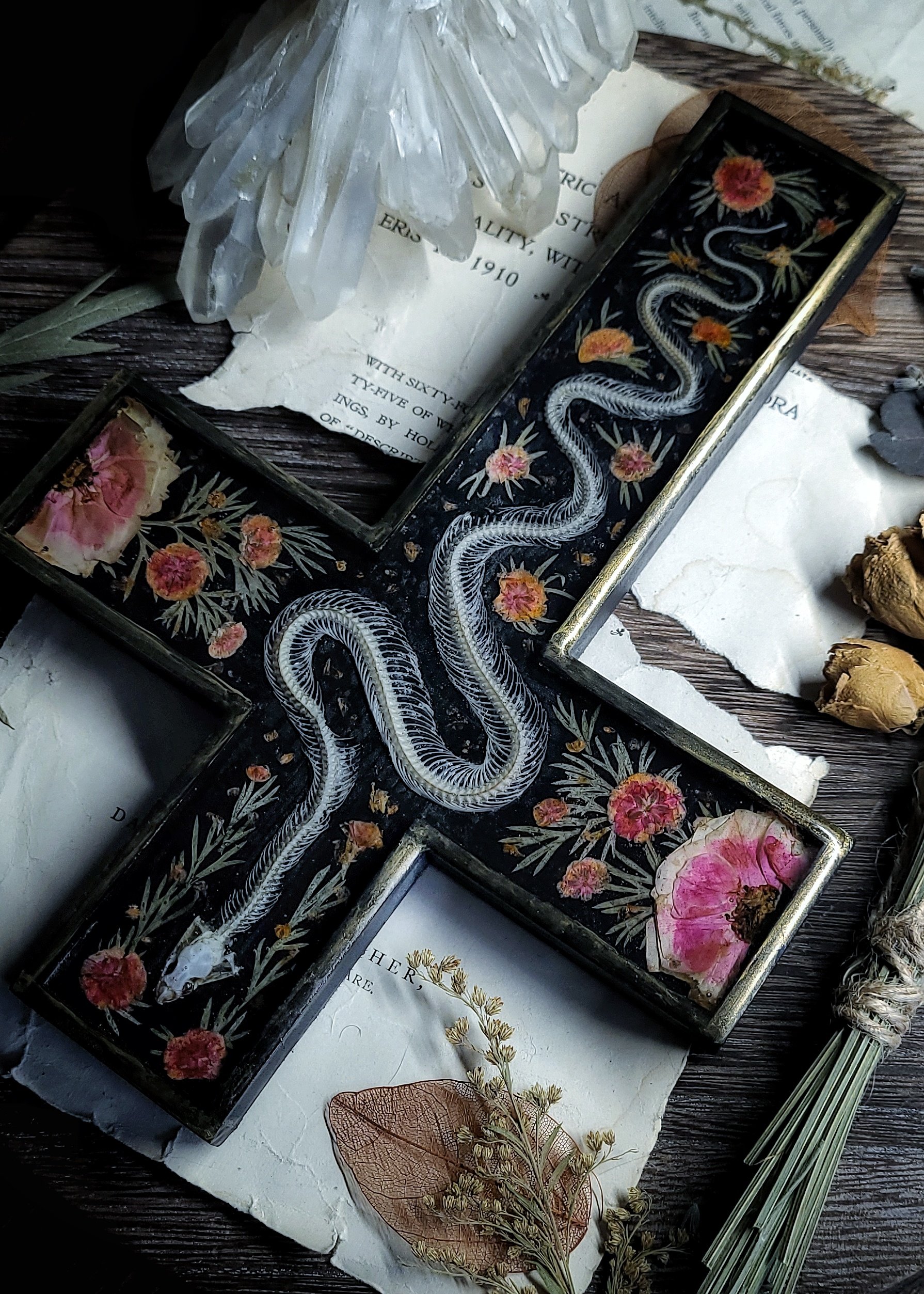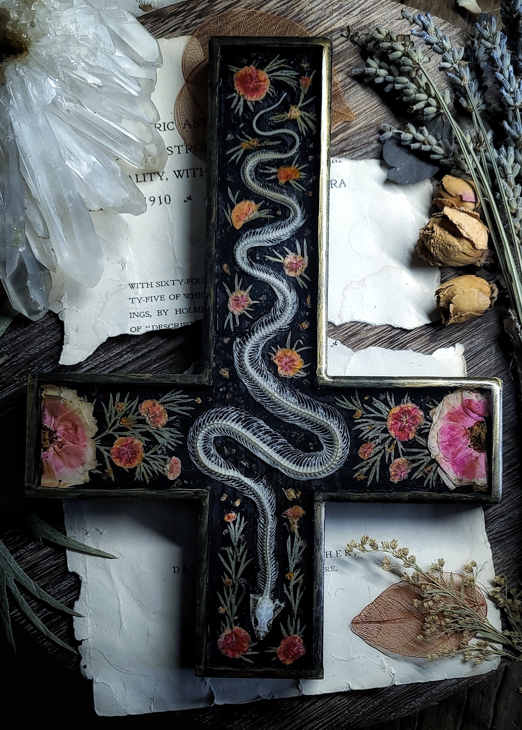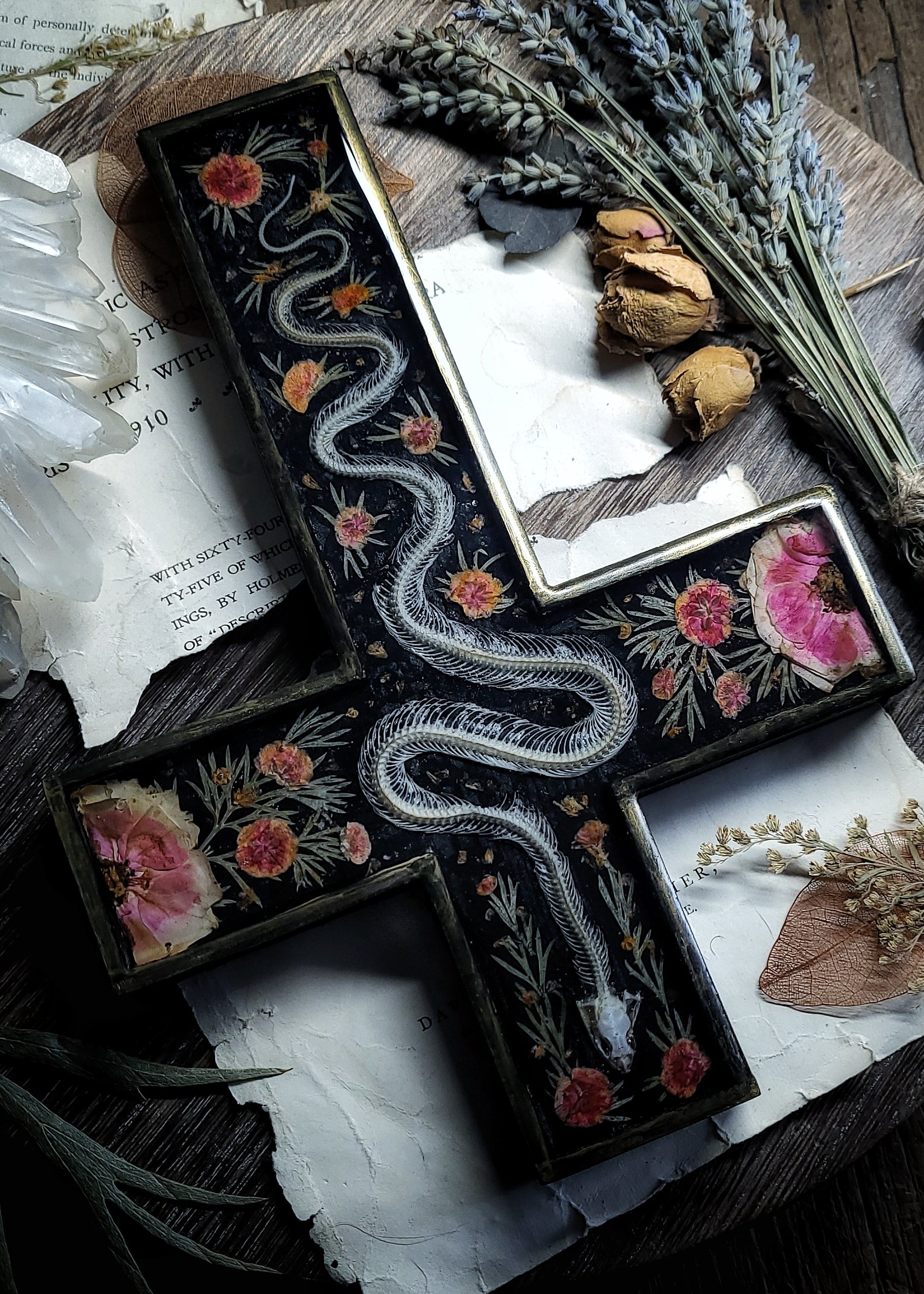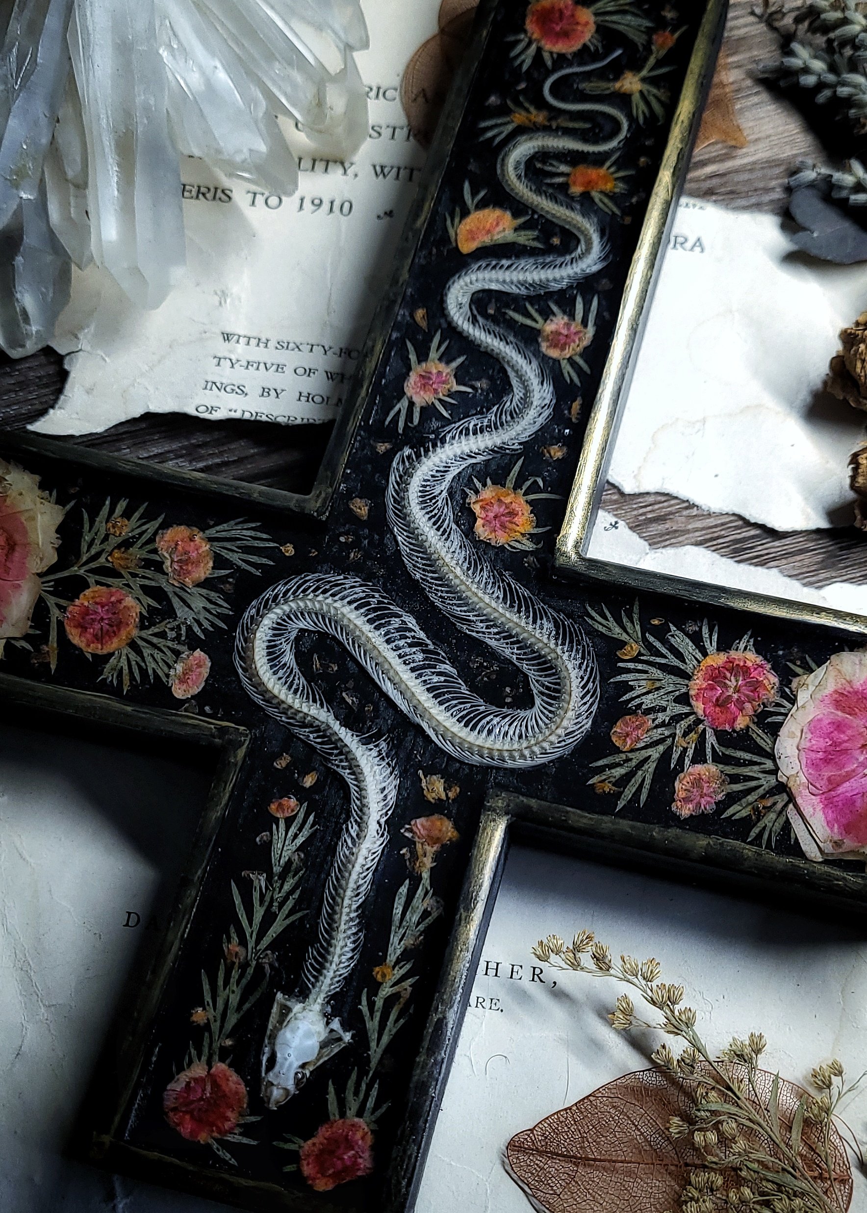 An articulated snake skeleton -processed from road casualty specimen with natural damage (such as broken or missing ribs) is surrounded by dried wildflowers and ferns, sealed under clear resin in a wooden wall cross in black and brushed gold.